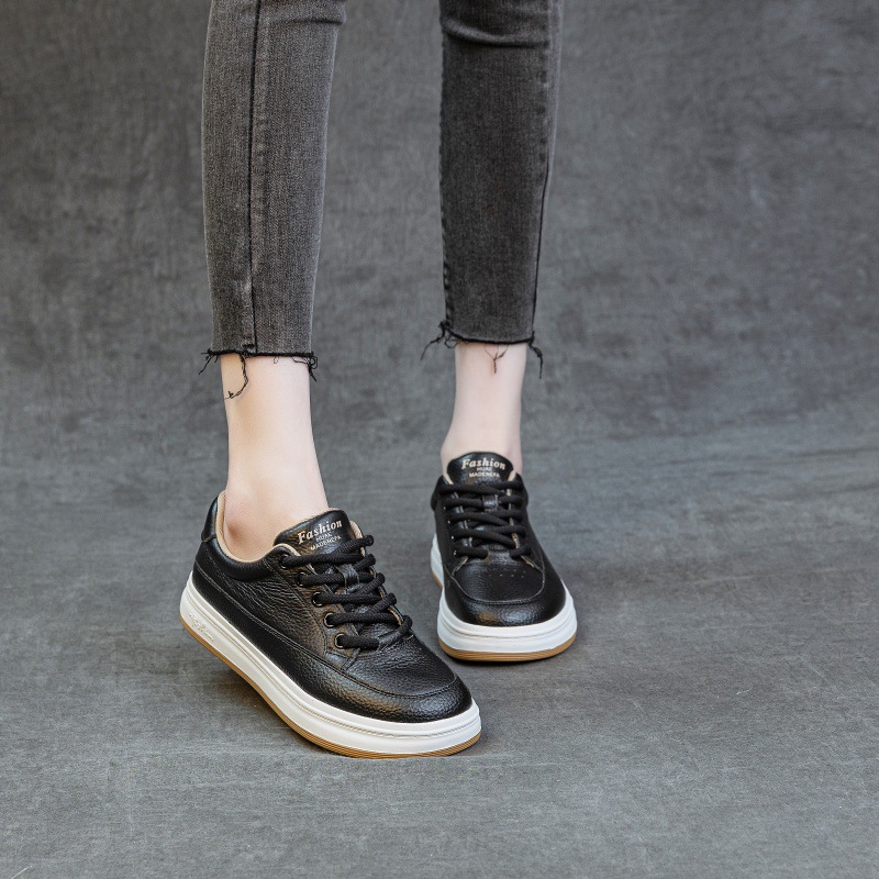 탑 레이어 Cowhide 편안한 플랫 화이트 신발 여성의 2025 봄 새로운 올 매치 캐주얼 보드 신발 라운드 토 레이스 업 신발스토어 가기
