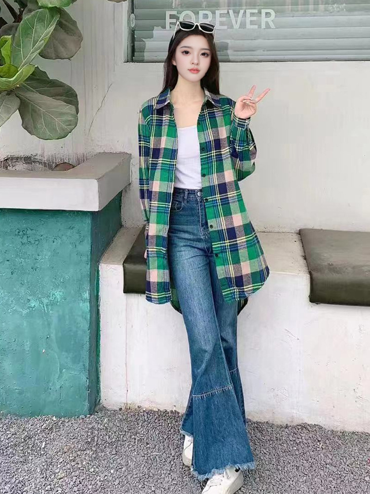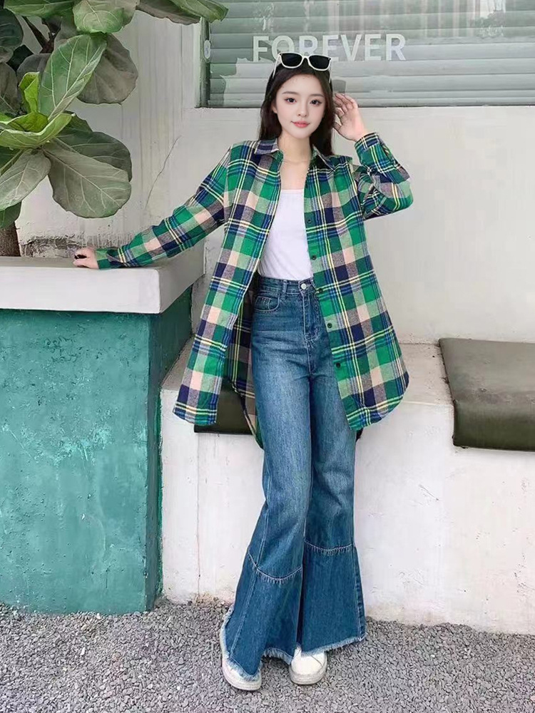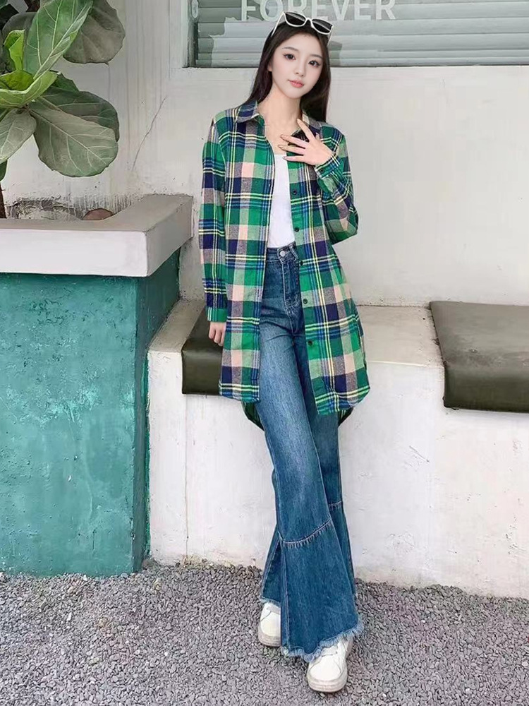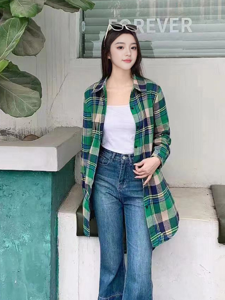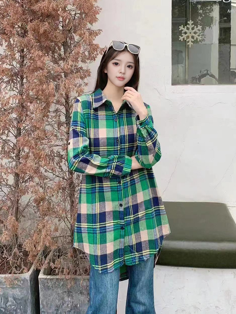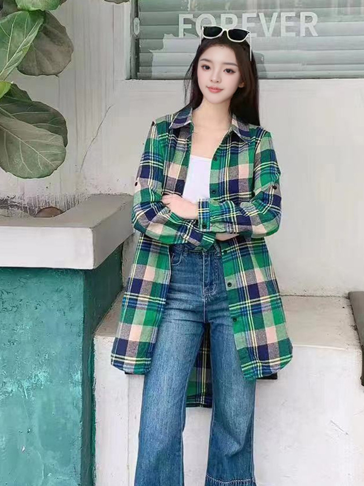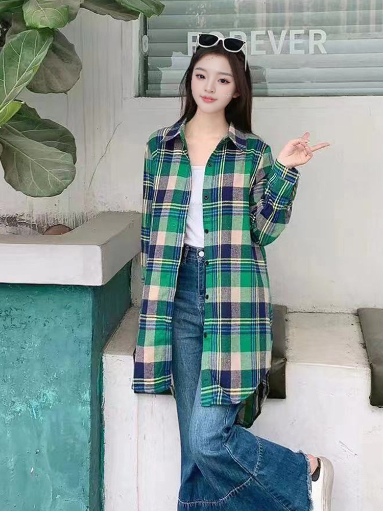 빈티지 체크 셔츠 여성용 중간 길이의 봄과 가을 얇은 코트 코튼 및 리넨 셔츠 긴 소매 느슨한 서양식 최고 디자인 감각