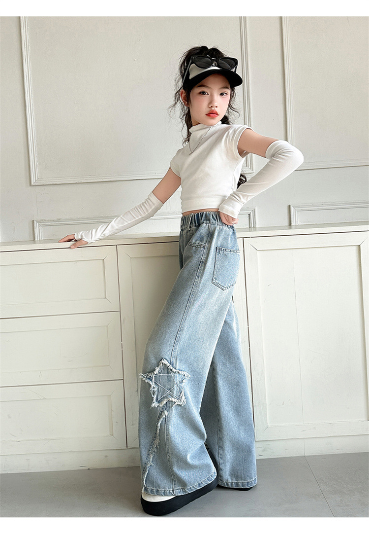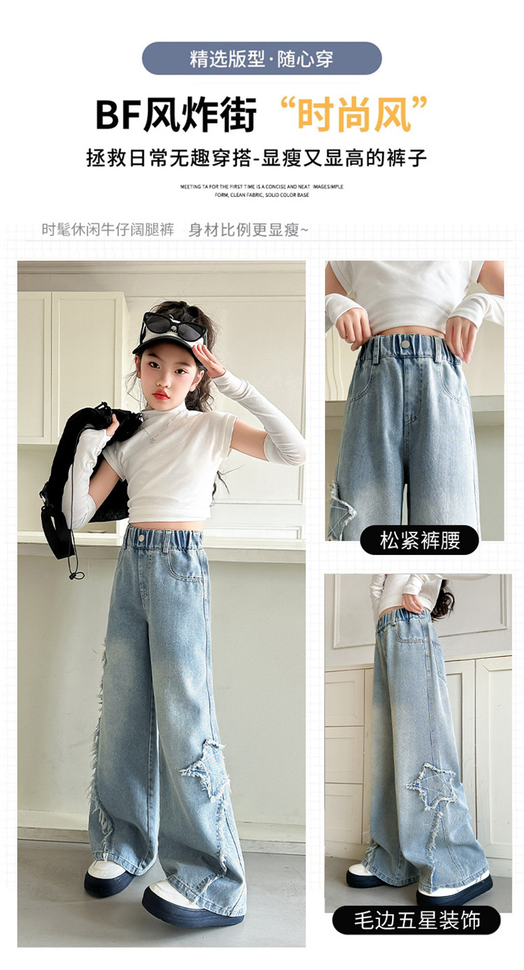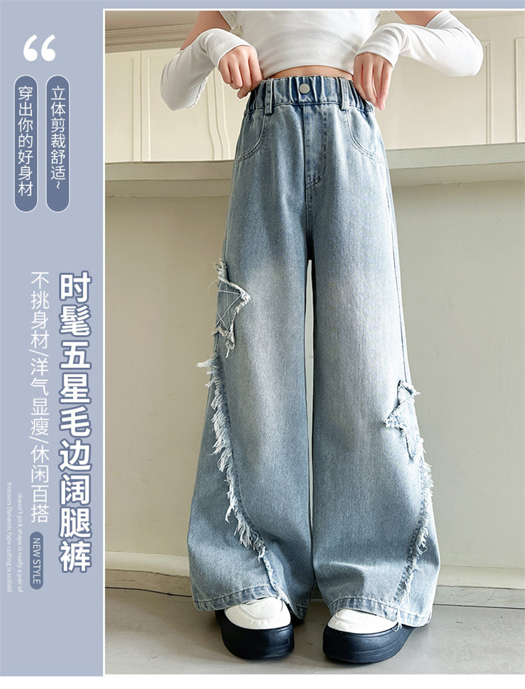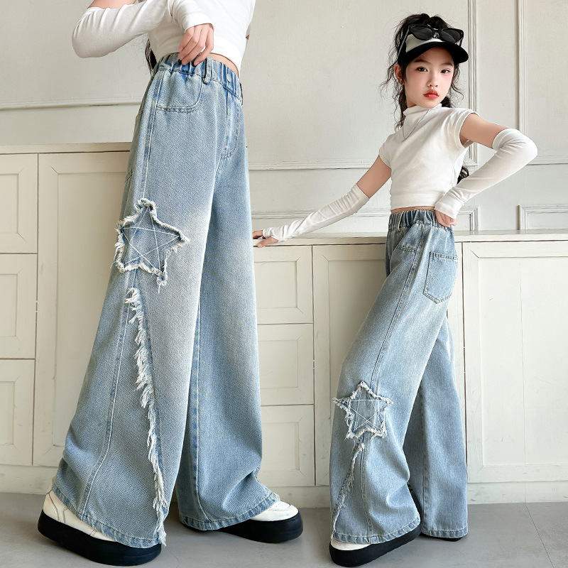 소녀 바지 봄과 가을 2025 새로운 서양식 어린이 캐주얼 데님 넓은 다리 바지 소녀 다섯개 별 스트레이트 바지스토어 가기