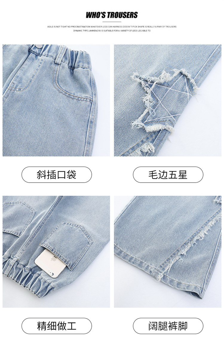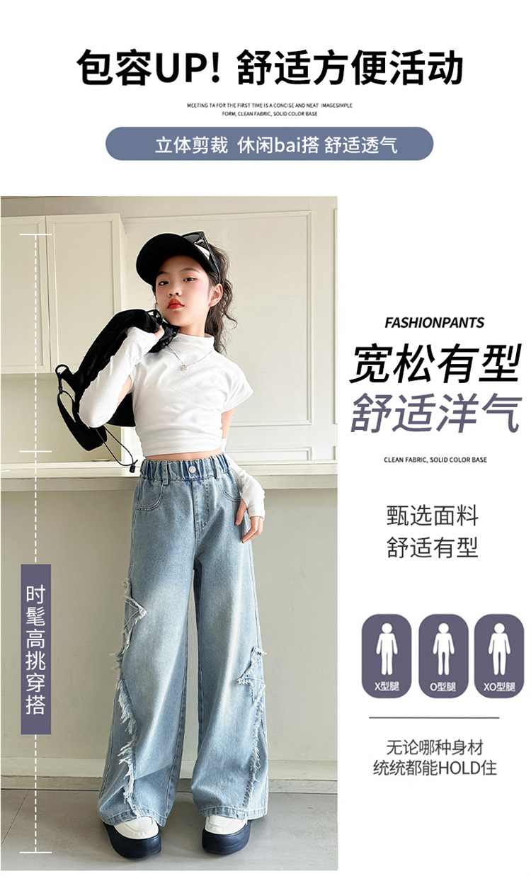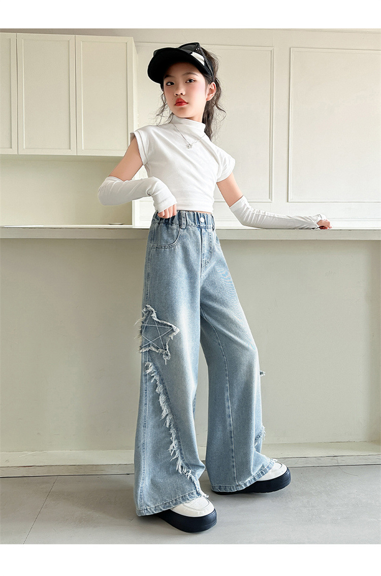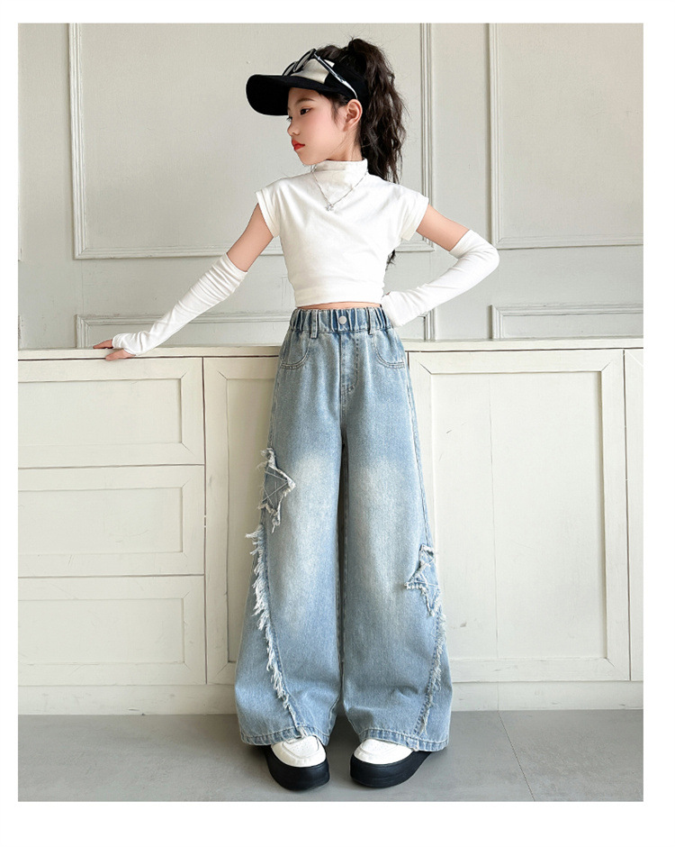 소녀 바지 봄과 가을 2025 새로운 서양식 어린이 캐주얼 데님 넓은 다리 바지 소녀 다섯개 별 스트레이트 바지스토어 가기