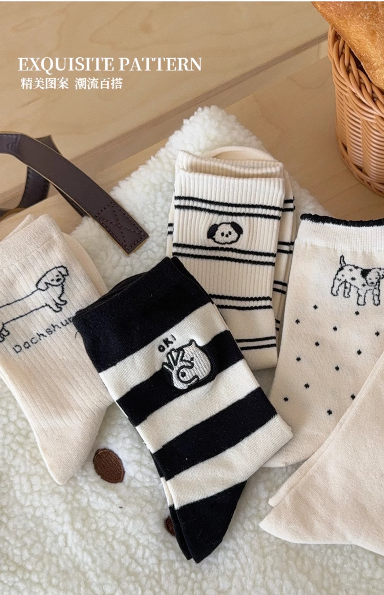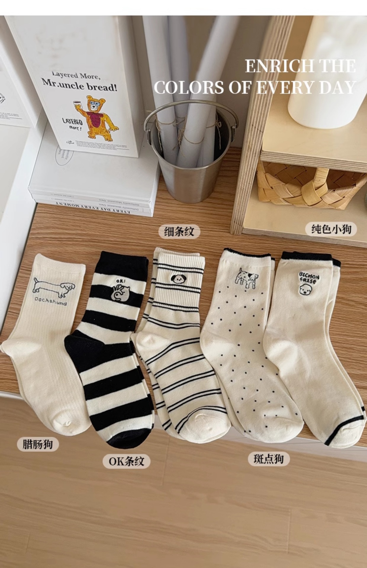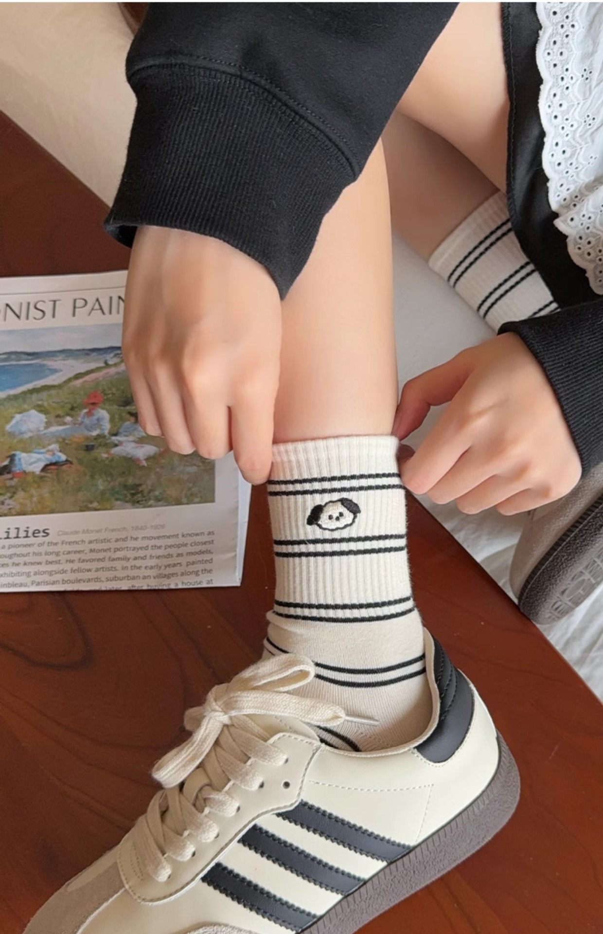 여성용 만화 강아지 양말, 여름용 귀여운 종아리 중간 양말, 순면, 트렌디한 인터넷 연예인, 여름용 여성용 한국 줄무늬 스타킹스토어 가기