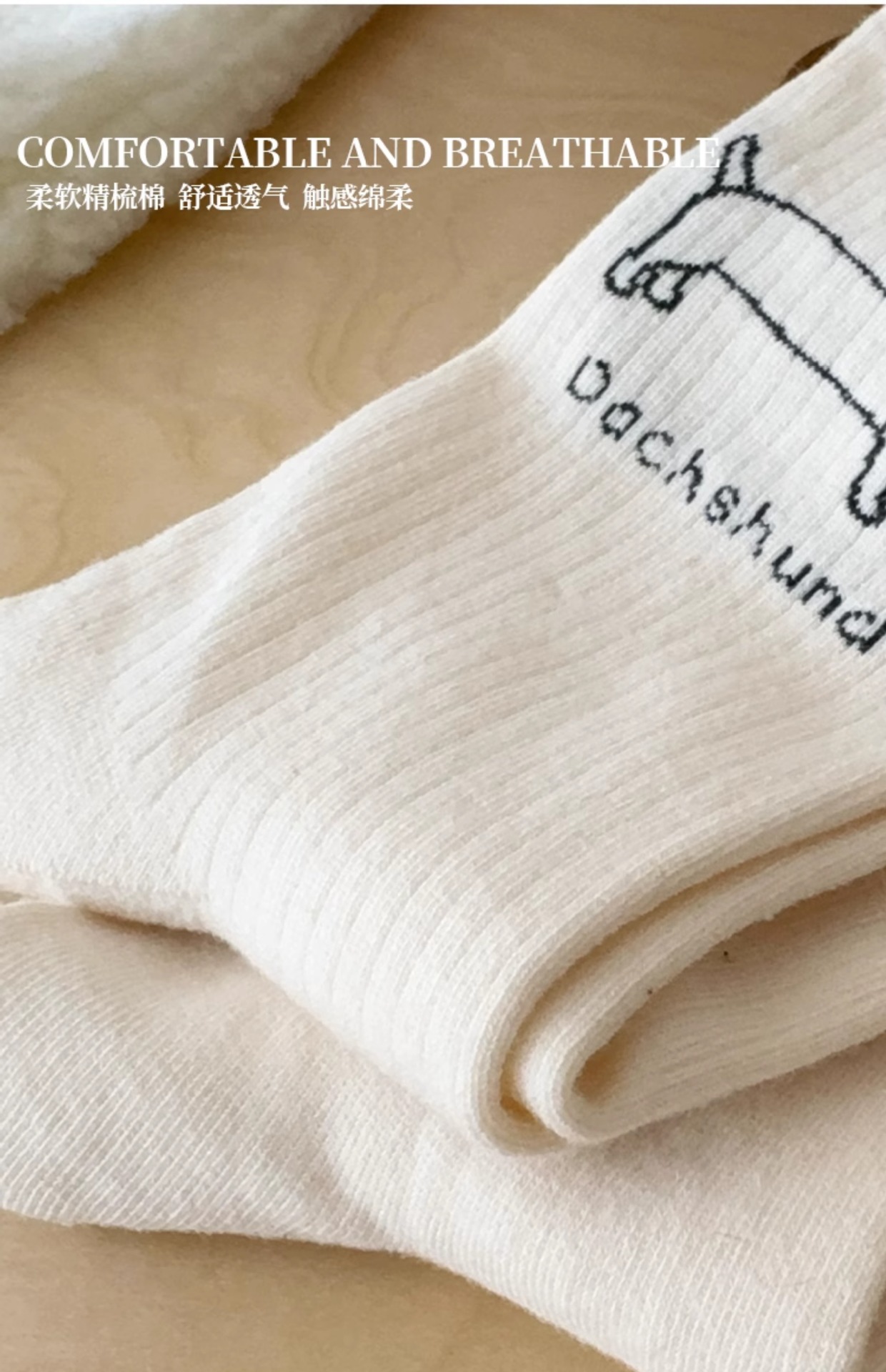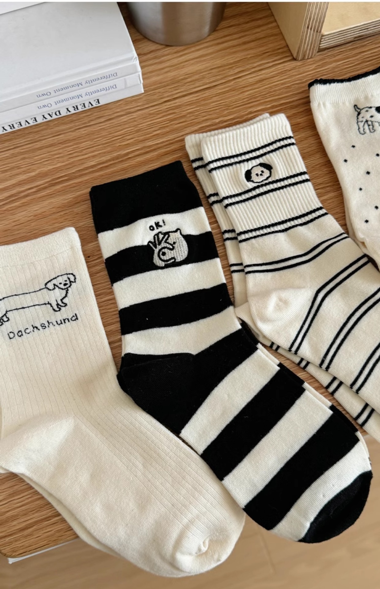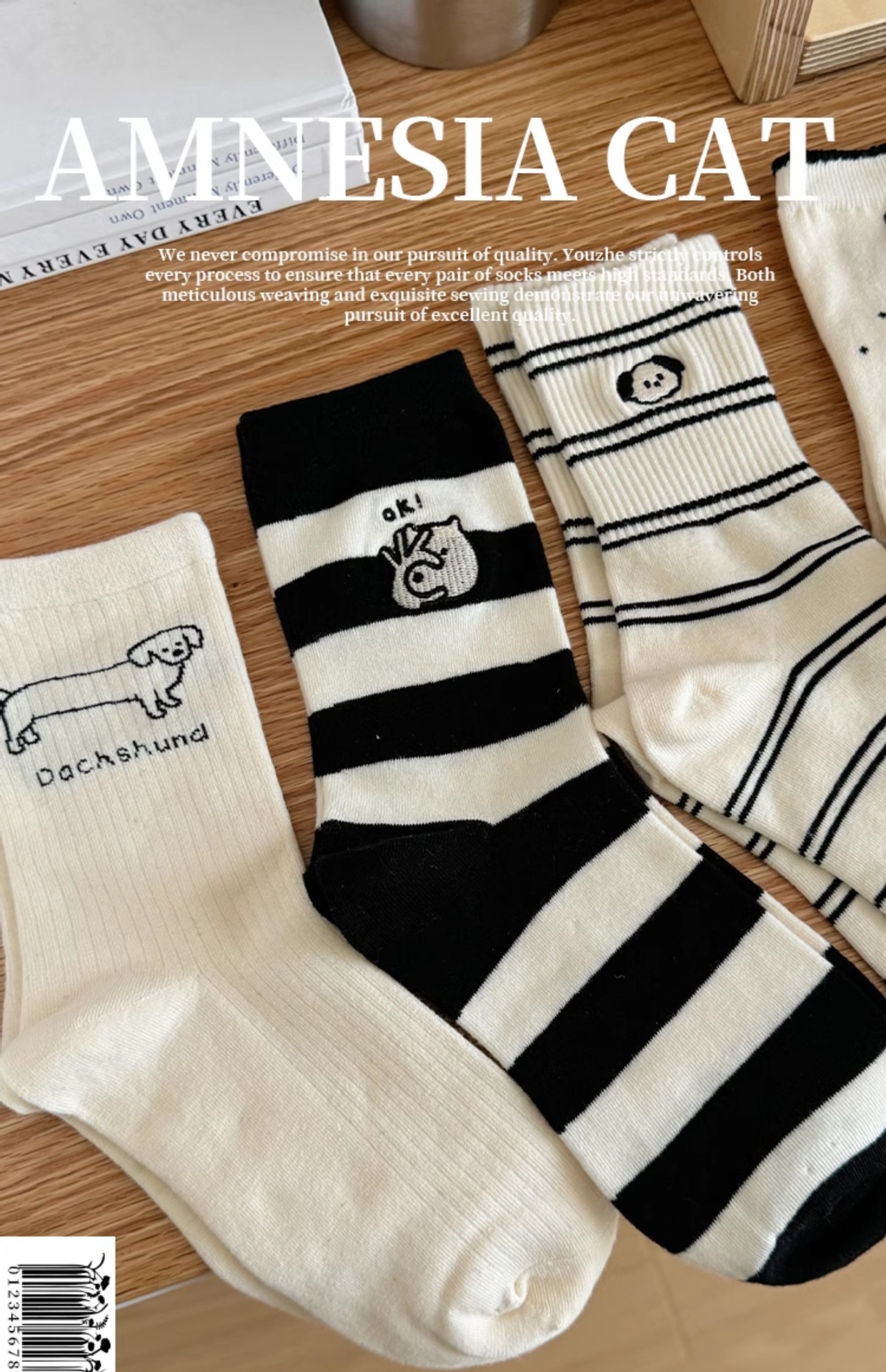 여성용 만화 강아지 양말, 여름용 귀여운 종아리 중간 양말, 순면, 트렌디한 인터넷 연예인, 여름용 여성용 한국 줄무늬 스타킹스토어 가기
