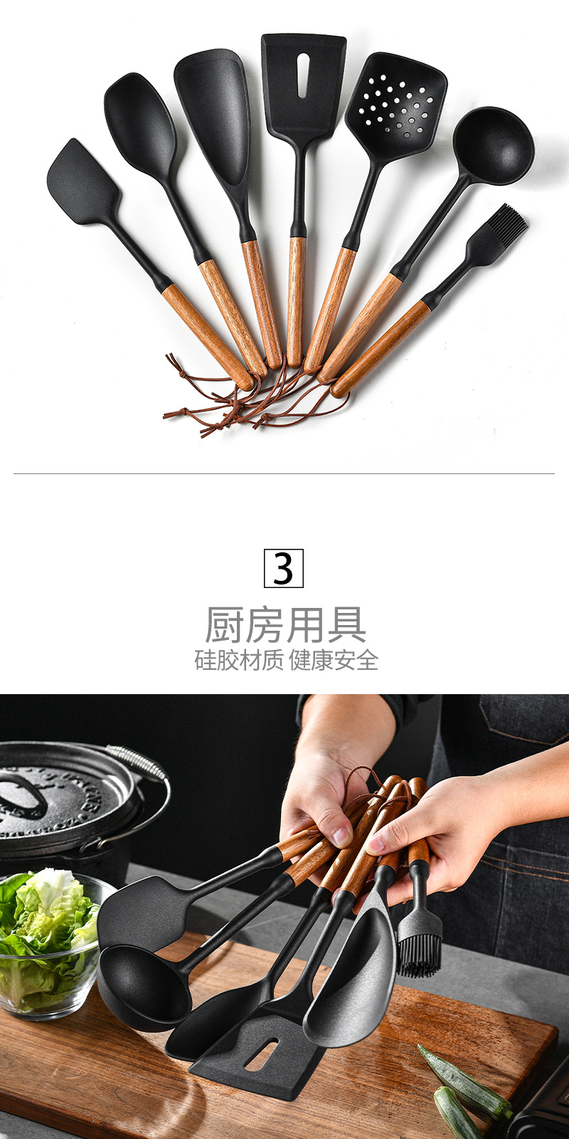 새로운 나무 손잡이 실리콘 주걱 주방 용품 세트 7 조각 고온 요리 주걱 수프 숟가락 매일 부엌스토어 가기