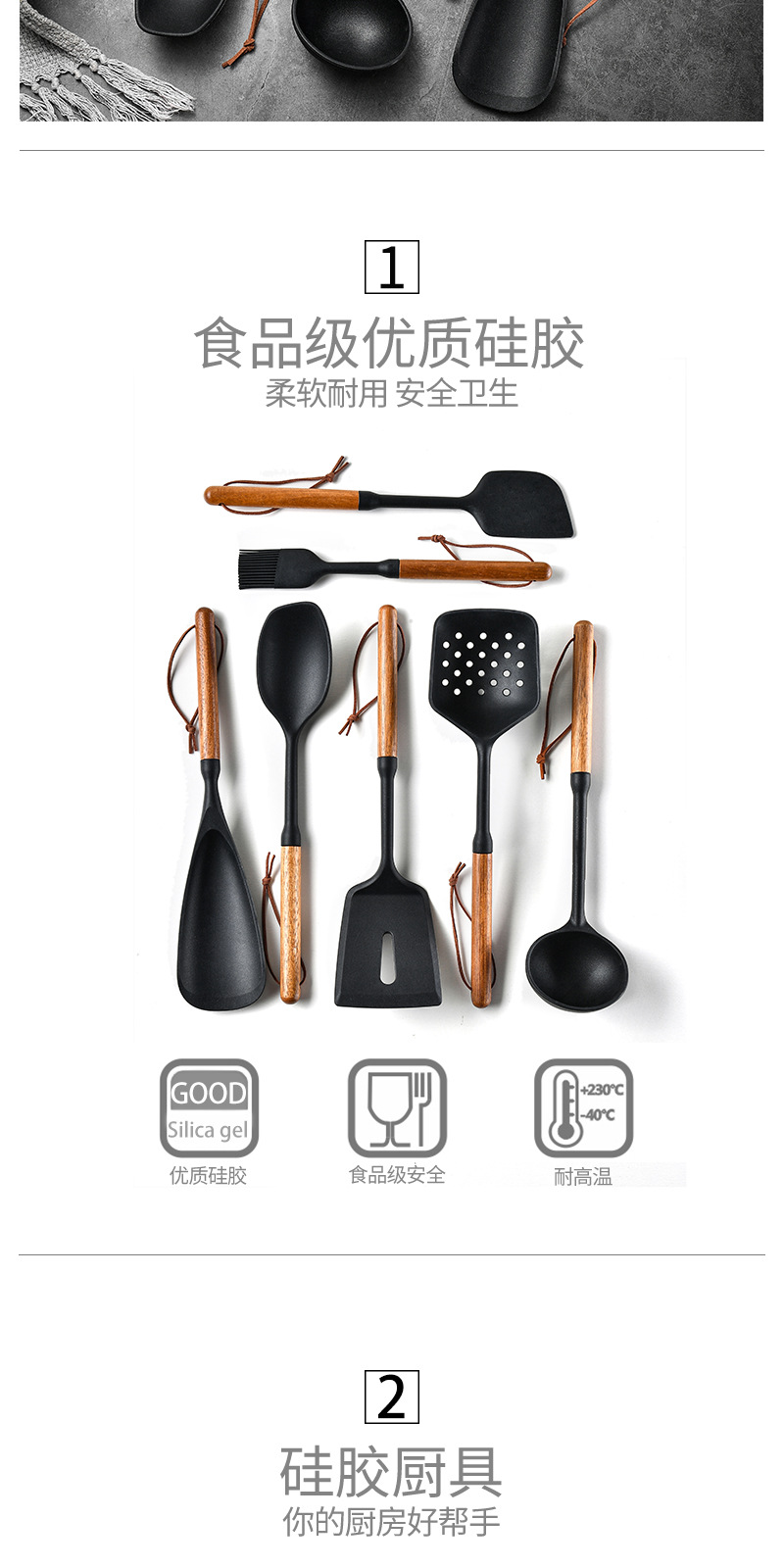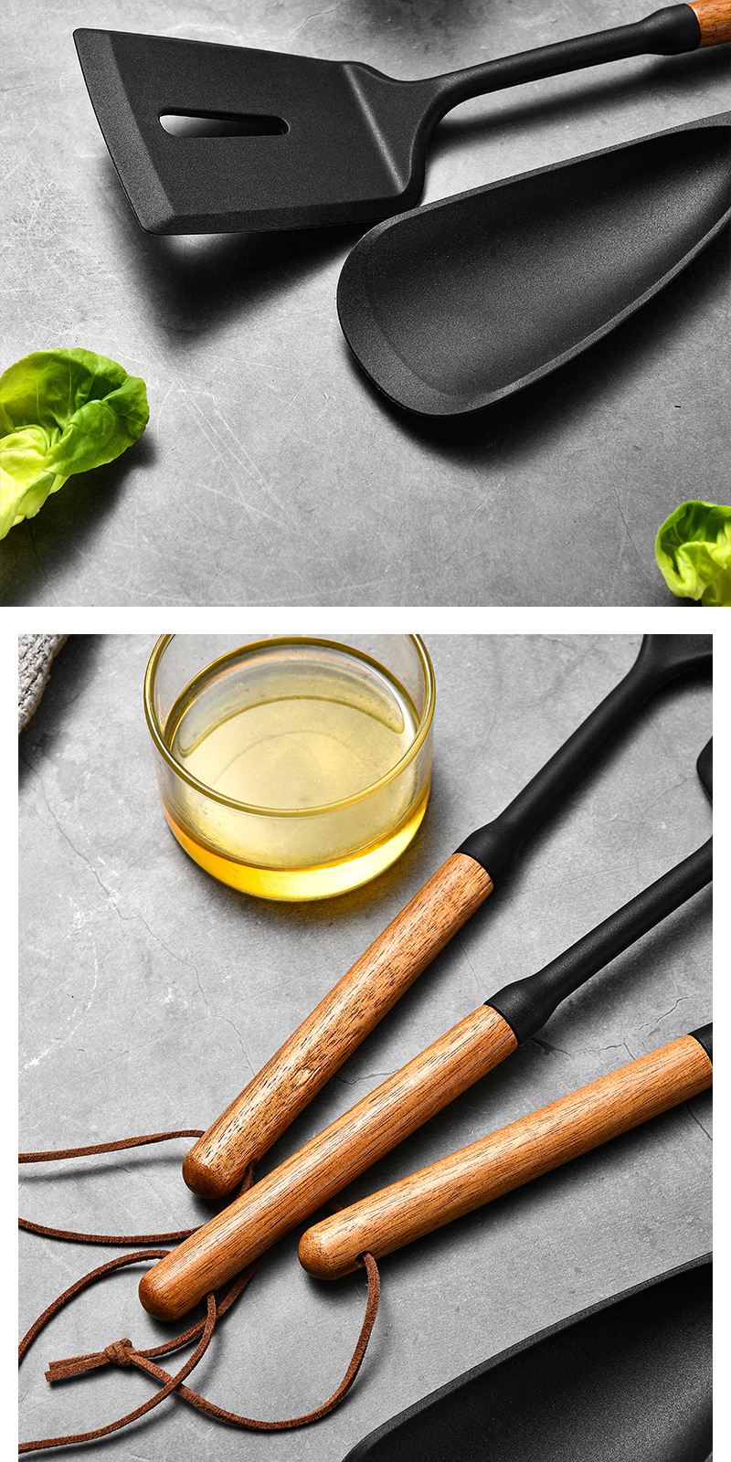 새로운 나무 손잡이 실리콘 주걱 주방 용품 세트 7 조각 고온 요리 주걱 수프 숟가락 매일 부엌