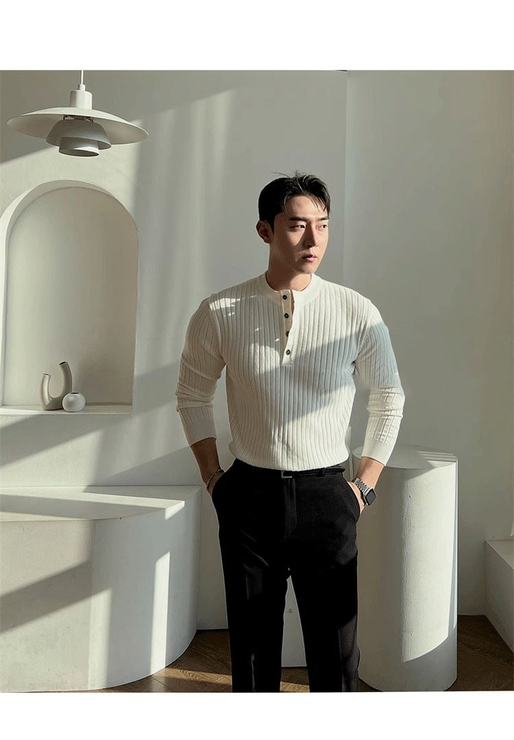 봄과 가을 새로운 니트 셔츠 긴 소매 헨리 칼라 남성 트렌드 간단한 근육 피트니스 대외 무역 국경 공장 도매