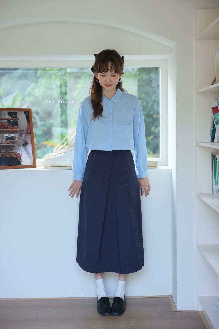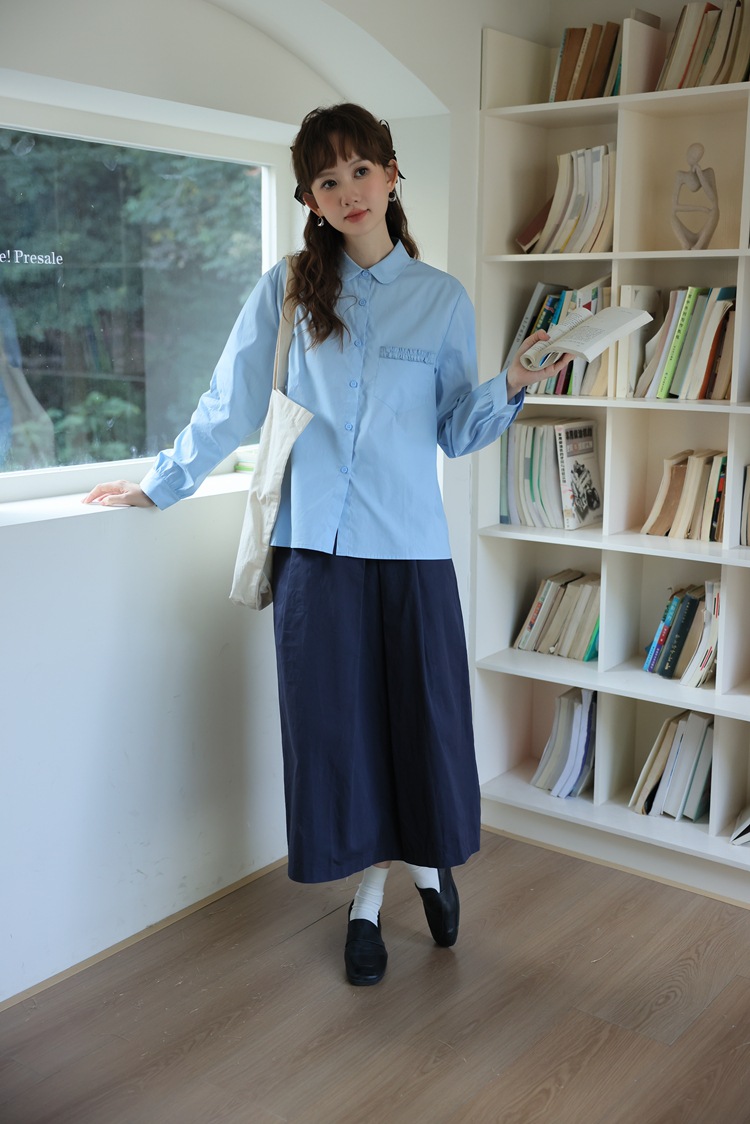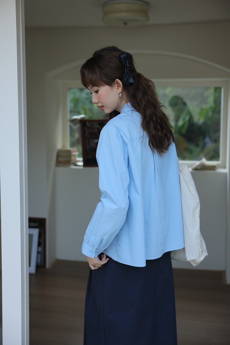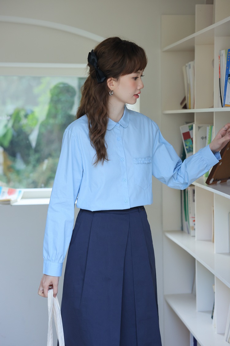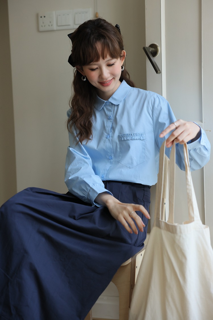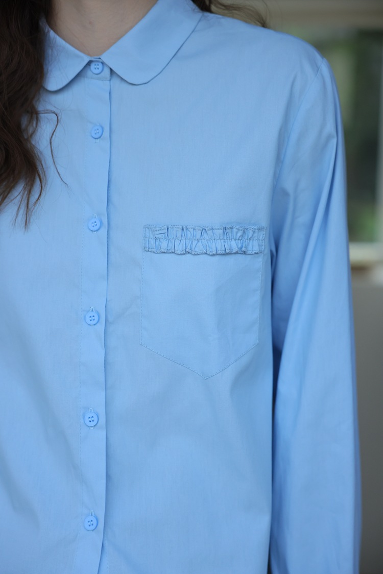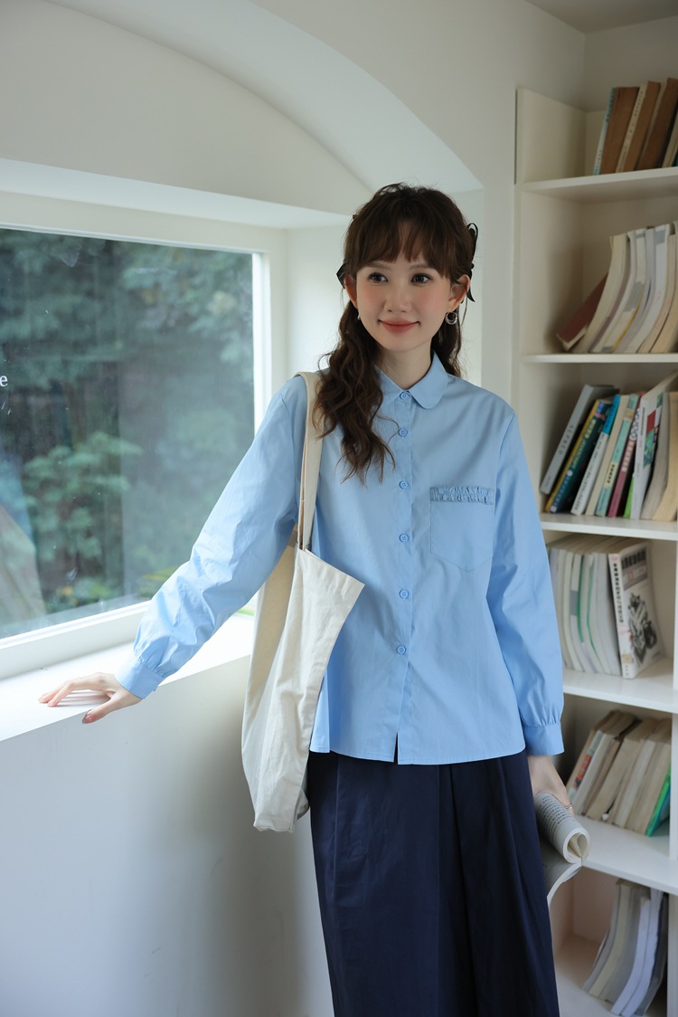 宝贝描述:甜美 时尚 荷叶边口袋 日系 净色 衬衫