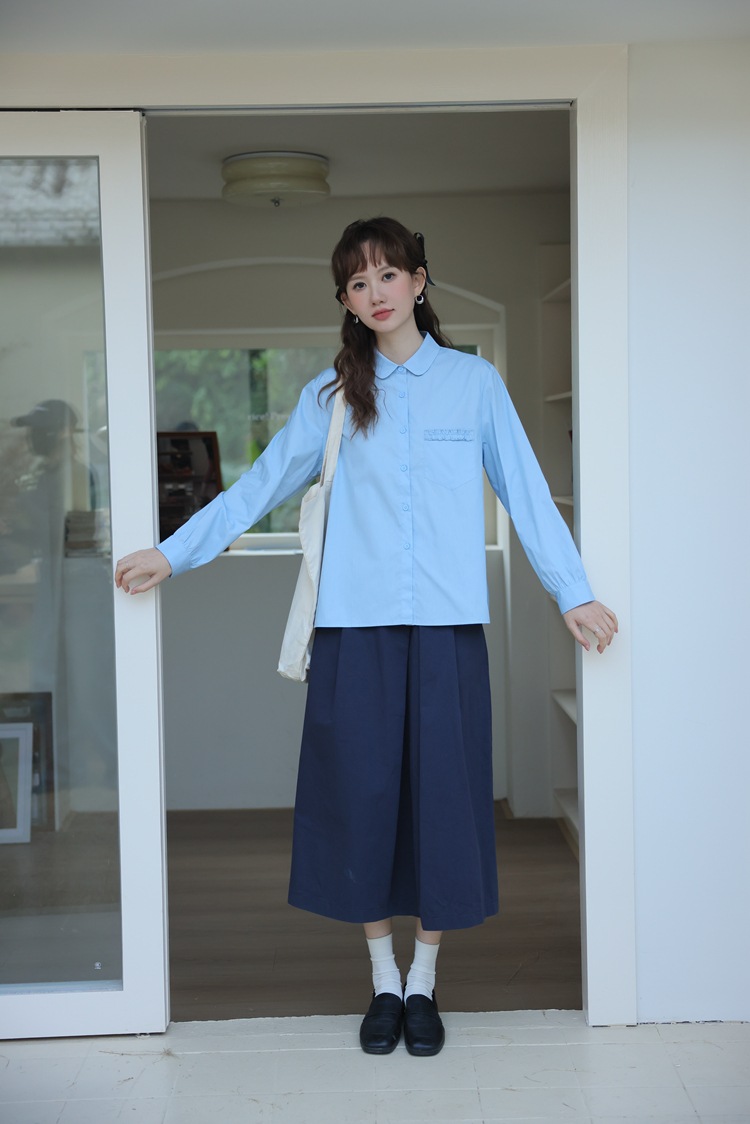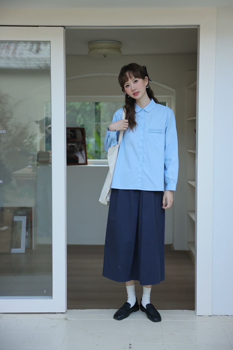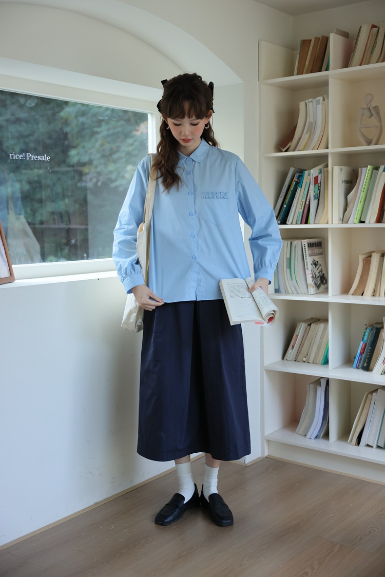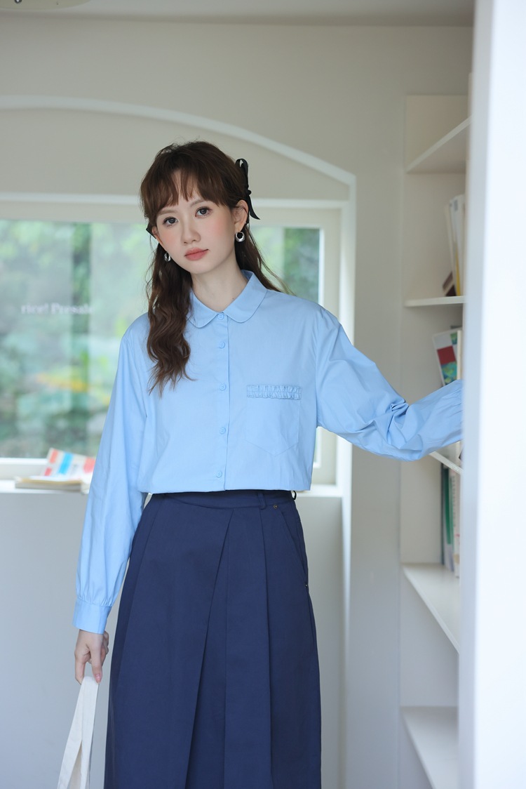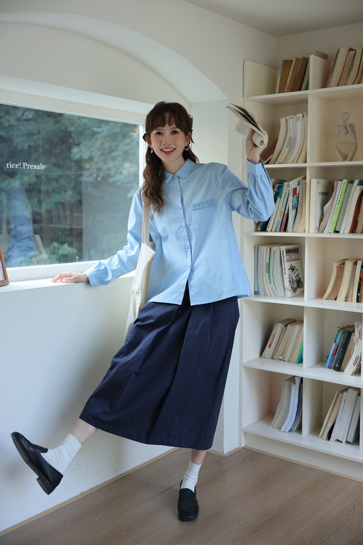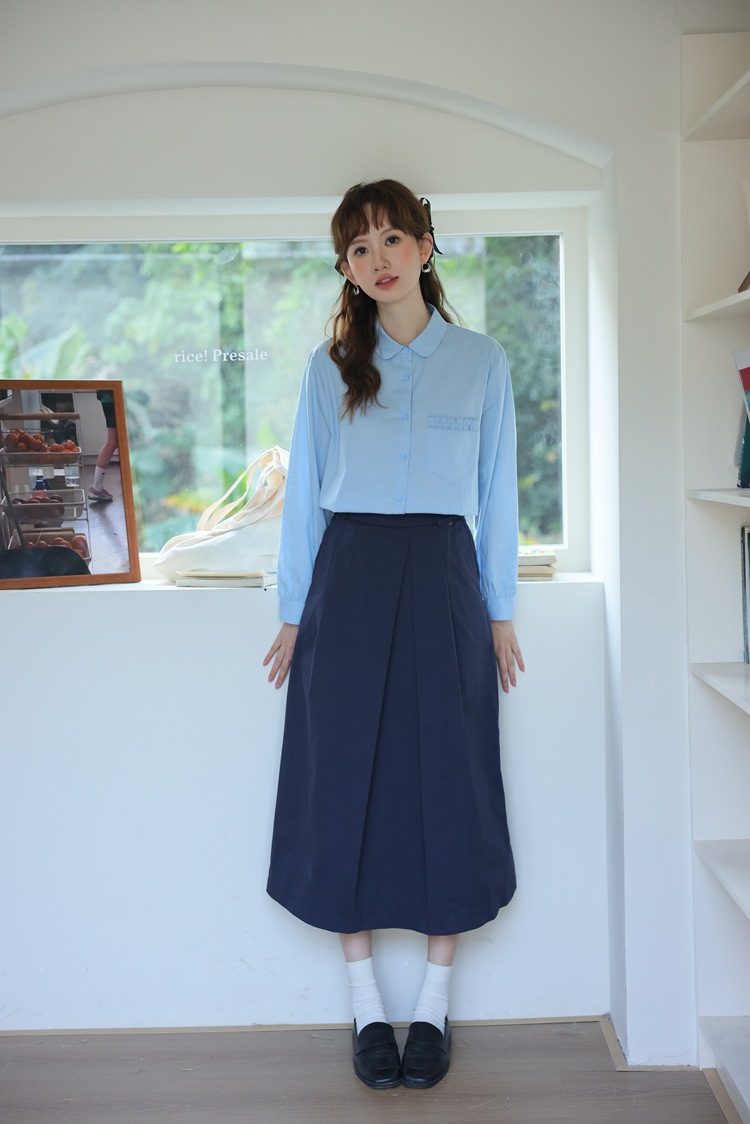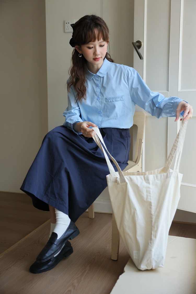 宝贝描述:甜美 时尚 荷叶边口袋 日系 净色 衬衫