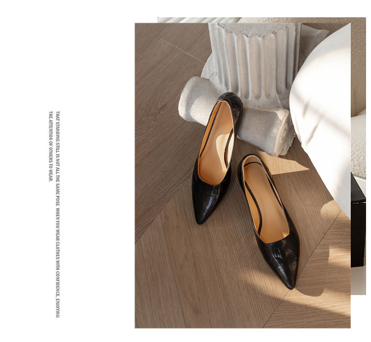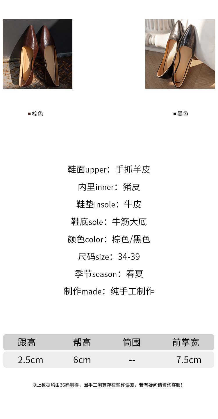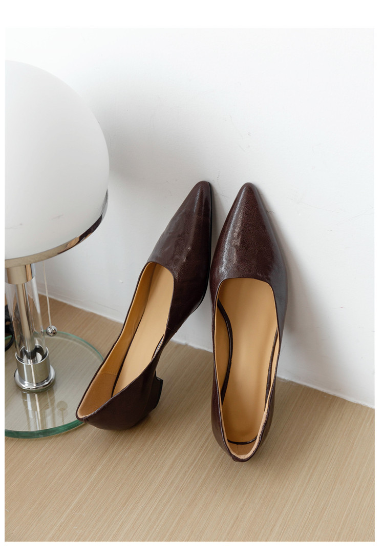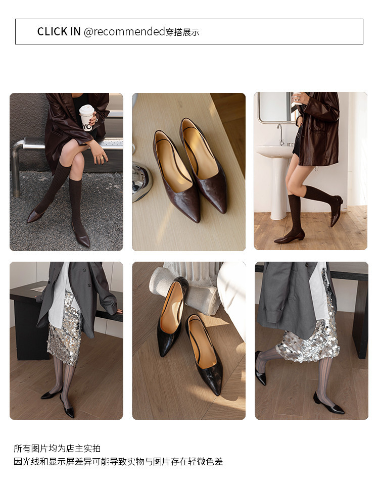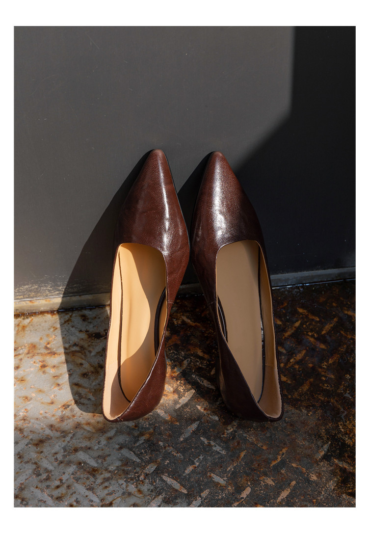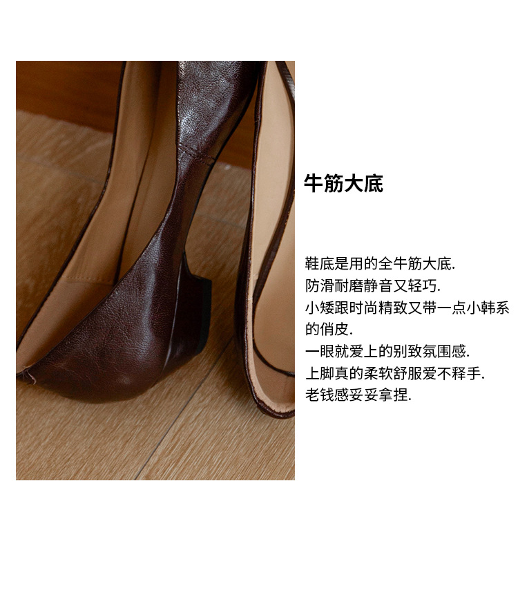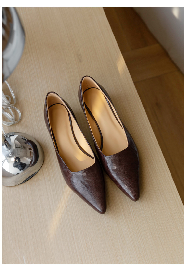 프랑스 정품 가죽 통근 블랙 미드 힐 작업 신발 여성의 2025 새로운 봄과 가을 다크 브라운 뾰족한 얕은 로우 탑 로우 힐 싱글 레이어 신발스토어 가기