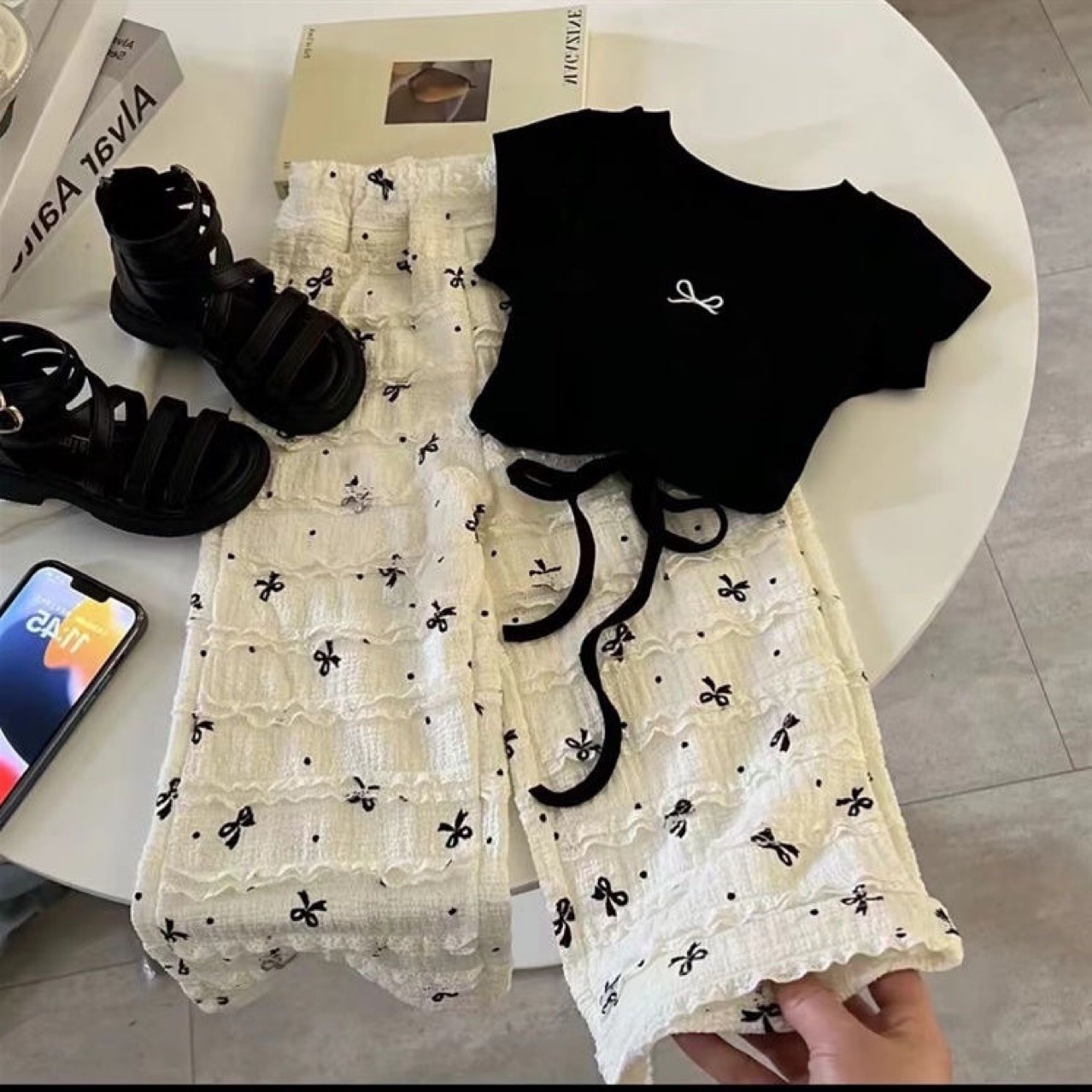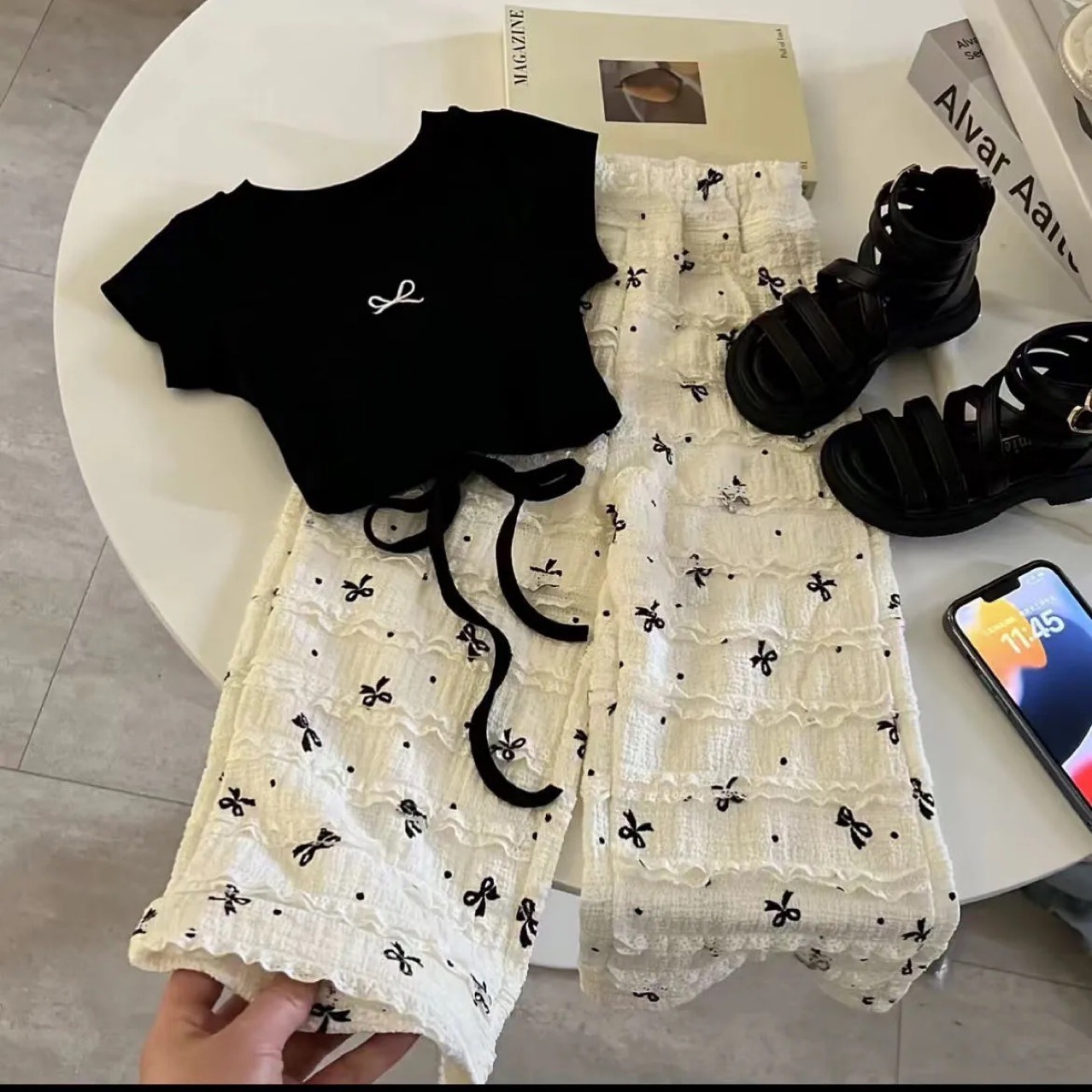 여자 여름 세트 2025 새로운 아기 소녀 세련된 백리스 티셔츠 유행 바지 캐주얼 여름 투피스 세트