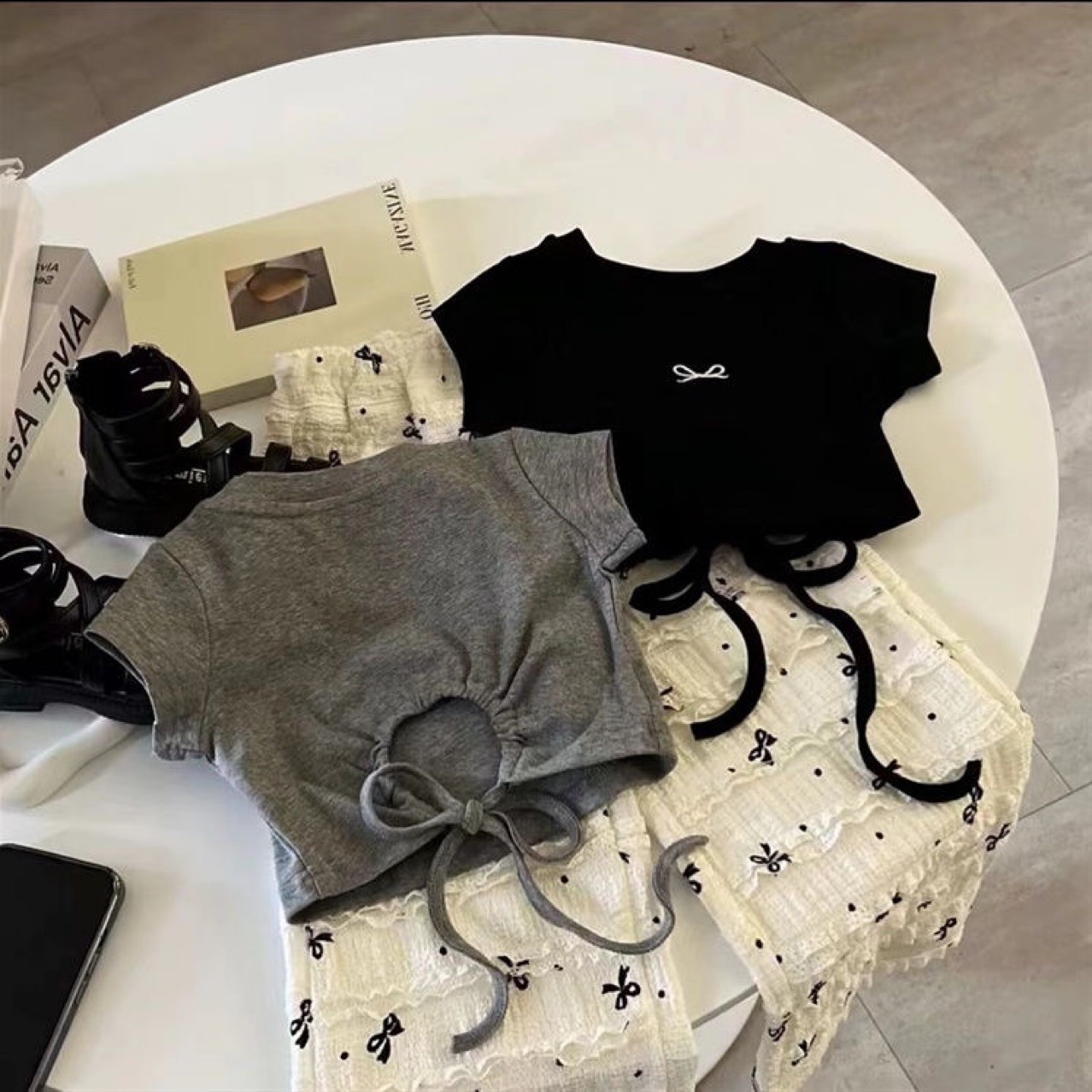 • 그레이 백리스 티셔츠 + 베이지 리본 팬츠