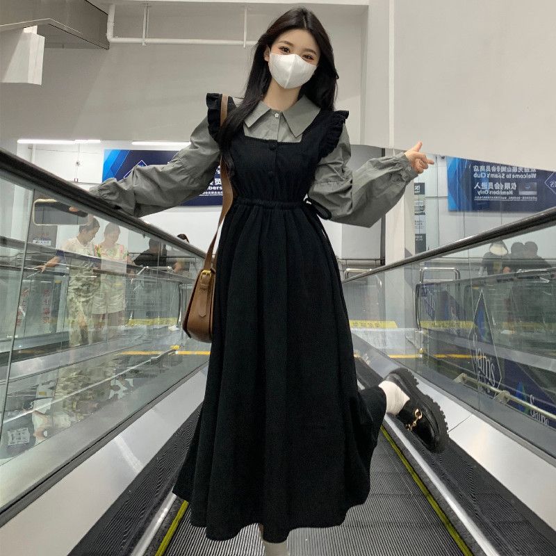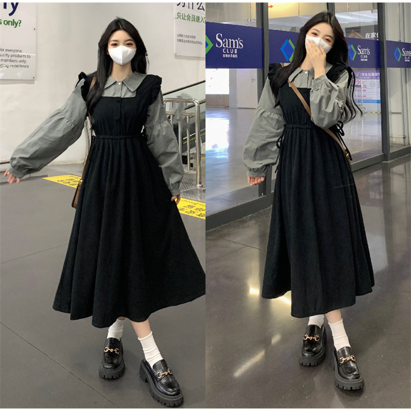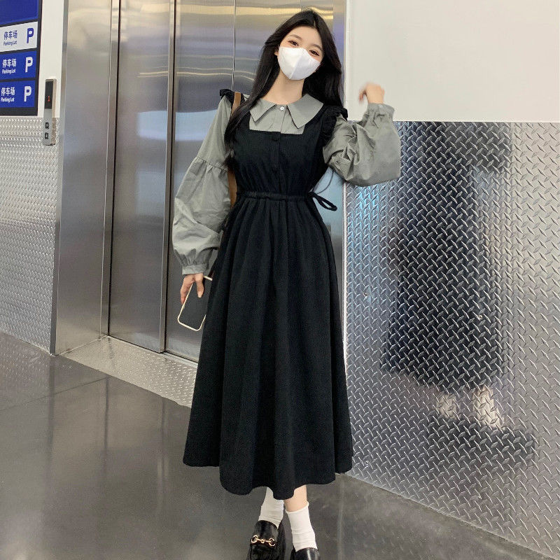 플러스 사이즈 여성 한국식 통통녀 가짜 투피스 콘트라스트 컬러 디자인 원피스 가을 배꼽 커버 슬리밍 캐주얼 롱 원피스스토어 가기