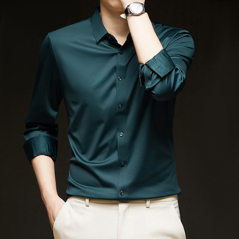 봄과 가을 새로운 하이 엔드 센스 비 마킹 아이스 실크 높은 탄성 긴팔 셔츠 남성 비즈니스 캐주얼 솔리드 컬러 다림질 남성용 셔츠