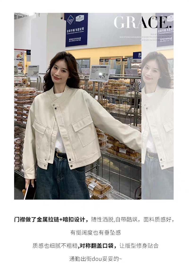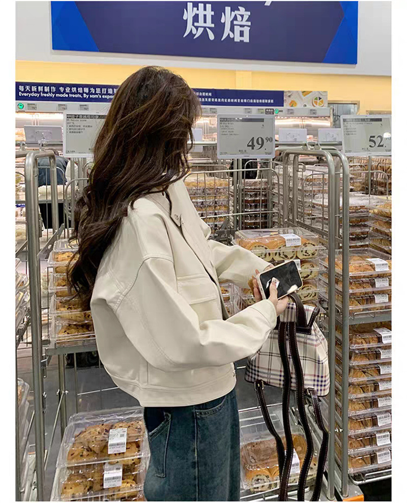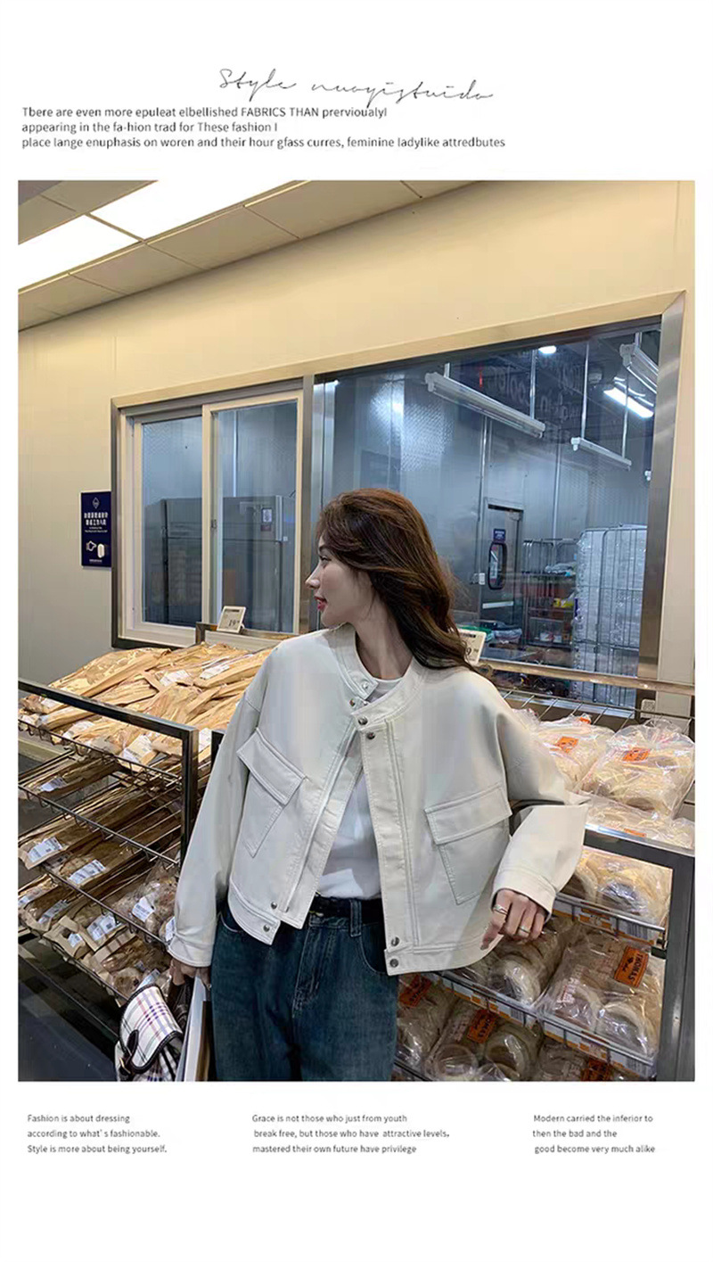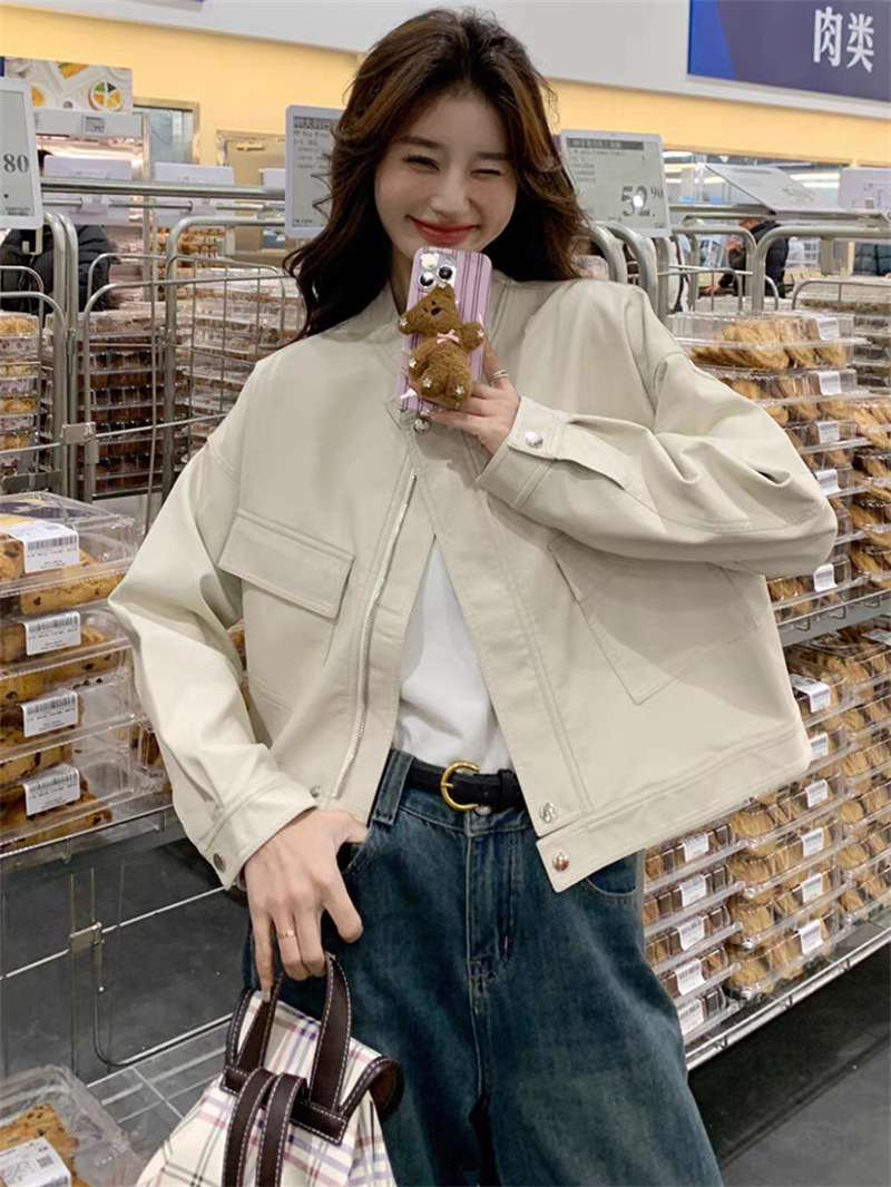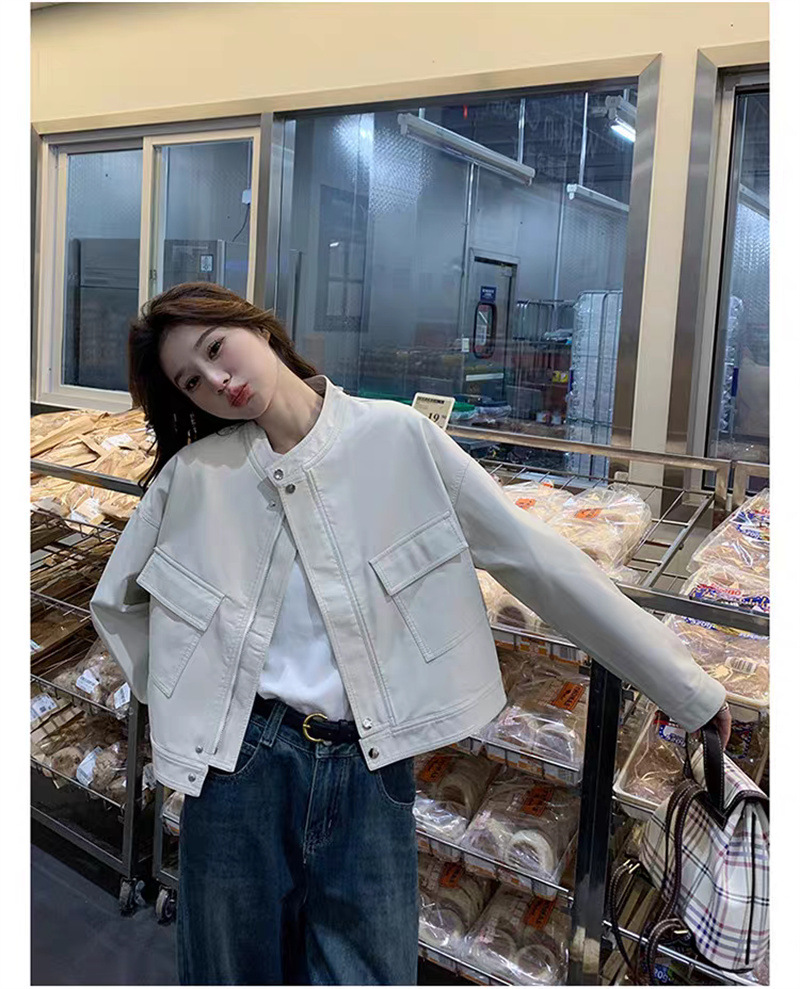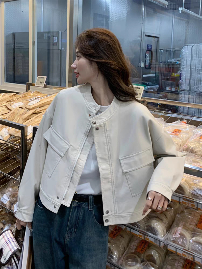 빈티지 라이스 화이트 수직 칼라 작은 가죽 자켓 여성의 봄과 가을 짧은 2025 새로운 PU 가죽 오토바이 가죽 자켓스토어 가기