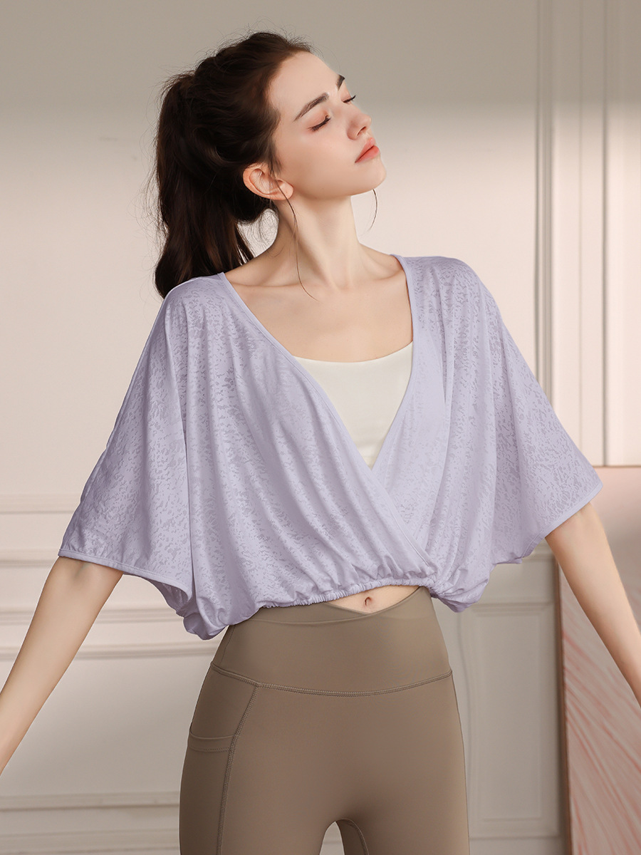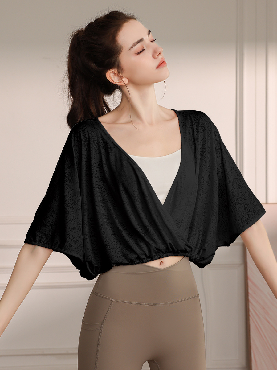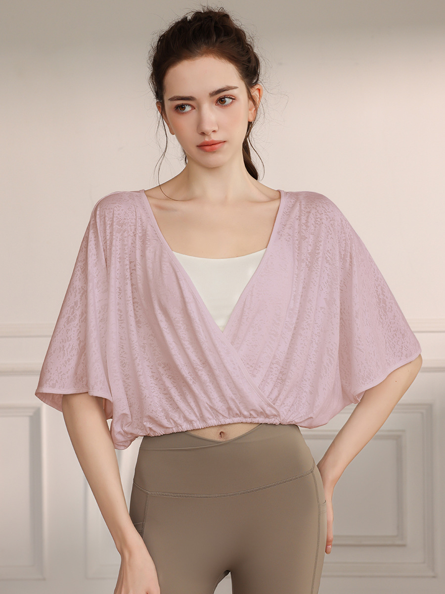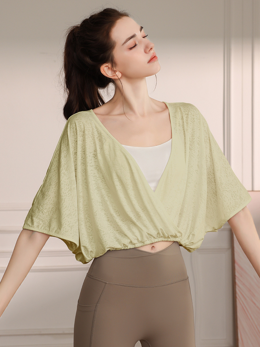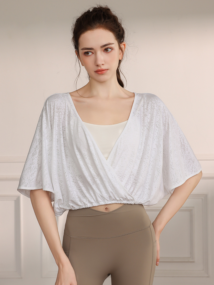 고급 나일론 자카드 요가 의류 스포츠 조끼 여성 느슨한 통기성 박쥐 슬리브 피트니스 탑 여름