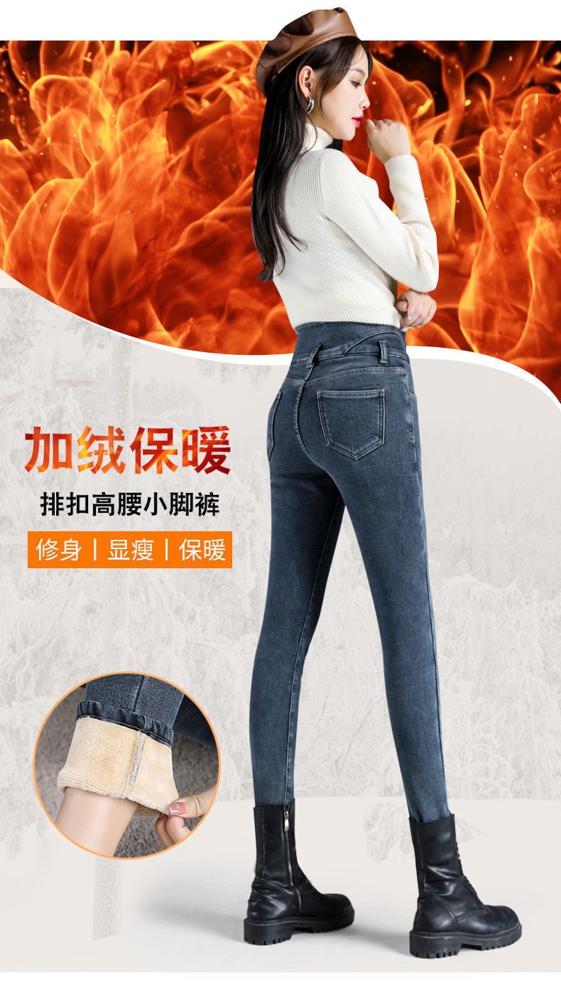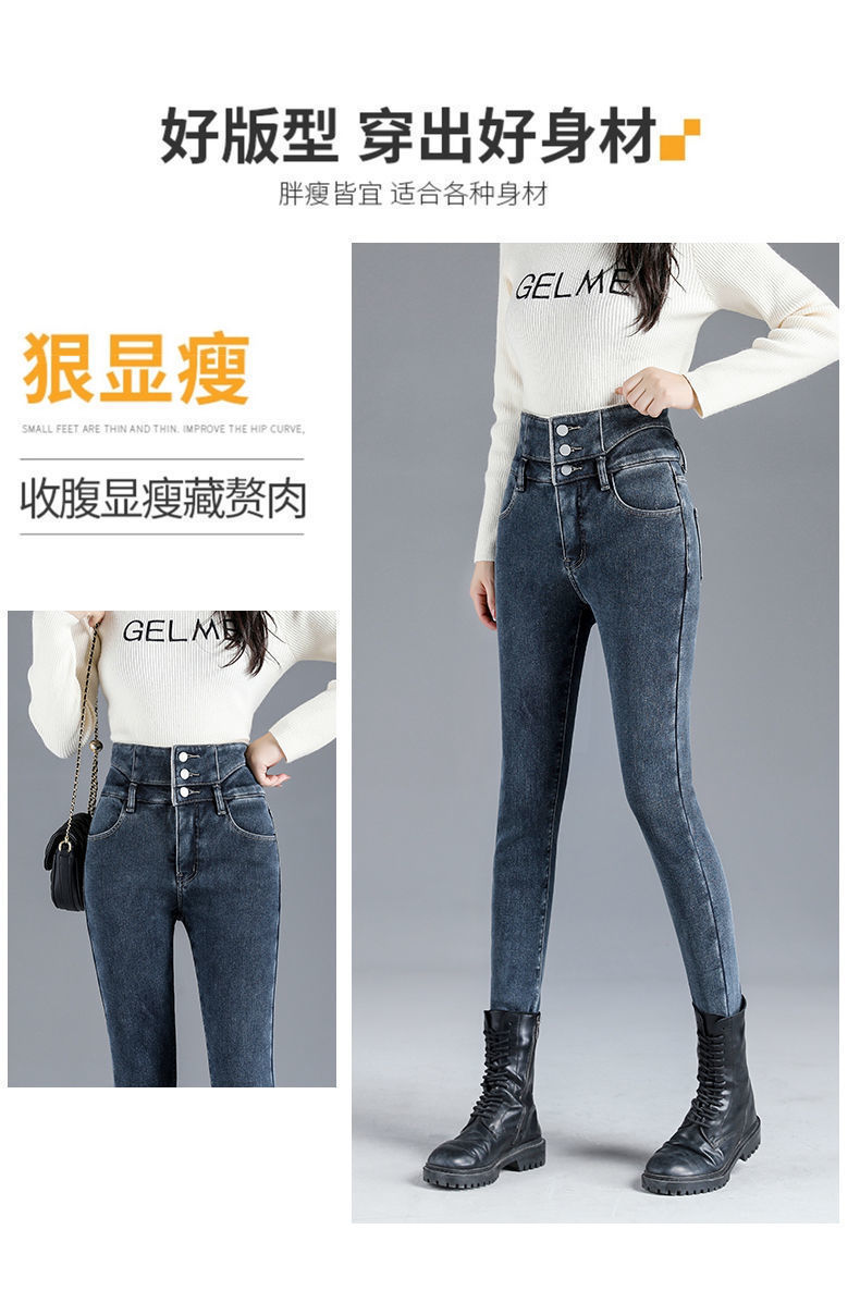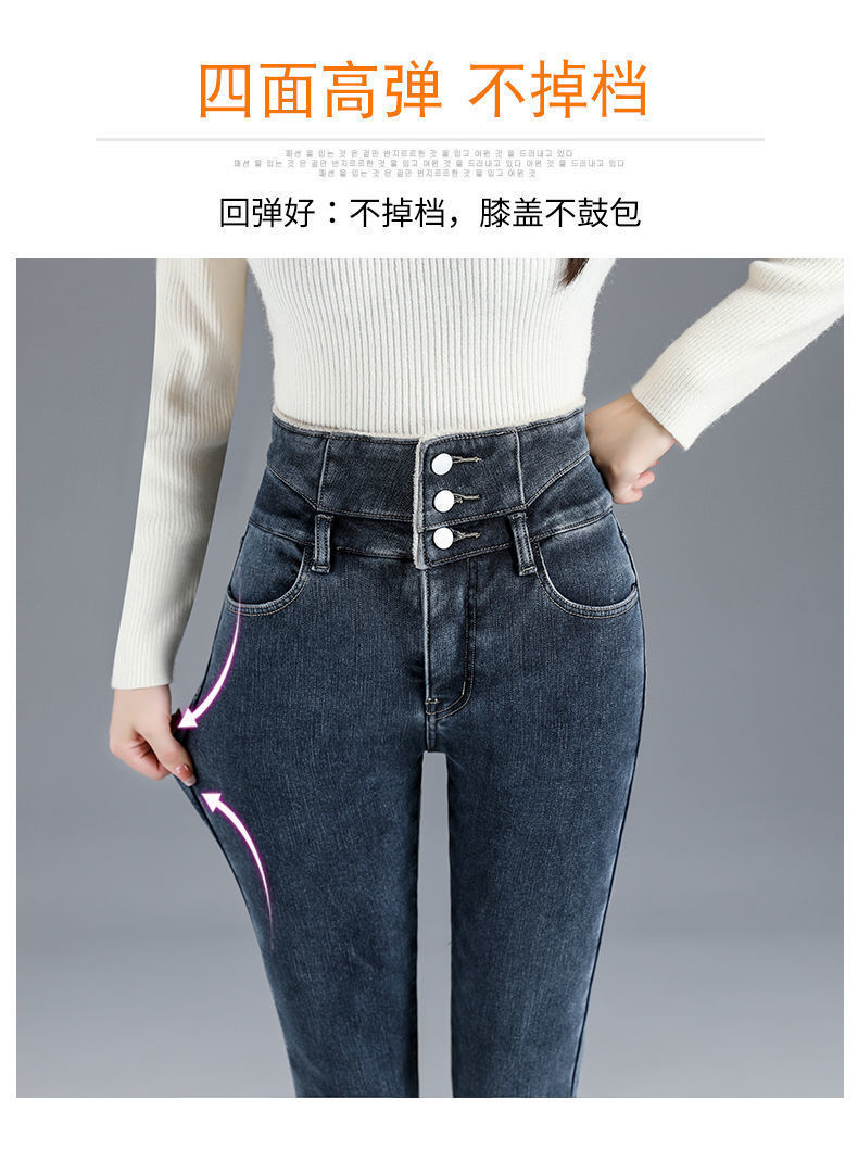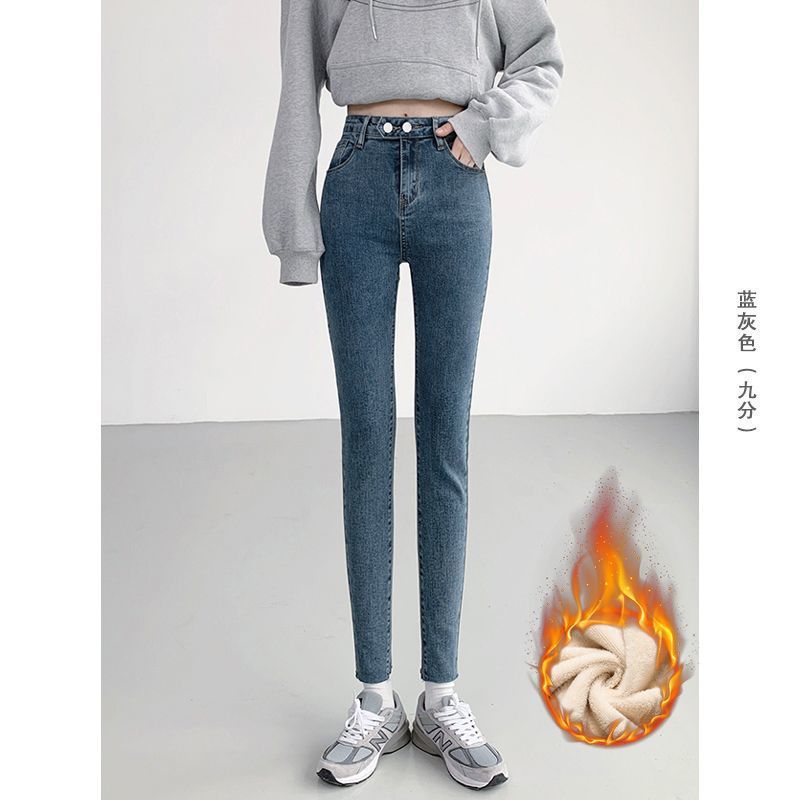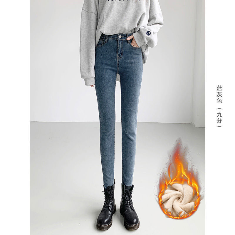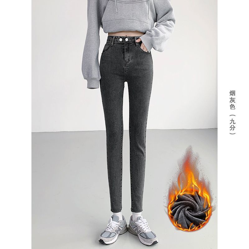 기모 두꺼운 청바지 여성의 2024 년 새로운 가을과 겨울 외부 높은 허리 슬리밍 모든 경기 꽉 작은 발 긴 바지스토어 가기