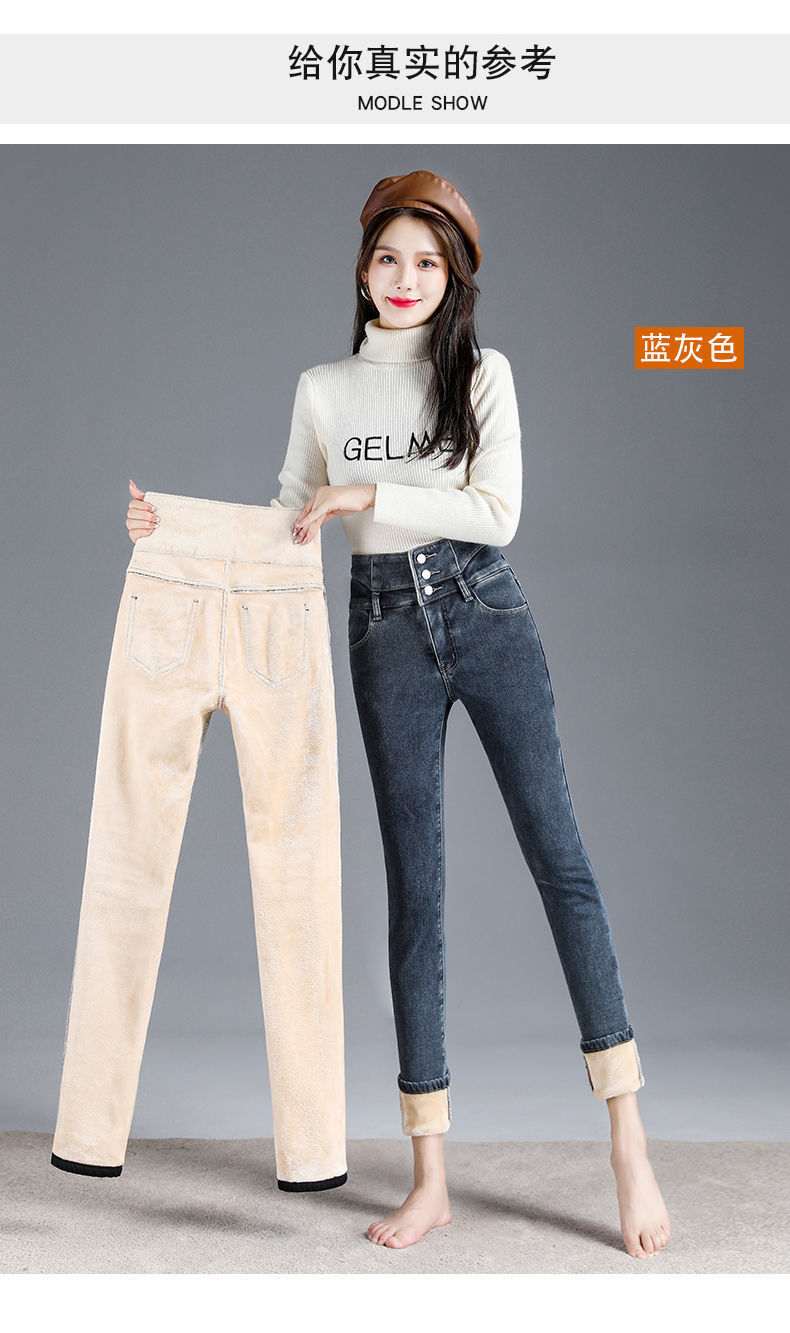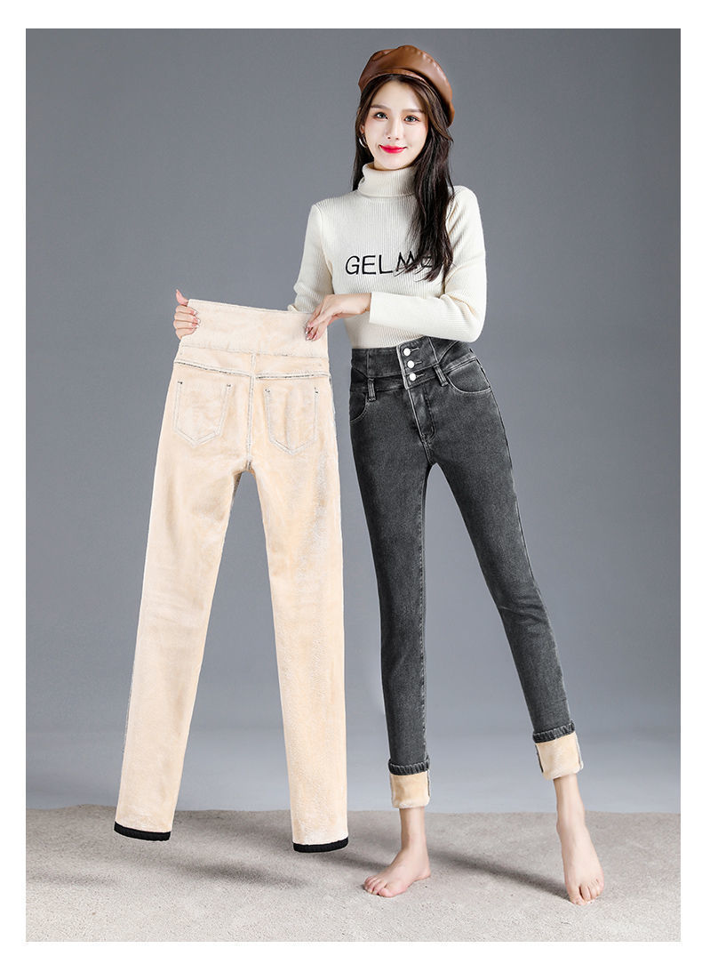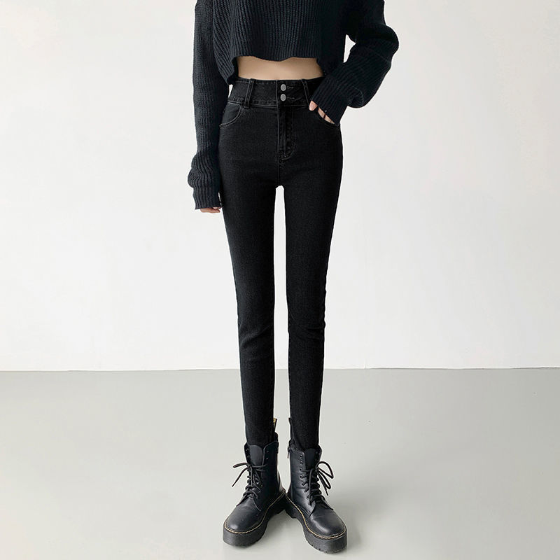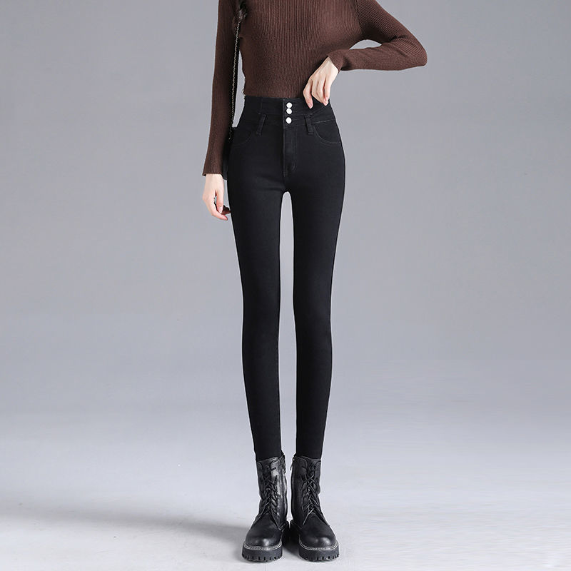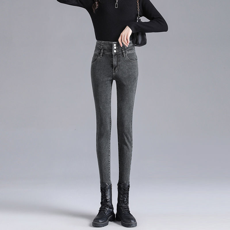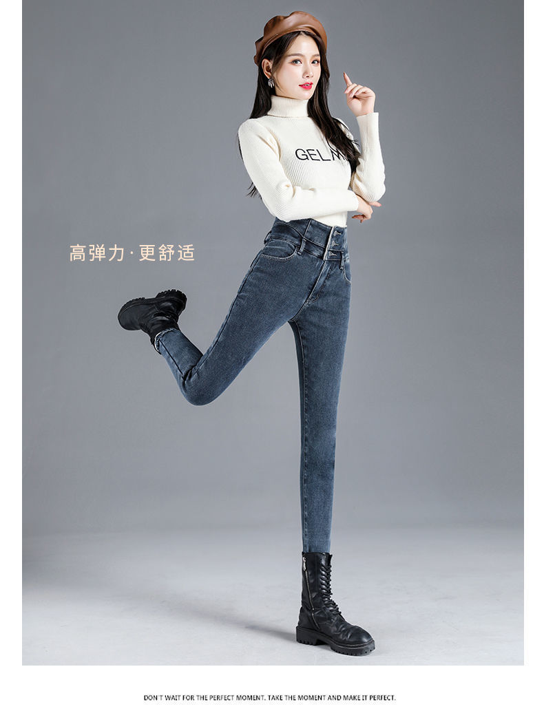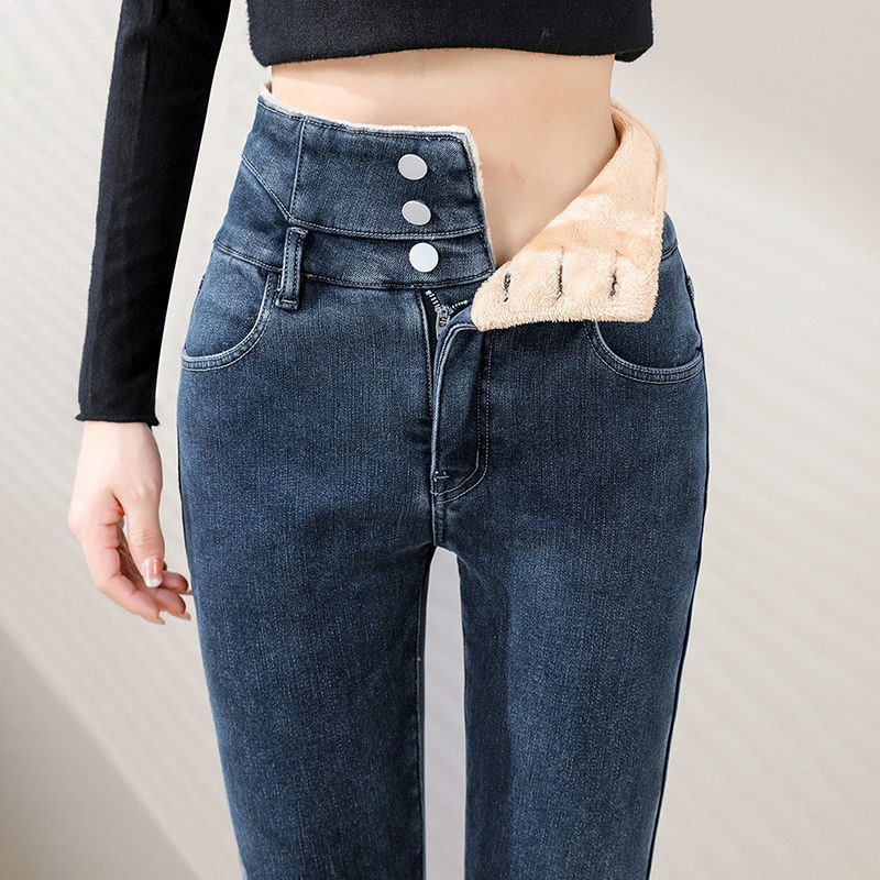 기모 두꺼운 청바지 여성의 2024 년 새로운 가을과 겨울 외부 높은 허리 슬리밍 모든 경기 꽉 작은 발 긴 바지스토어 가기