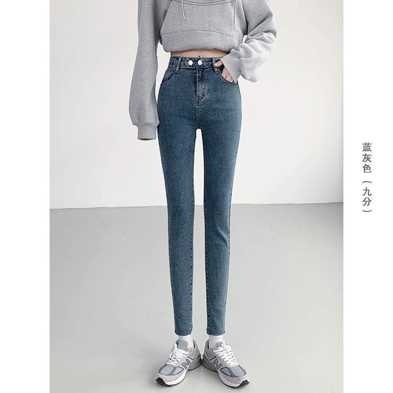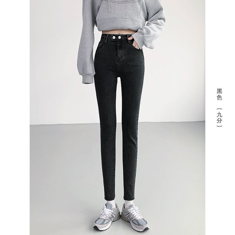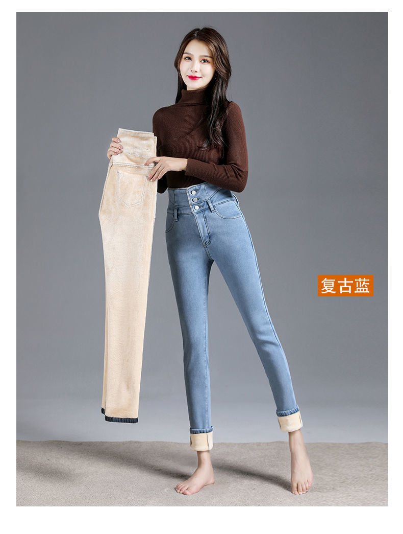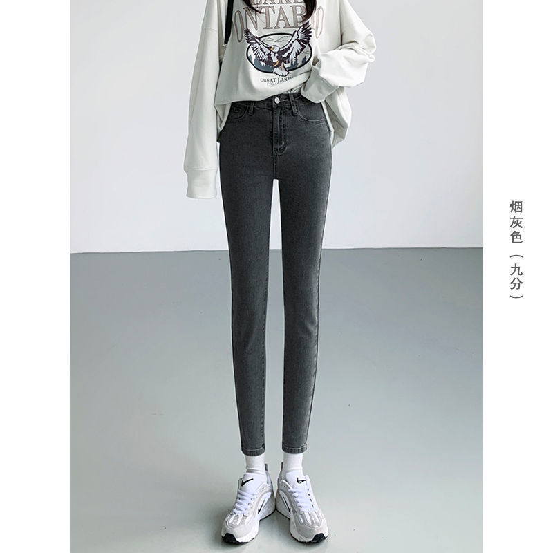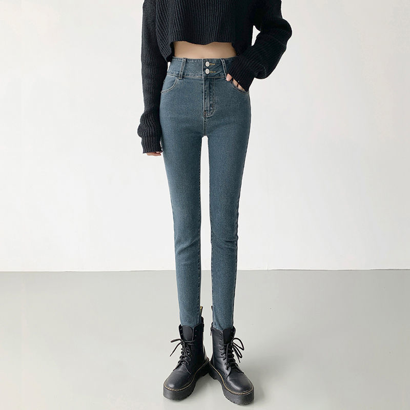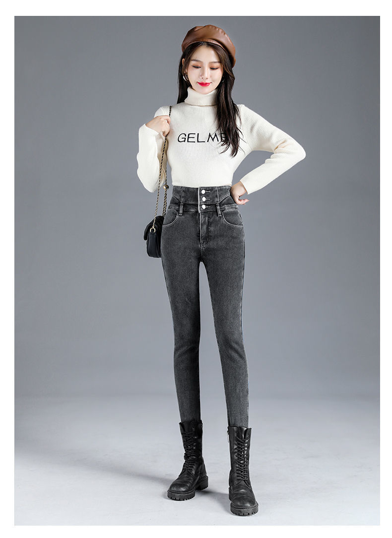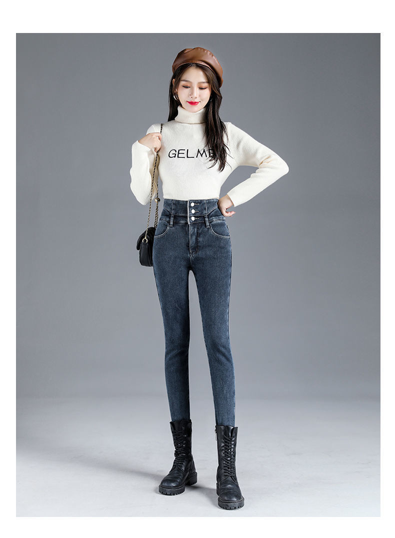 기모 두꺼운 청바지 여성의 2024 년 새로운 가을과 겨울 외부 높은 허리 슬리밍 모든 경기 꽉 작은 발 긴 바지스토어 가기