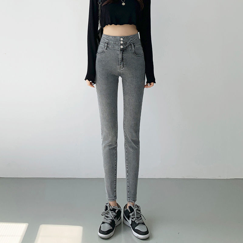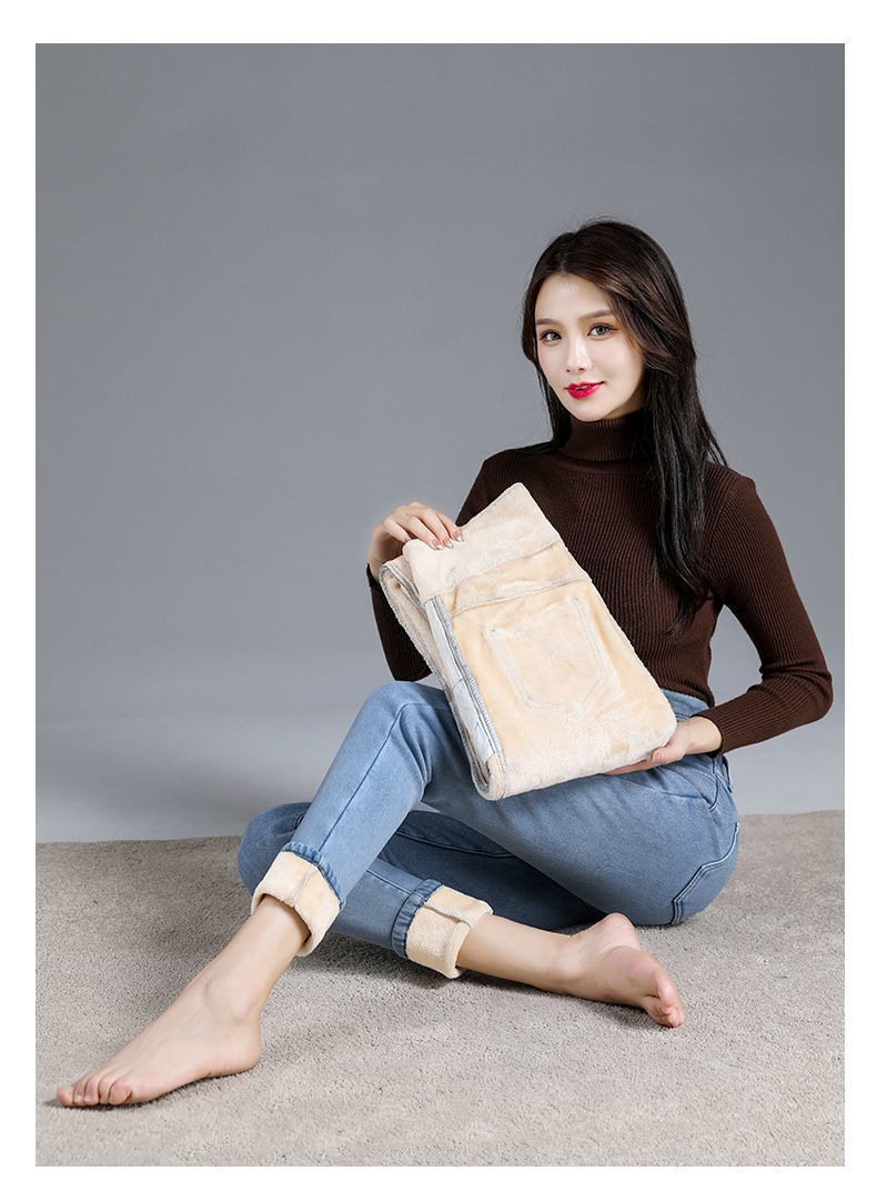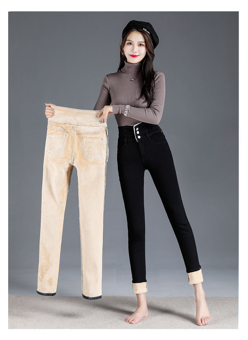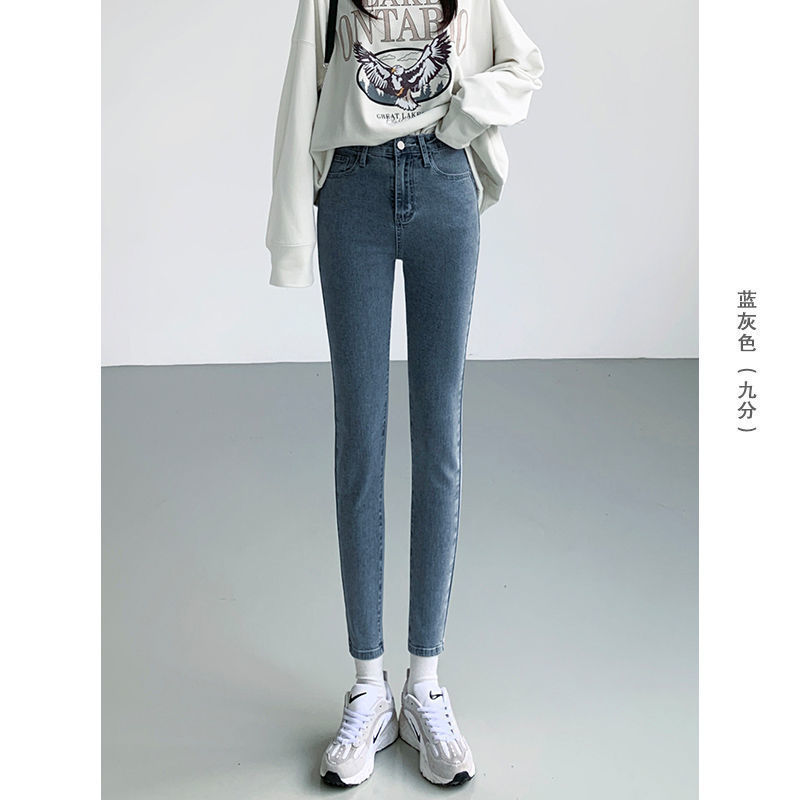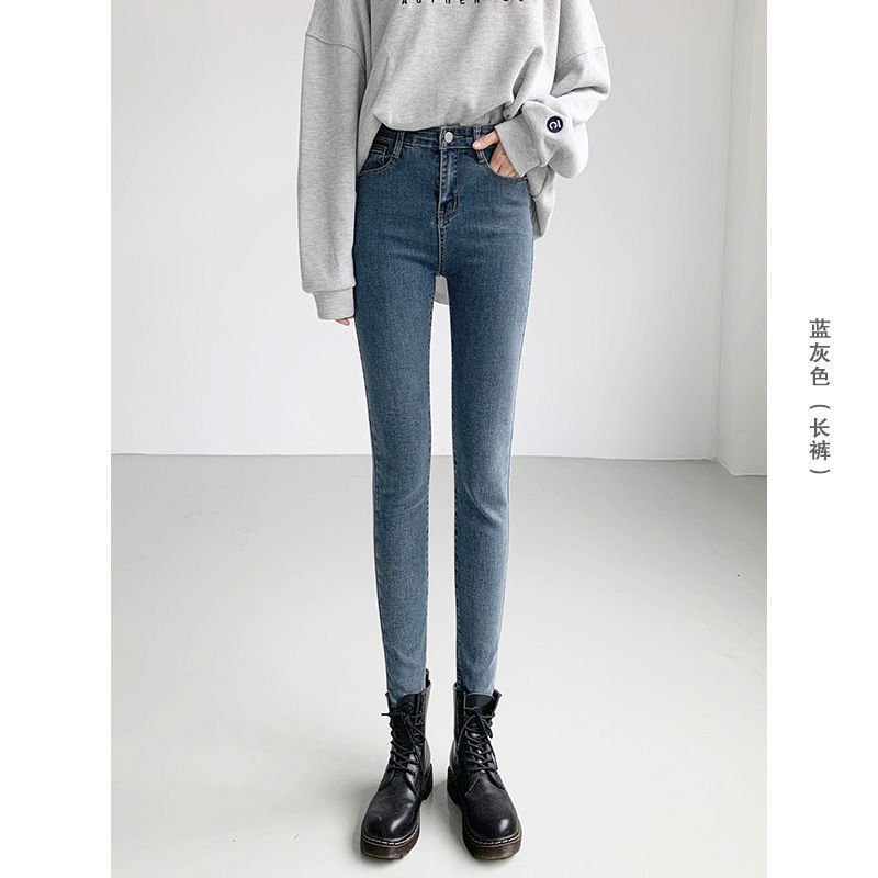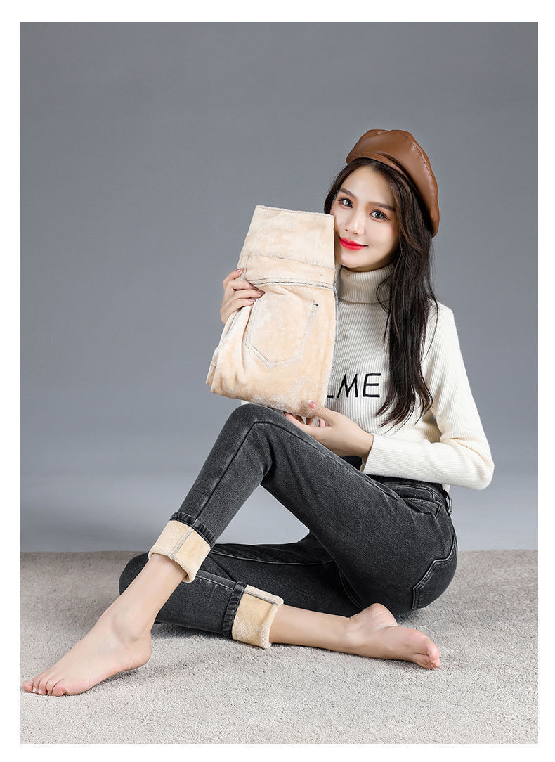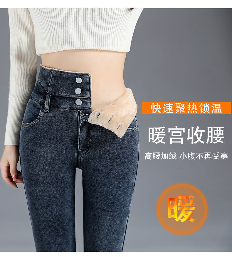 기모 두꺼운 청바지 여성의 2024 년 새로운 가을과 겨울 외부 높은 허리 슬리밍 모든 경기 꽉 작은 발 긴 바지스토어 가기