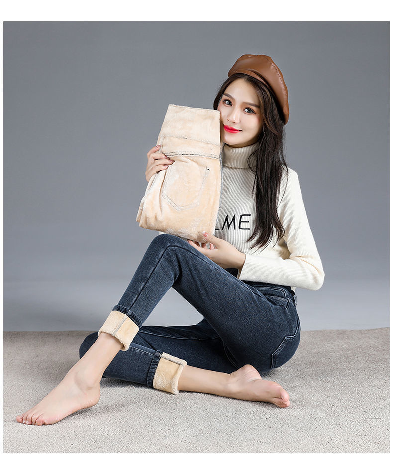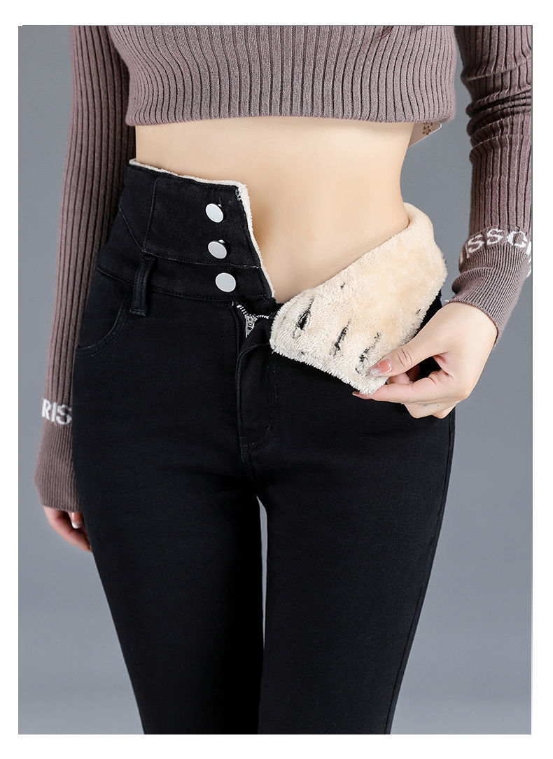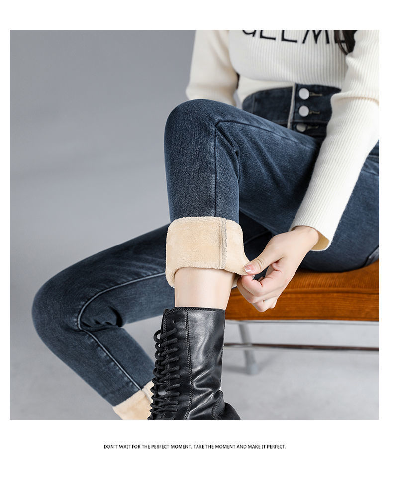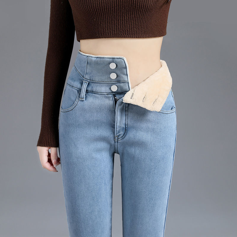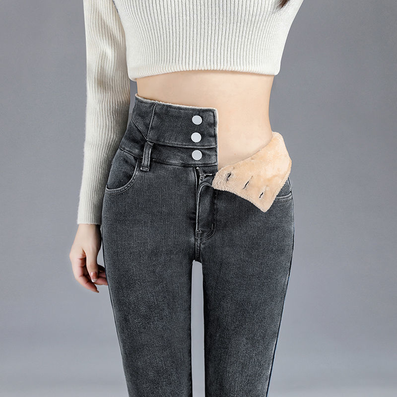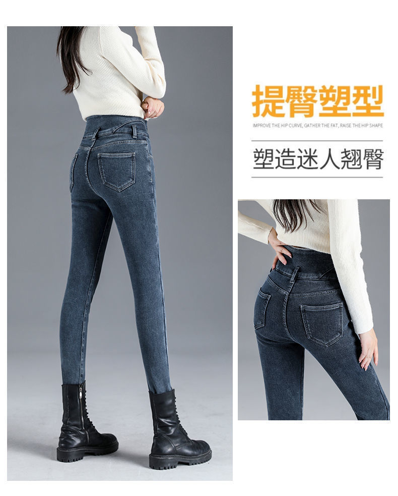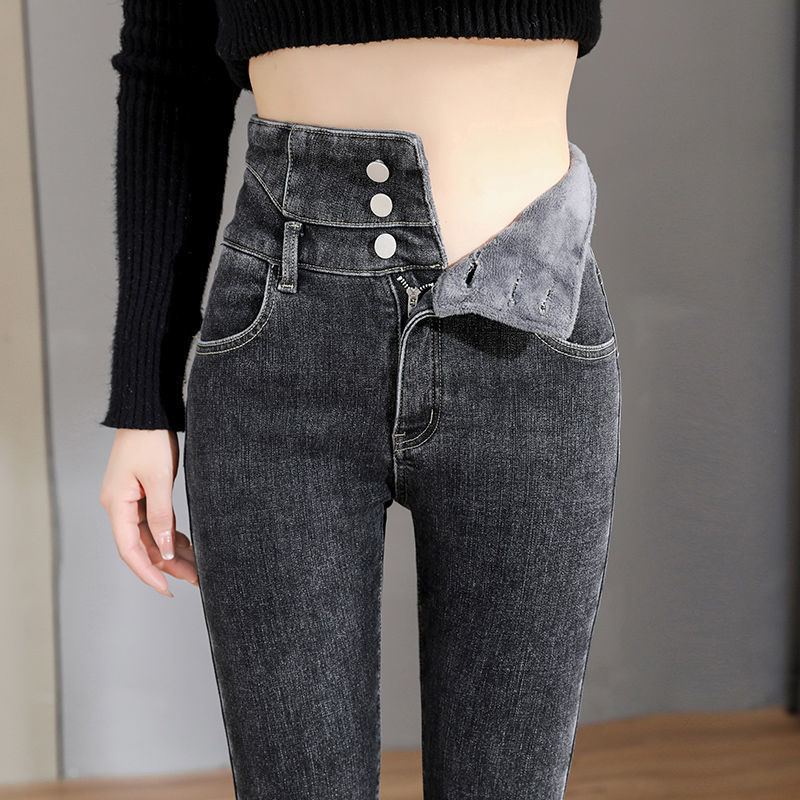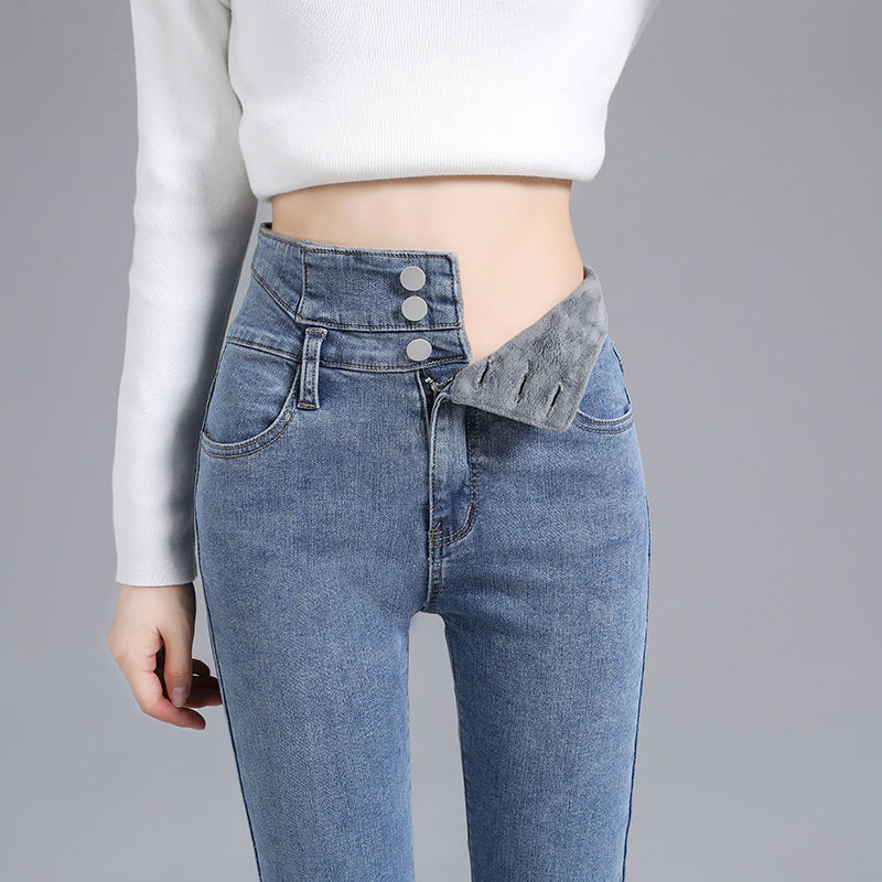 기모 두꺼운 청바지 여성의 2024 년 새로운 가을과 겨울 외부 높은 허리 슬리밍 모든 경기 꽉 작은 발 긴 바지