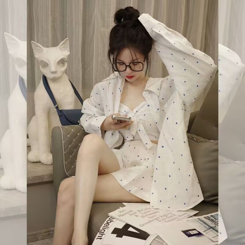여름 원피스 소금 빛 잘 익은 파워 티 착용 선 스크린 셔츠 넓은 다리 반바지 3 피스 세트 여성스토어 가기