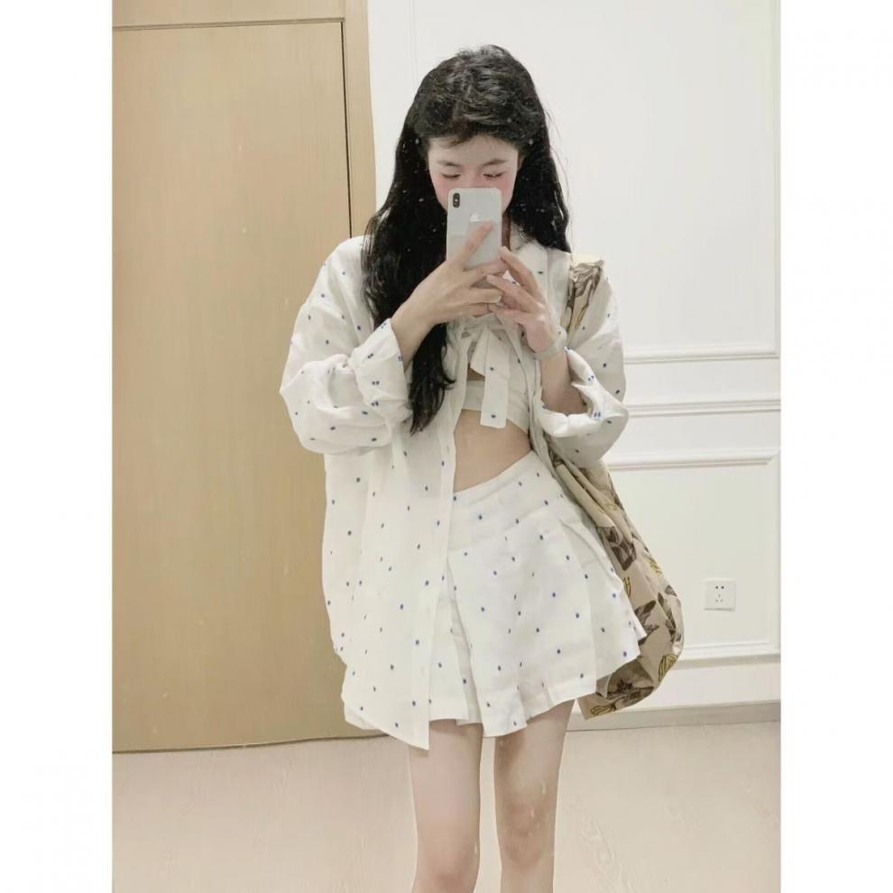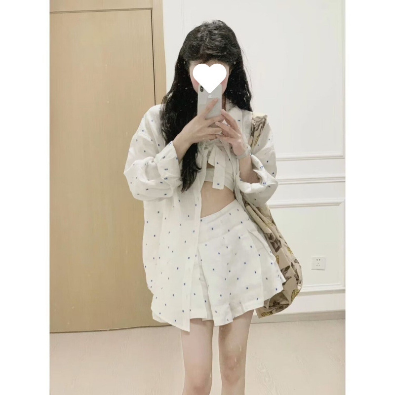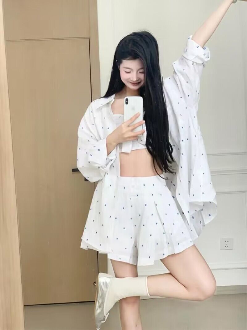 • 흰색 바탕에 파란색 도트 반바지 + 셔츠 + 멜빵 (3종 세트)