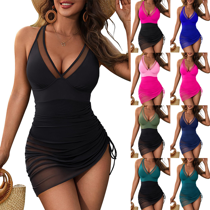 아마존 2025 국경 단색 새로운 패션 유럽과 미국의 메쉬 스티칭은 여성을위한 드로 스트링 원피스 수영복을 모았습니다.스토어 가기