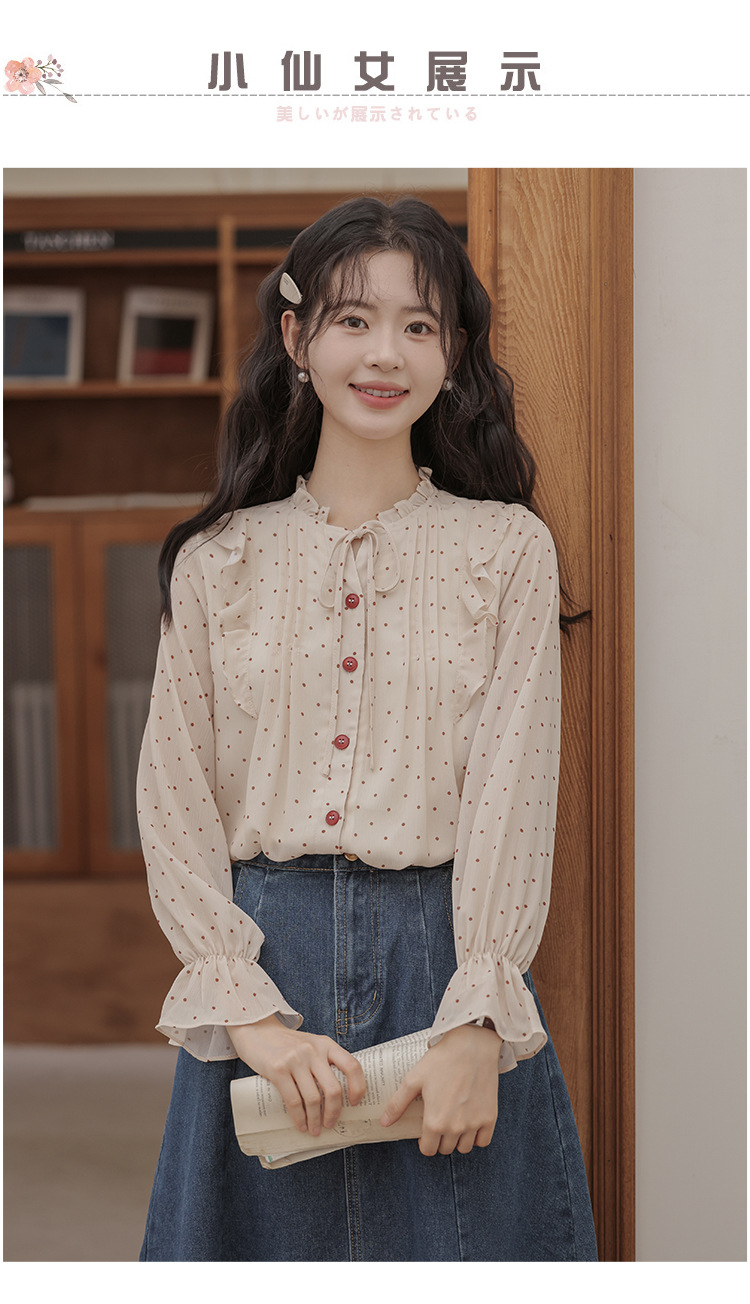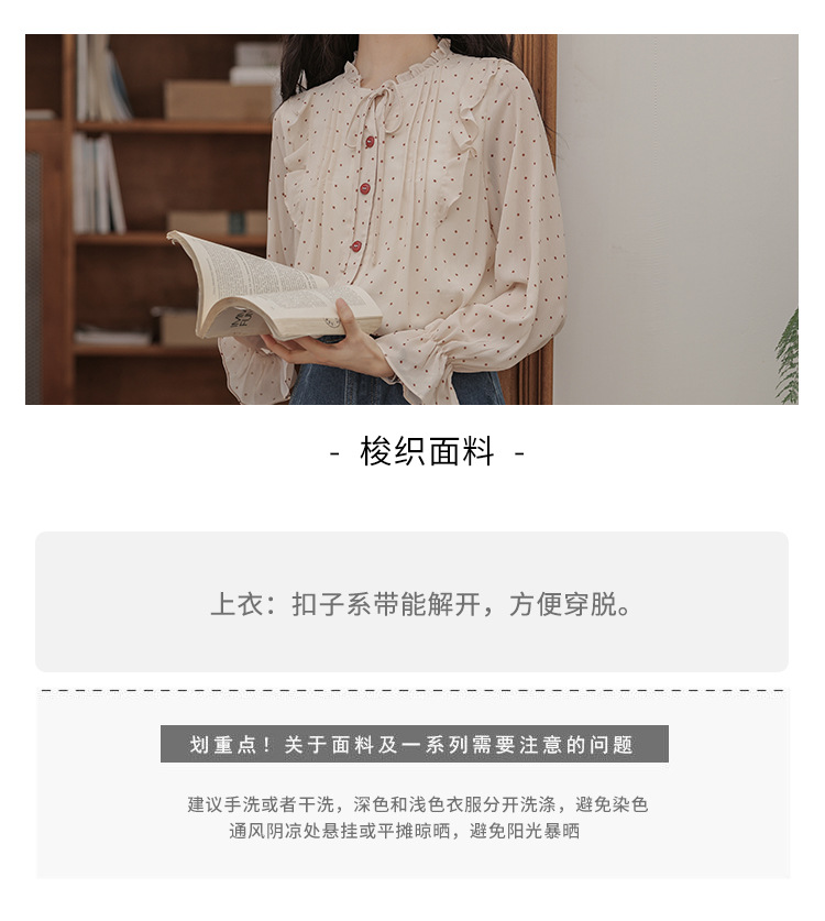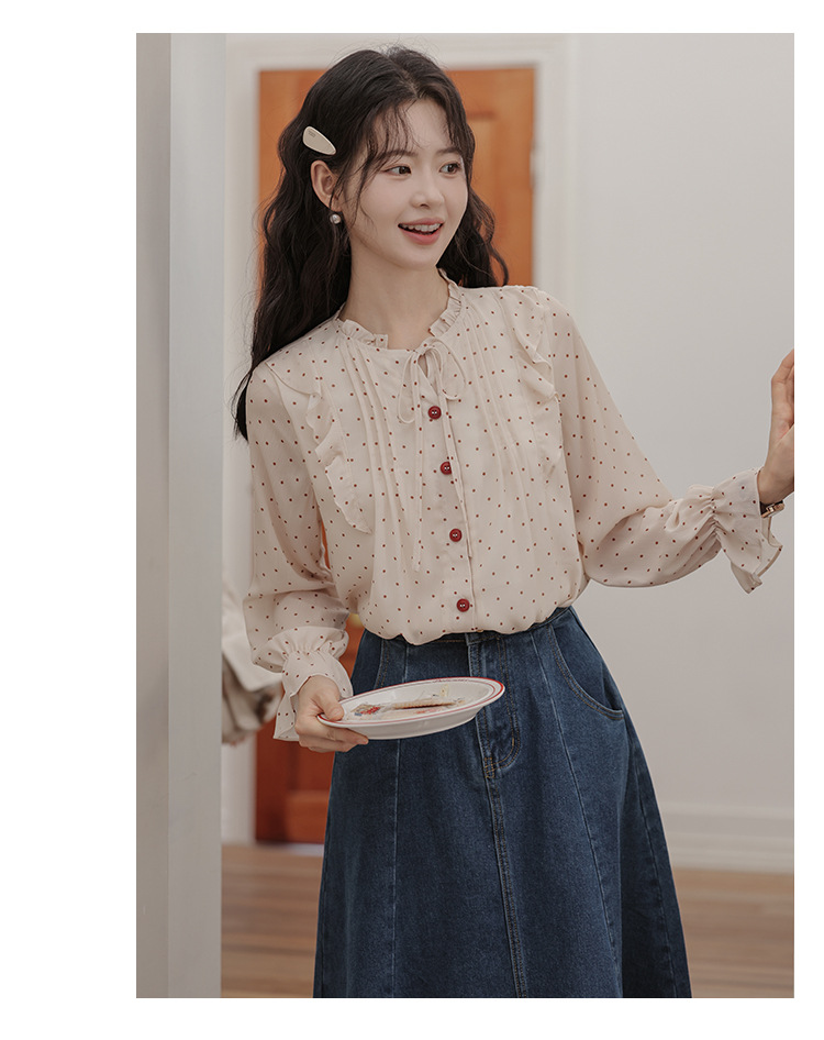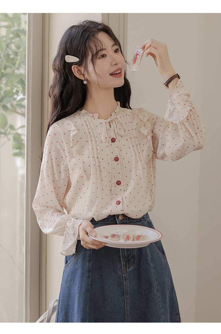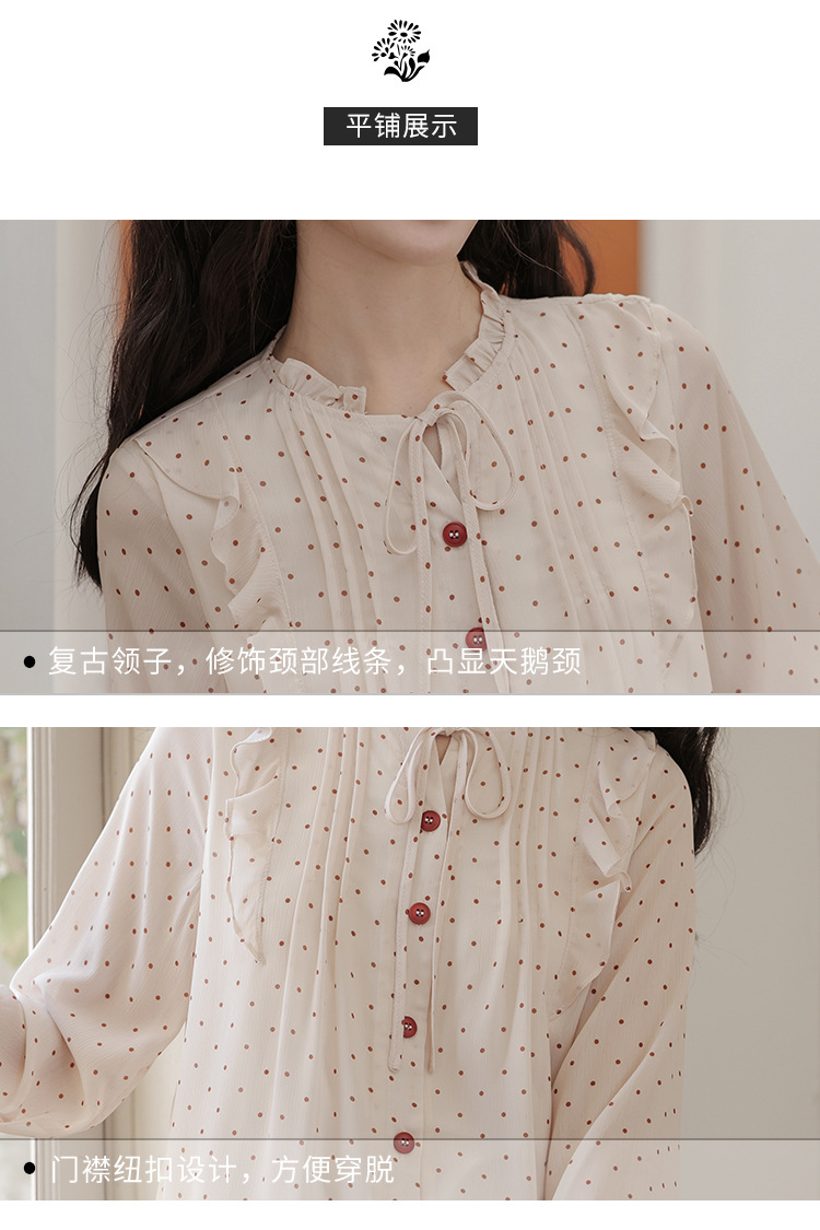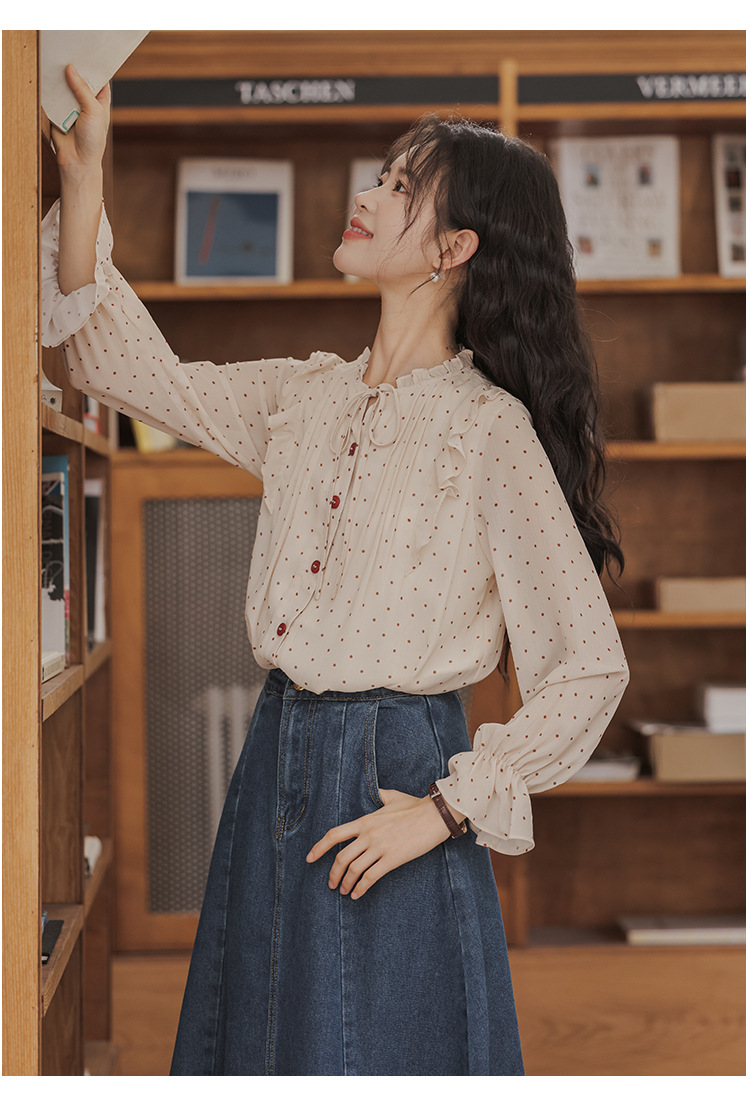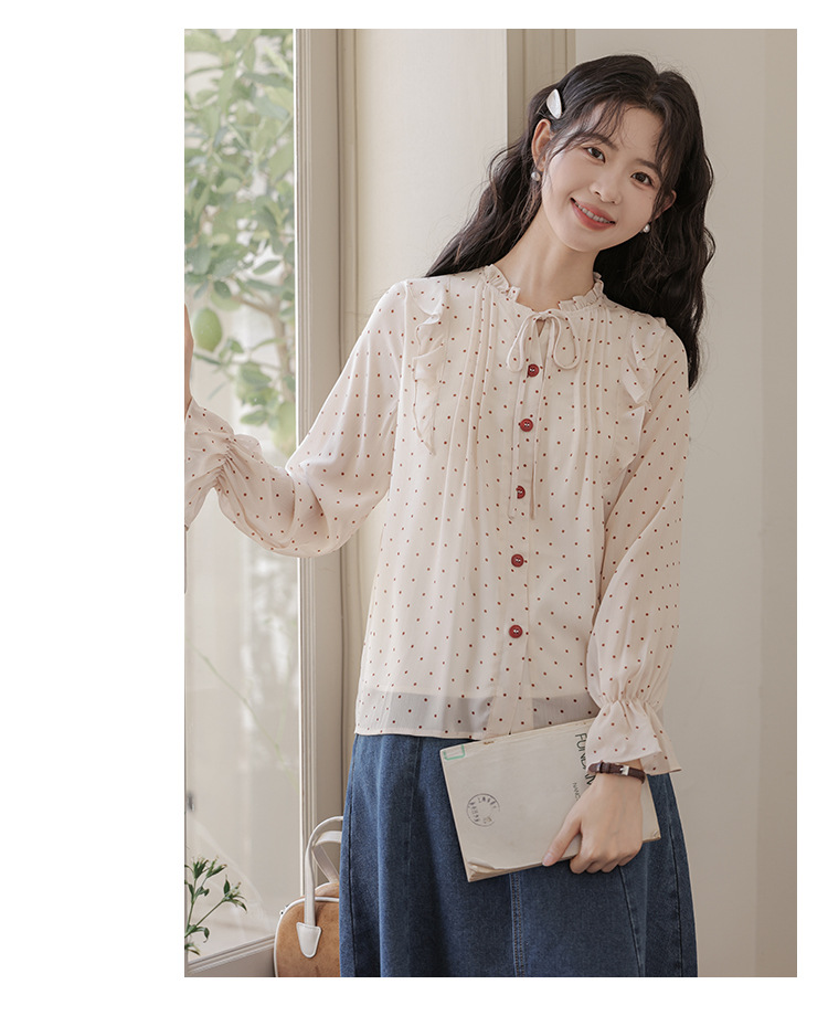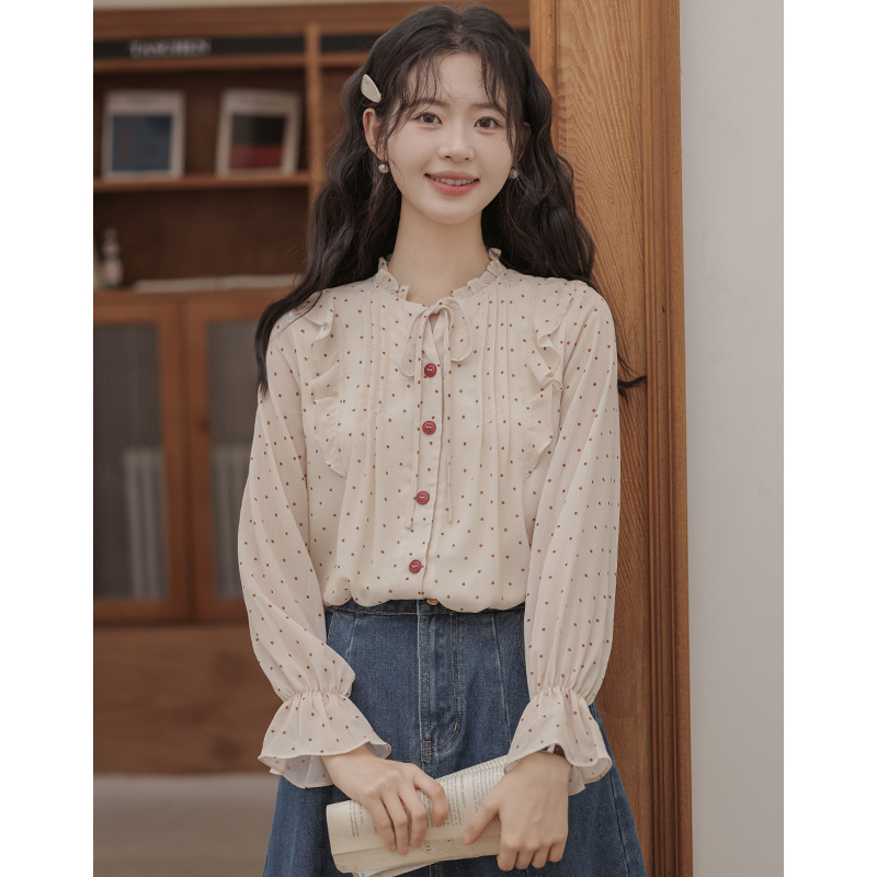2025 봄 새로운 한국 스타일 부드러운 웨이브 도트 러플 긴 소매 하프 오픈 넥 레이스 업 트럼펫 슬리브 부드러운 소녀 셔츠
