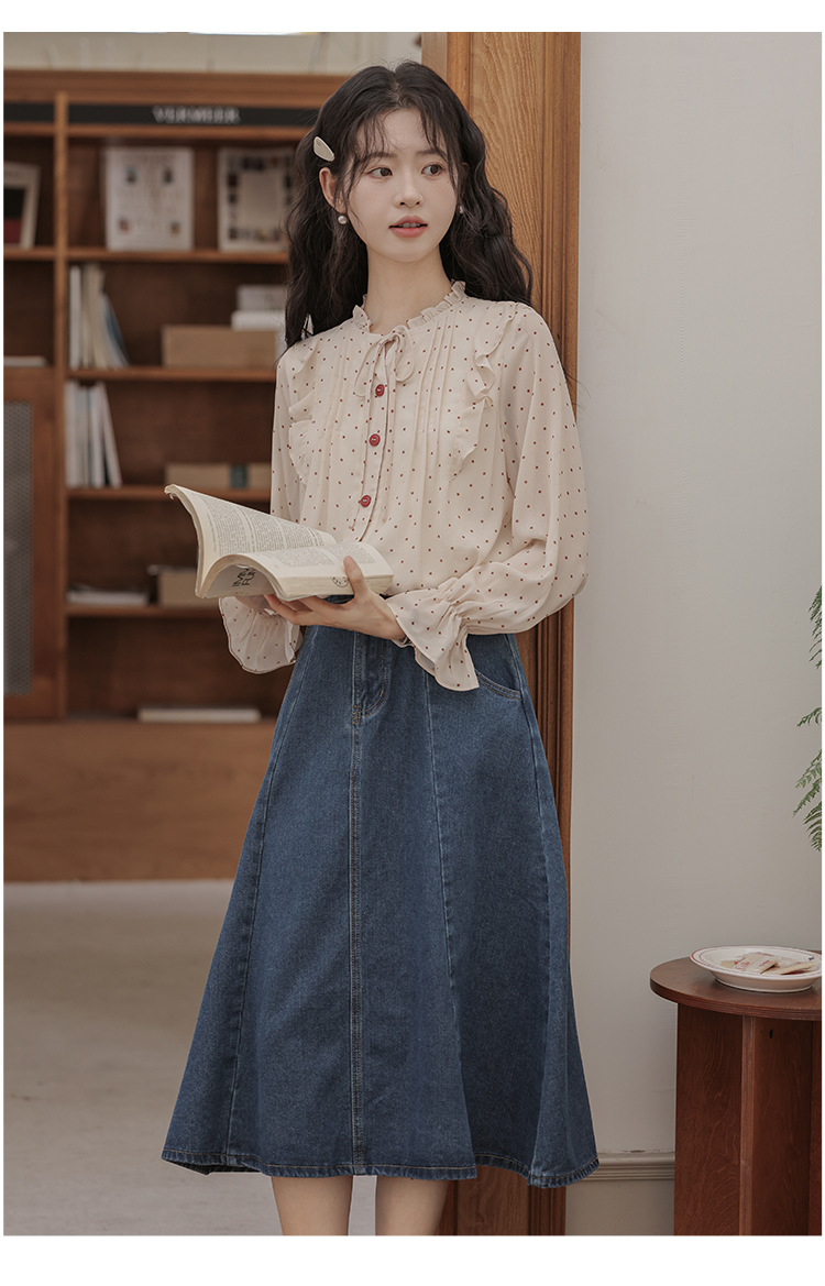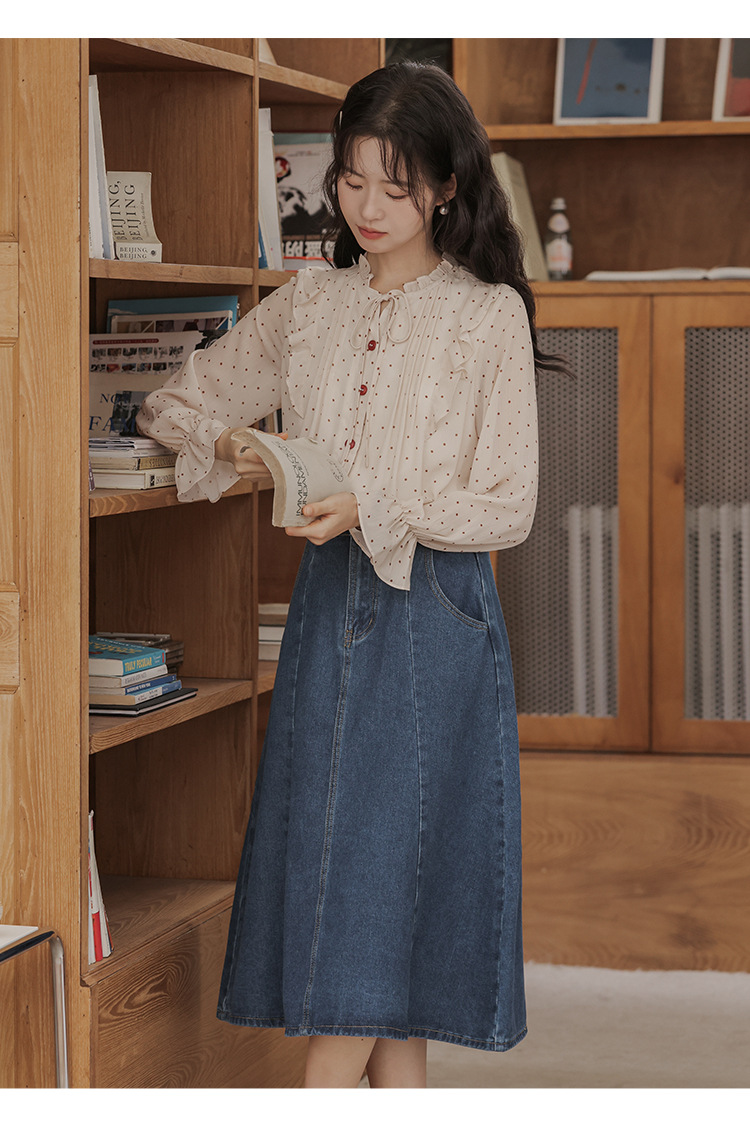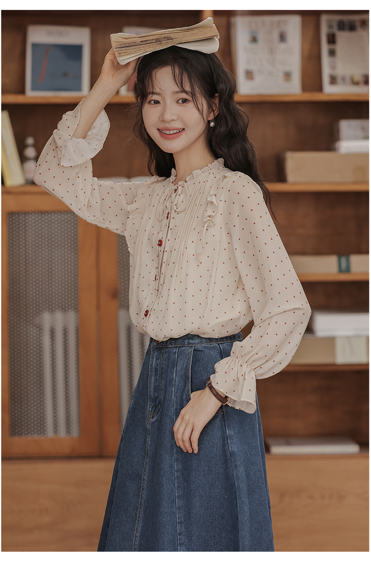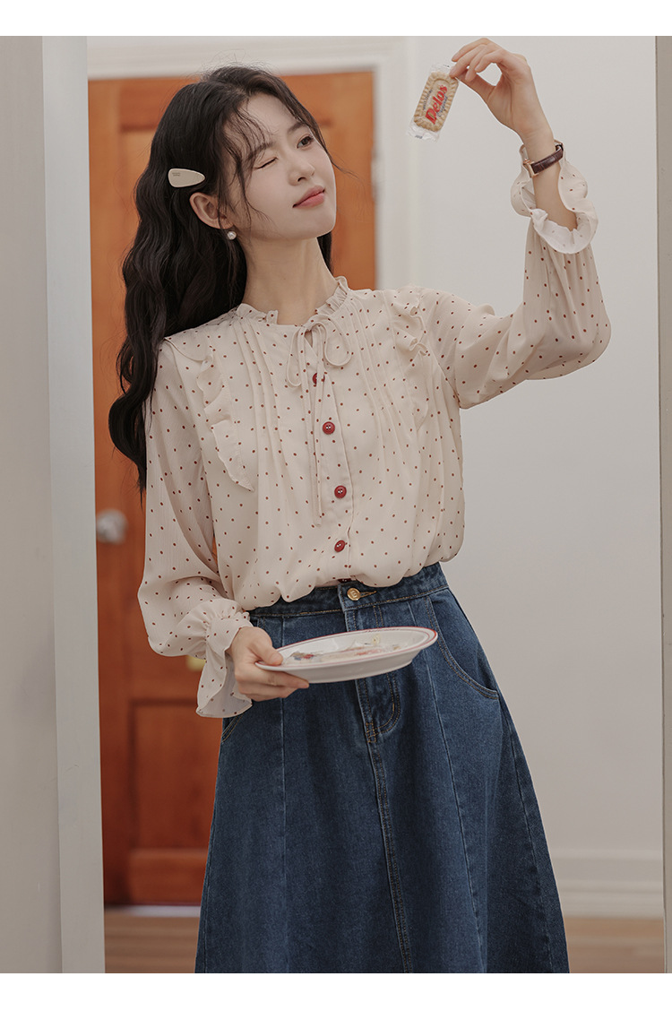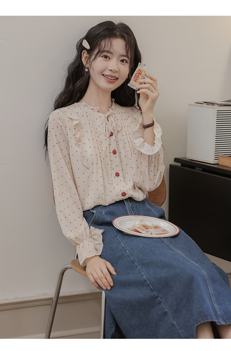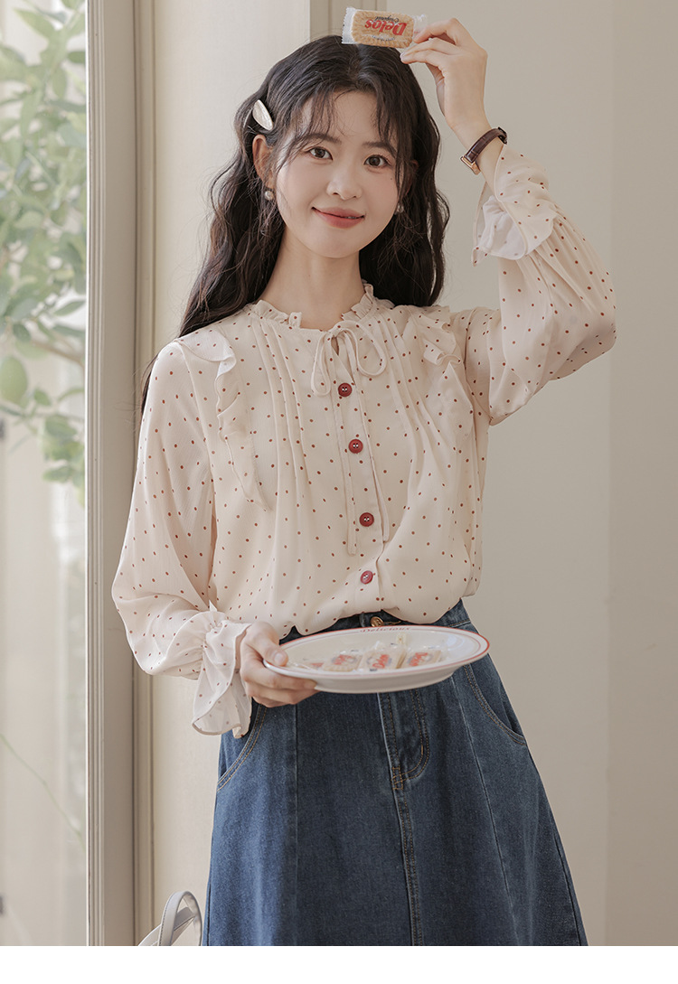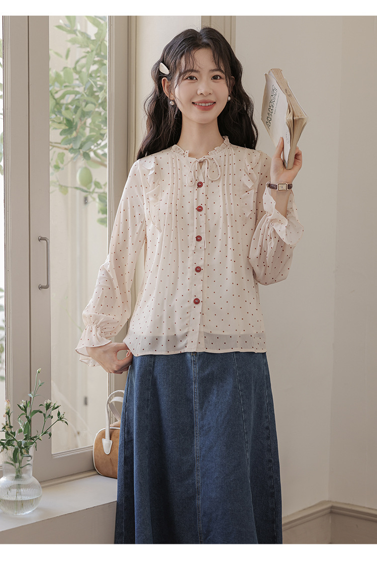 2025 봄 새로운 한국 스타일 부드러운 웨이브 도트 러플 긴 소매 하프 오픈 넥 레이스 업 트럼펫 슬리브 부드러운 소녀 셔츠