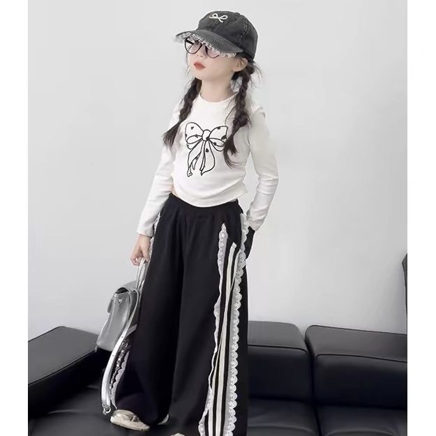 소녀 긴팔 티셔츠 2025 새로운 세트 어린이 가을 재킷 서양식 나비 바닥 옷 넓은 다리 바지스토어 가기