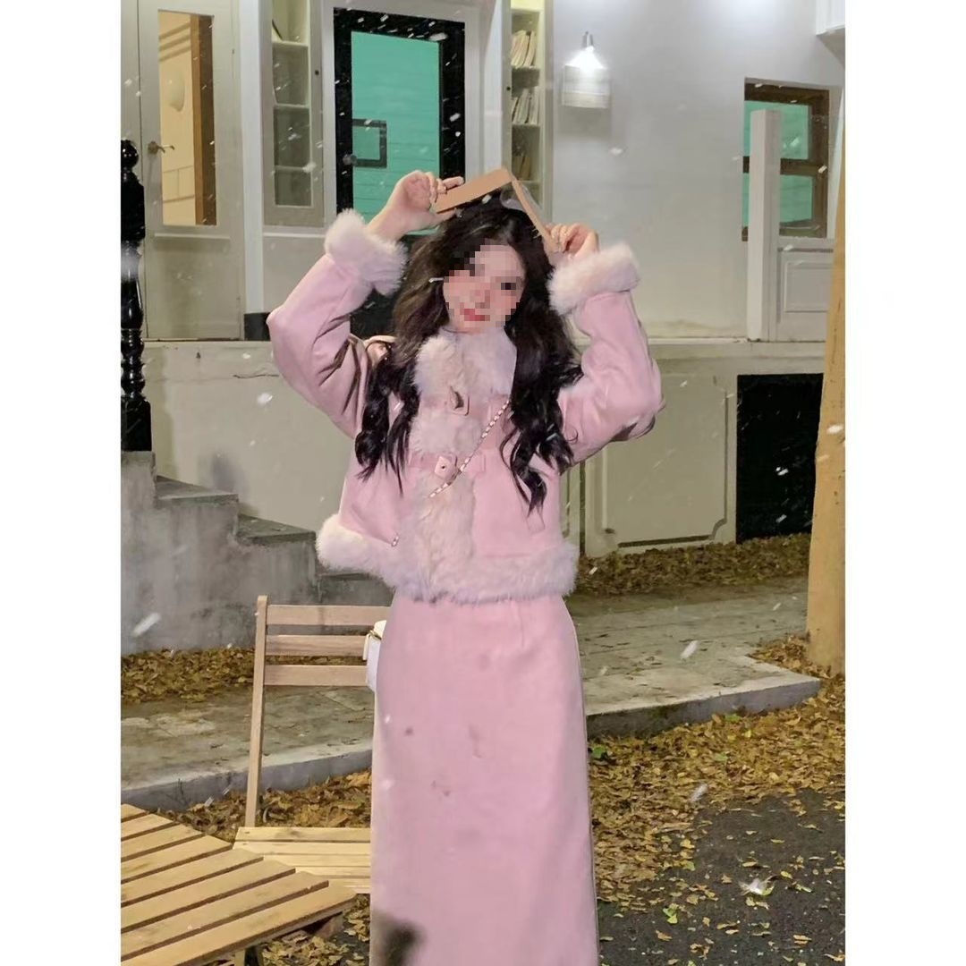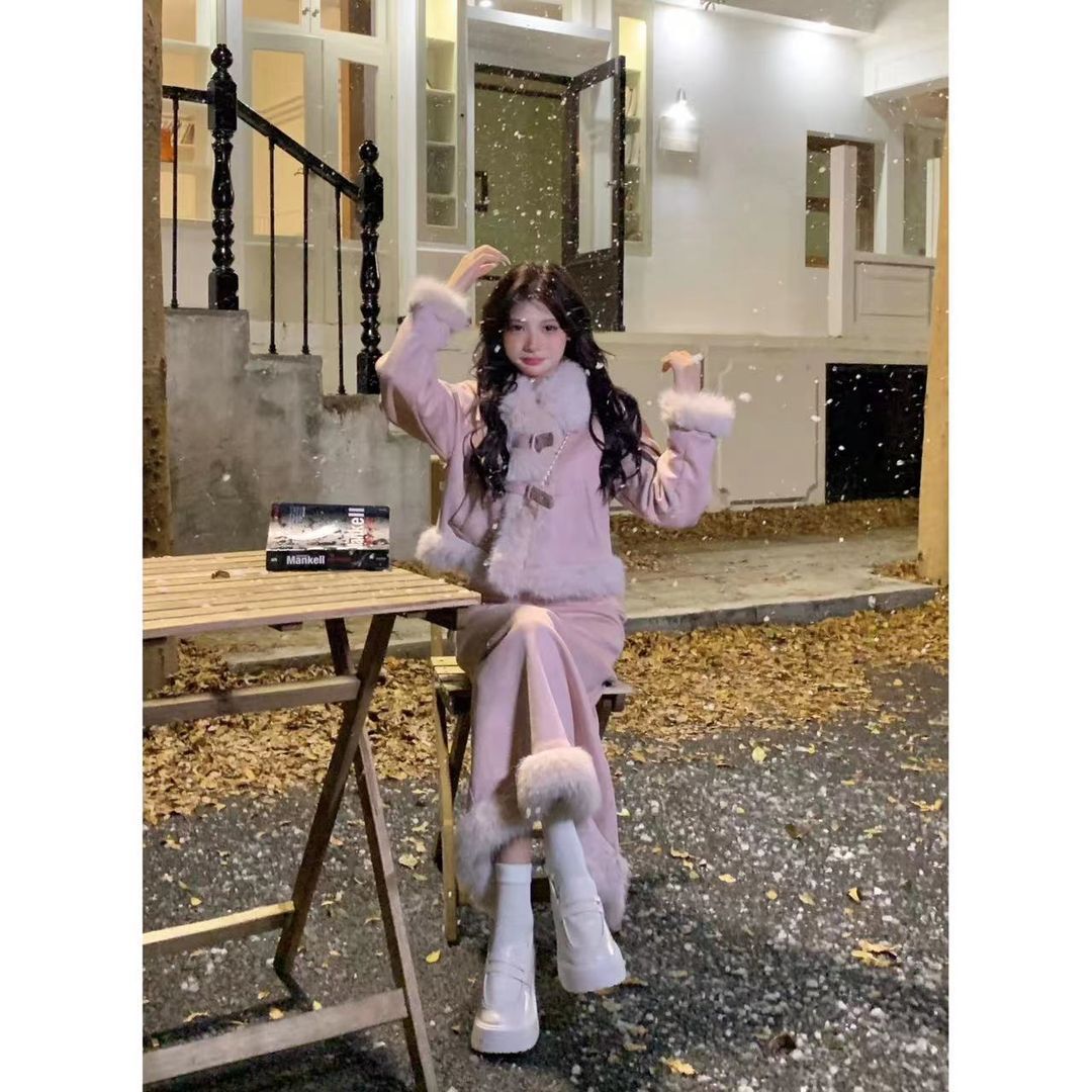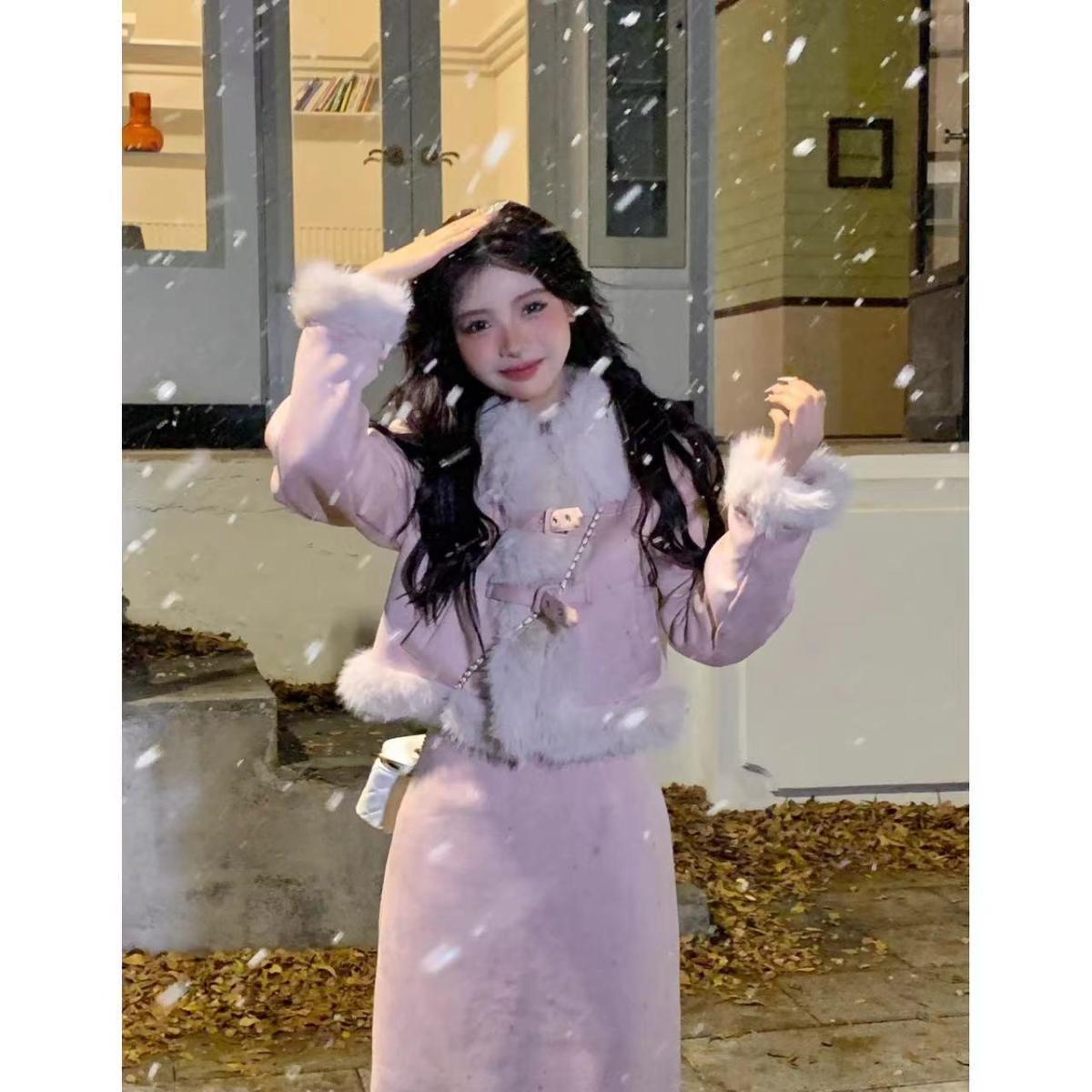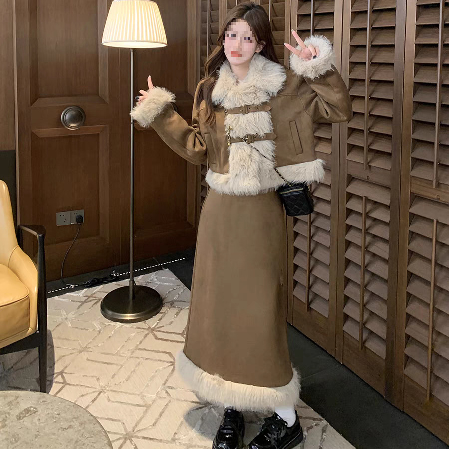 두 조각 가을 겨울 새로운 도착 유제품 모피 칼라 다크 브라운 스웨이드 퀼트 재킷 백 스플릿 스커트 세트 여성스토어 가기