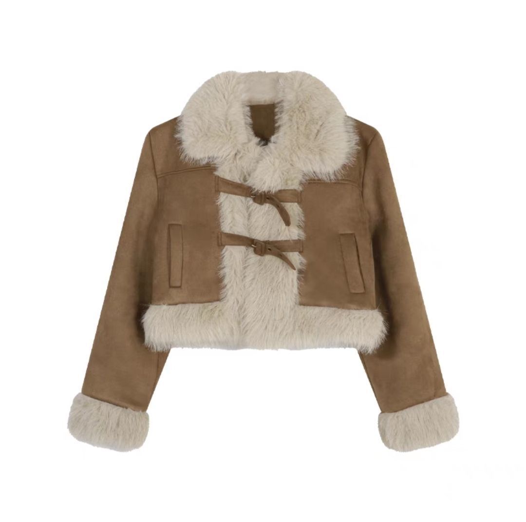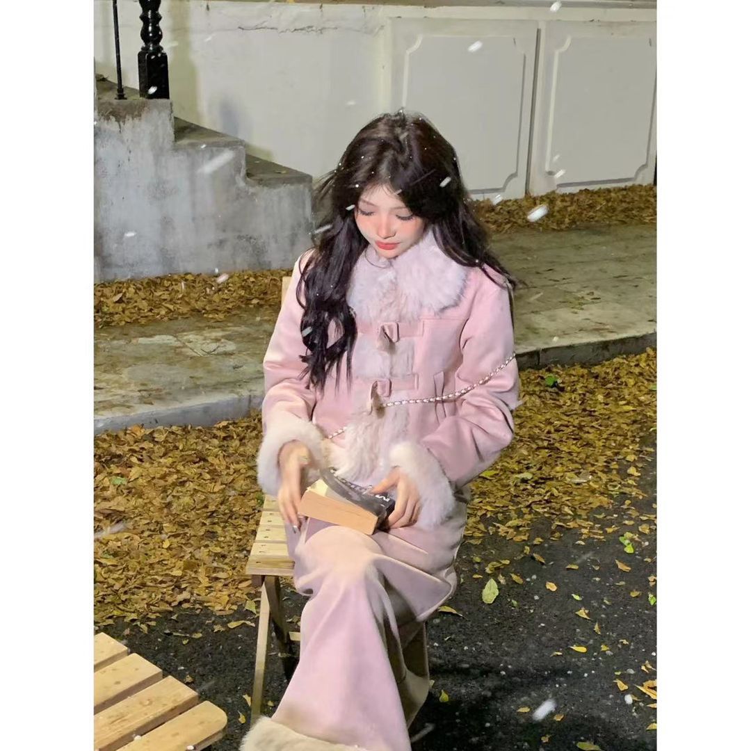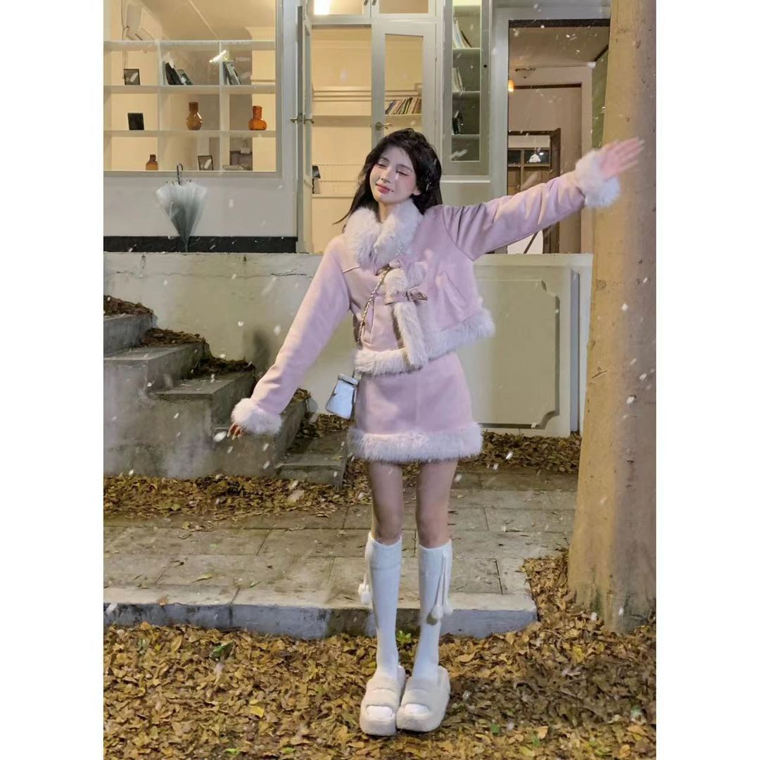 두 조각 가을 겨울 새로운 도착 유제품 모피 칼라 다크 브라운 스웨이드 퀼트 재킷 백 스플릿 스커트 세트 여성스토어 가기
