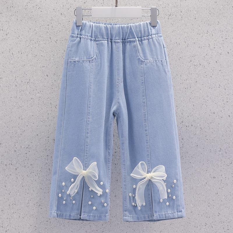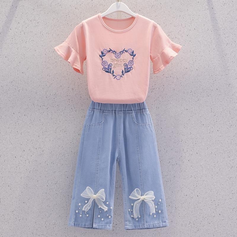 소녀 여름 자른 바지 세트 2025 서양식 유행 큰 어린이 인터넷-유명한 진주 청바지 어린이 투피스 세트