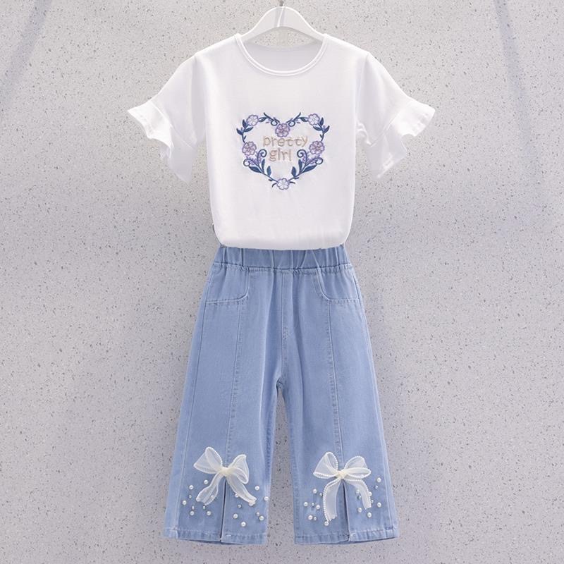 소녀 여름 자른 바지 세트 2025 서양식 유행 큰 어린이 인터넷-유명한 진주 청바지 어린이 투피스 세트스토어 가기