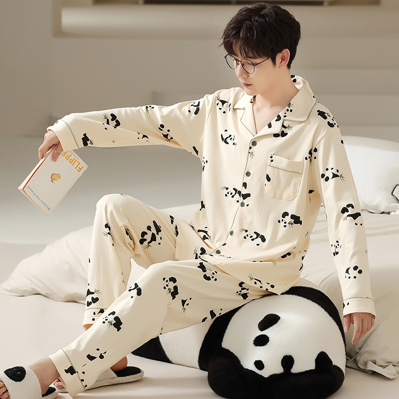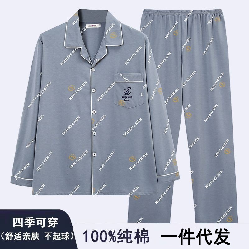 새로운 남성 잠옷 봄과 가을 긴 소매 바지 간단한 캐주얼 카디건 홈 옷은 가을 세트 입을 수 있습니다