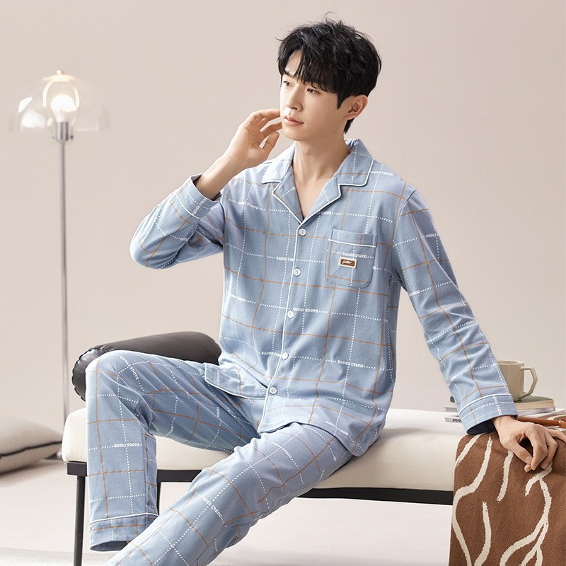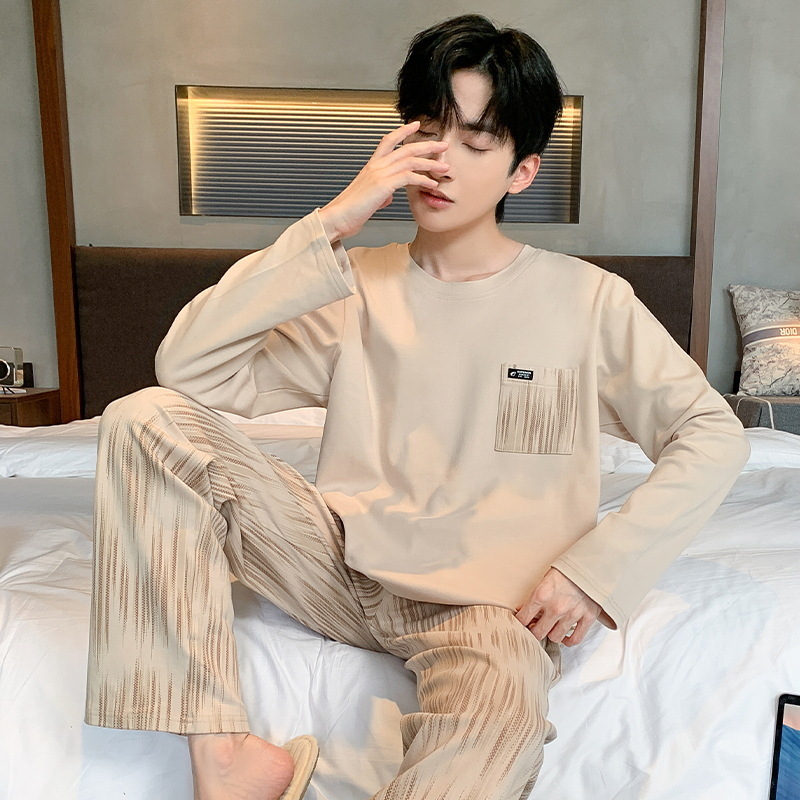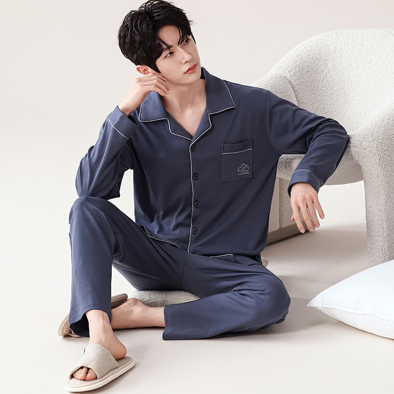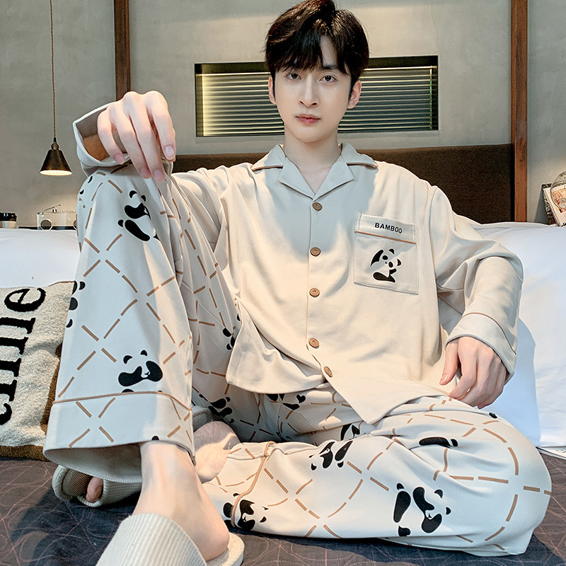 새로운 남성 잠옷 봄과 가을 긴 소매 바지 간단한 캐주얼 카디건 홈 옷은 가을 세트 입을 수 있습니다스토어 가기