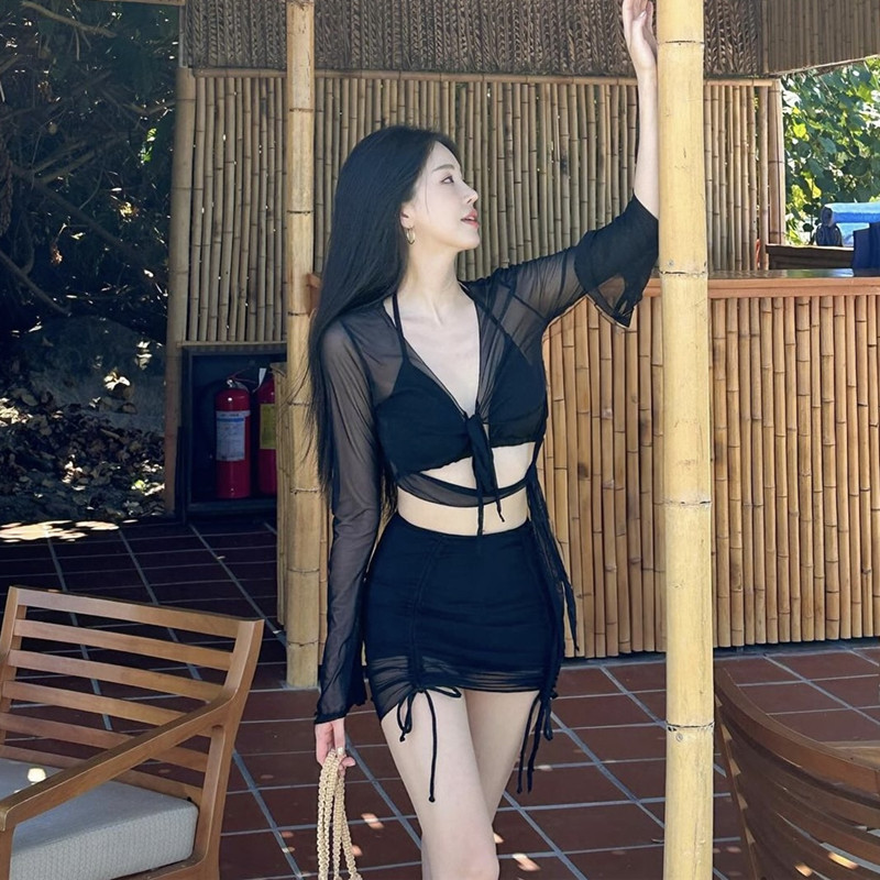 여성용 고급 얇은 명주 반투명 긴팔 자외선 차단제 블라우스 3 피스 스커트 비키니 스플릿 수영복스토어 가기