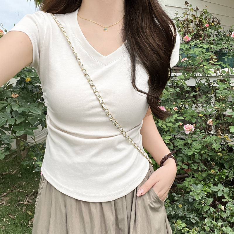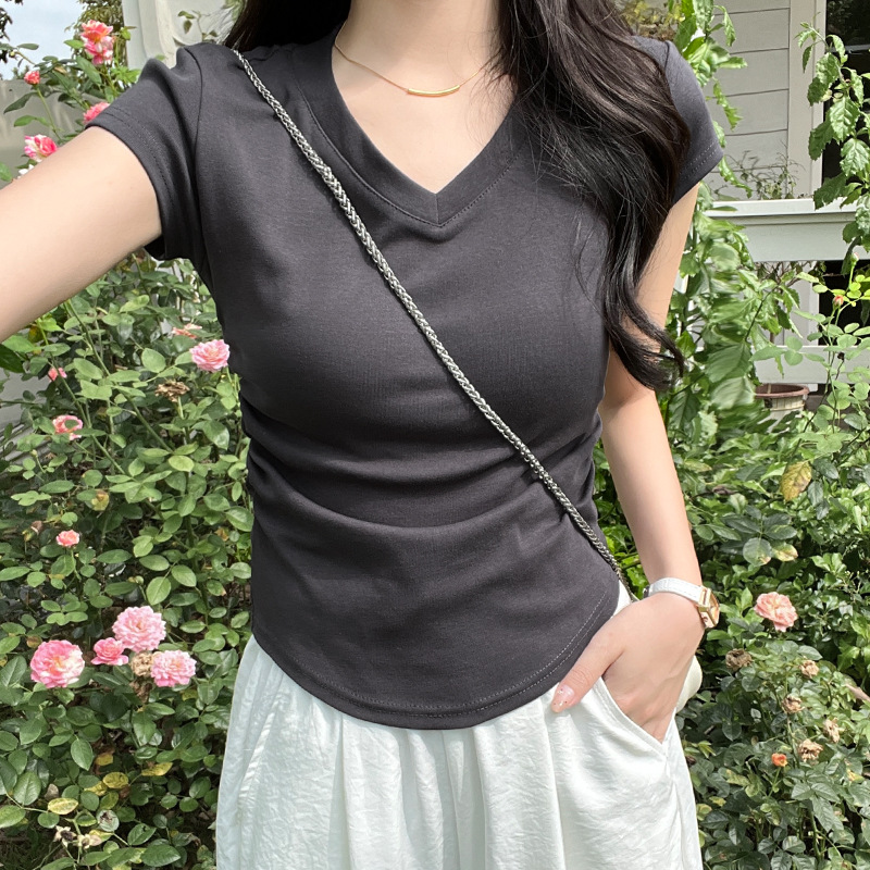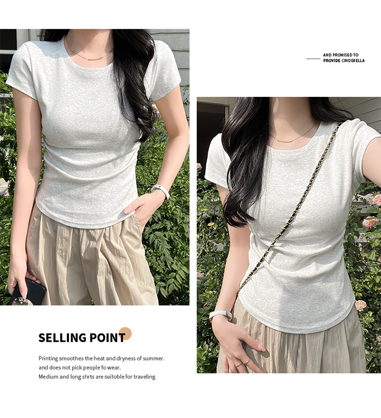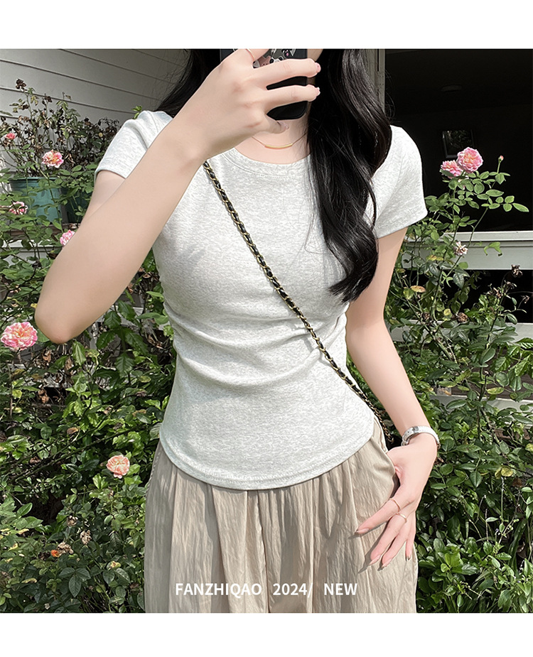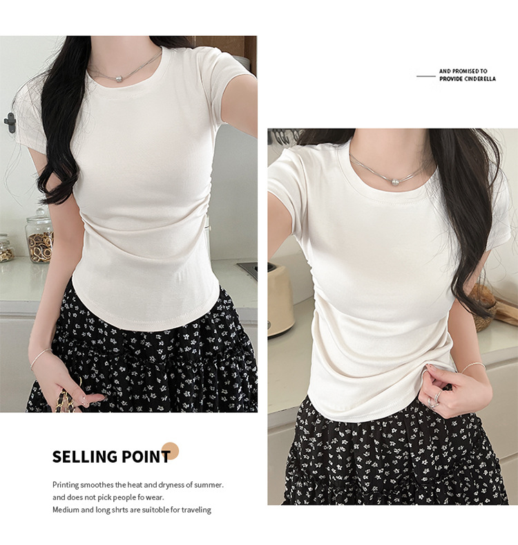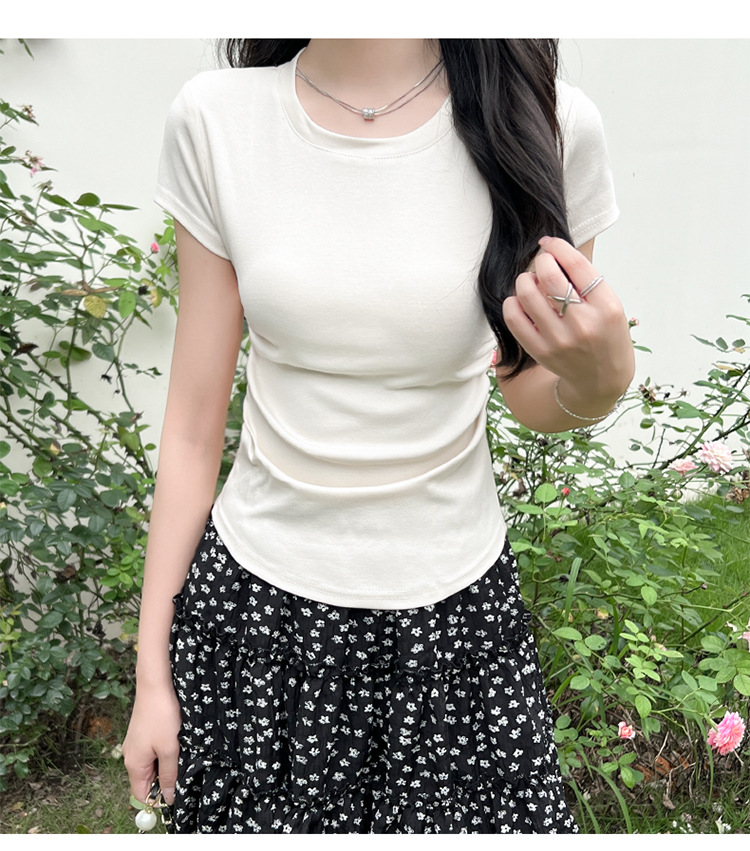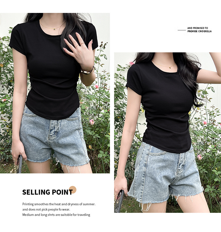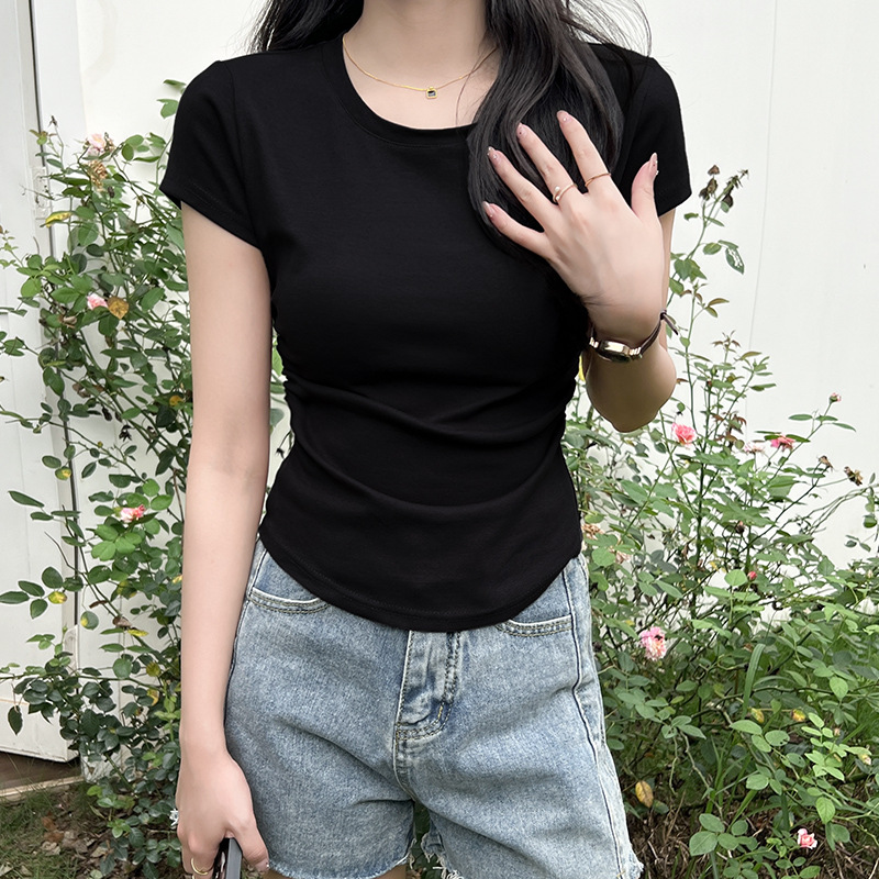디자인 센스 작은 어깨 순수 코튼 라운드 넥 반팔 티셔츠 여성용 여름 스파이스 걸스 짧은 하이 허리 슬림 핏 올매치 탑