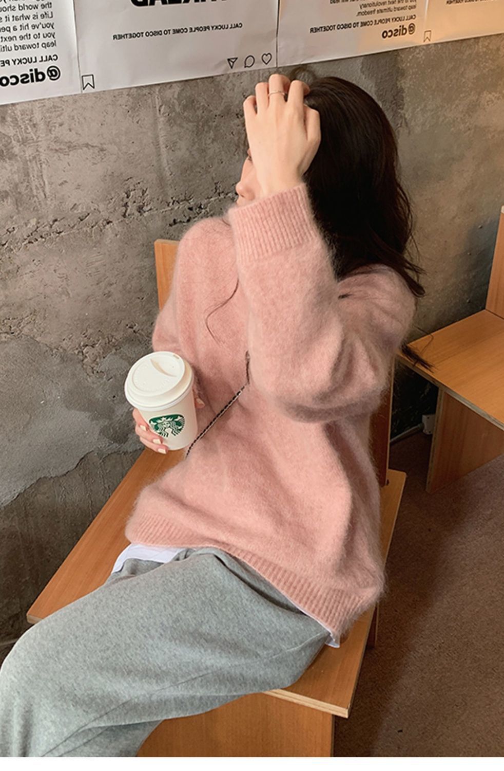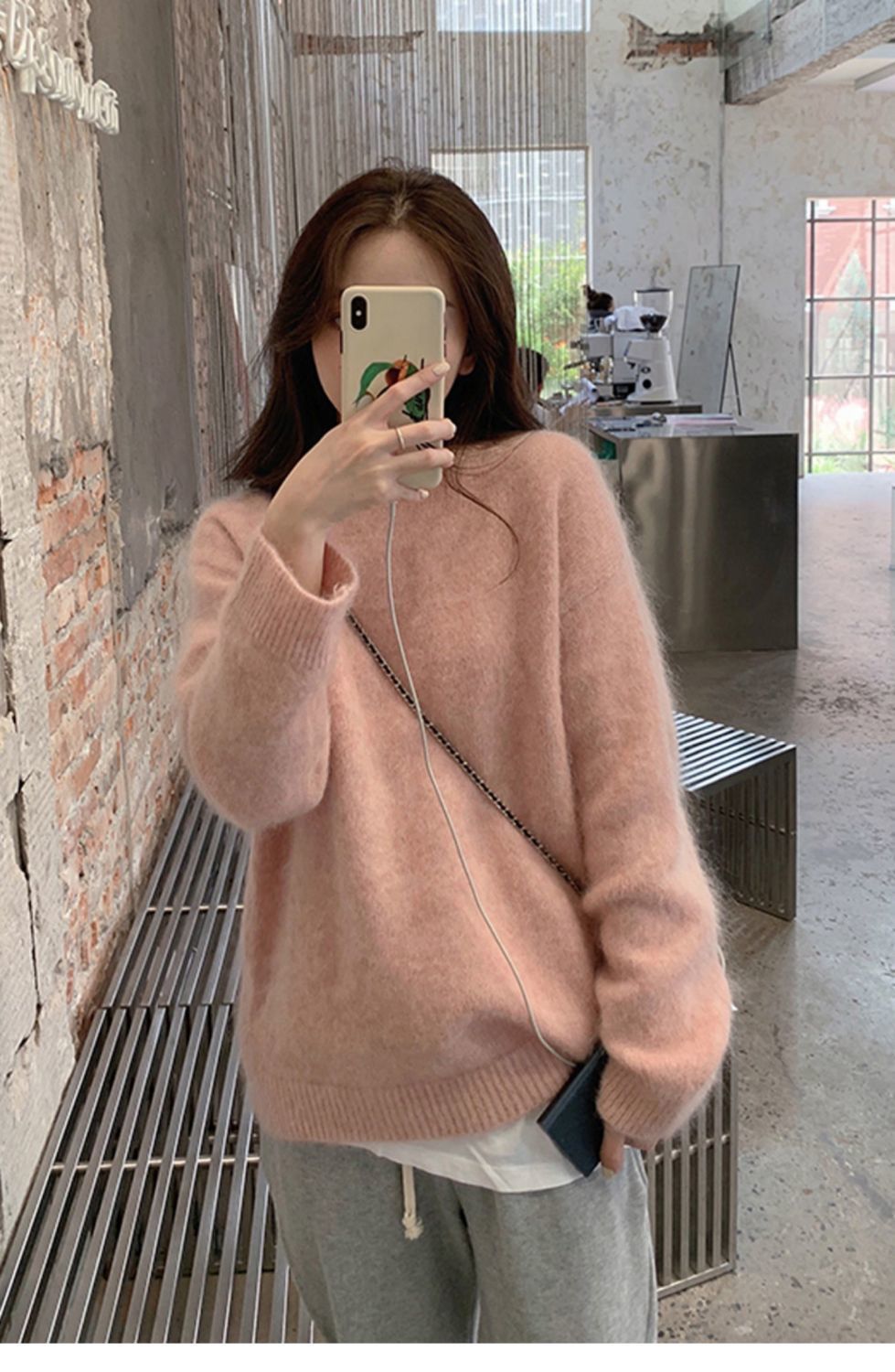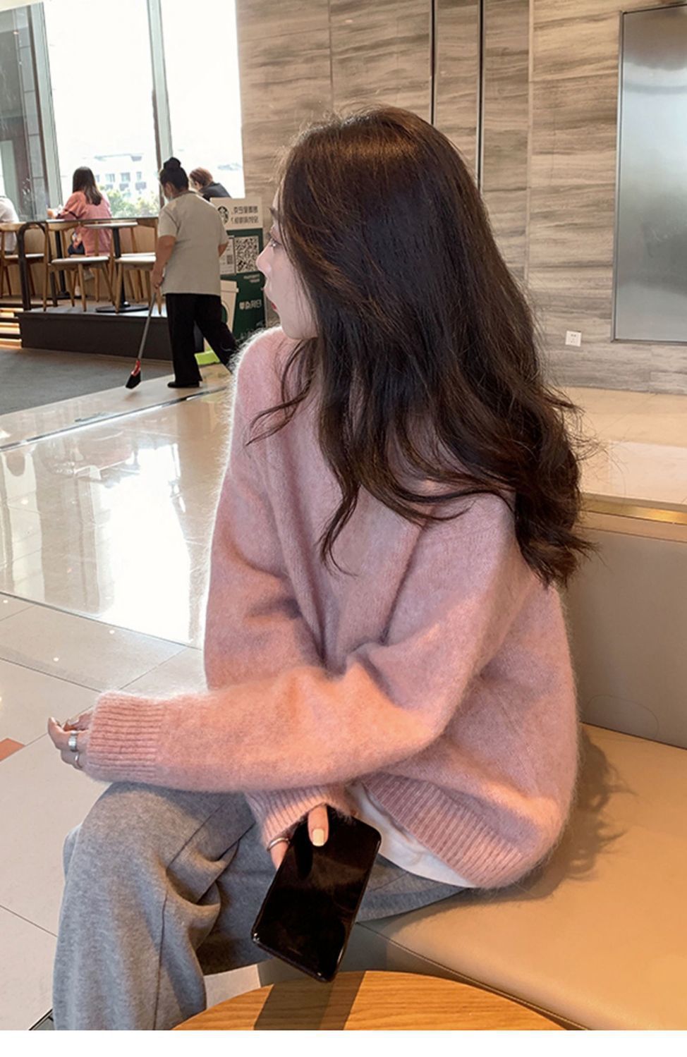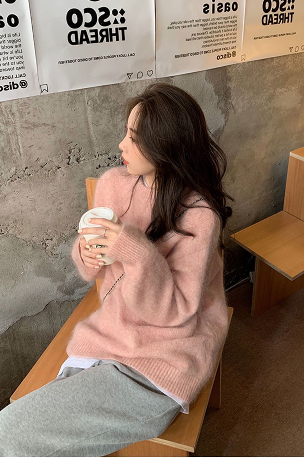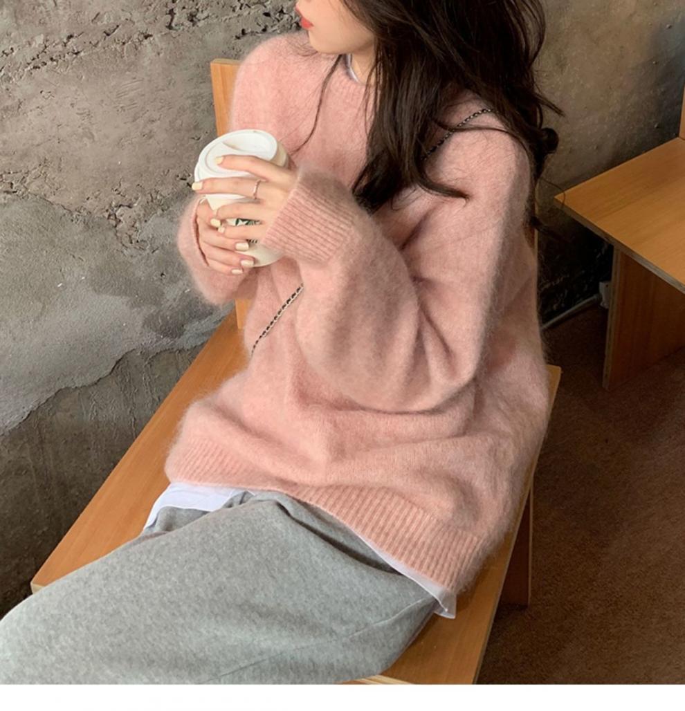 2024 년 가을과 겨울 새로운 모리 젠틀 게으른 스타일 니트 탑 모조 밍크 벨벳 부드러운 왁스 모방 마헤어 스웨터스토어 가기