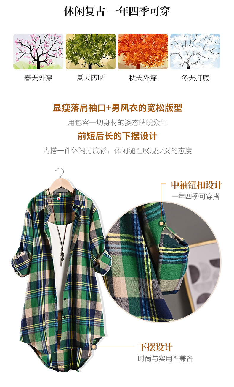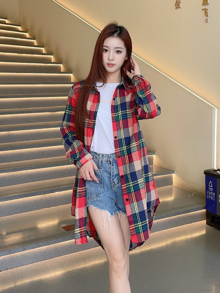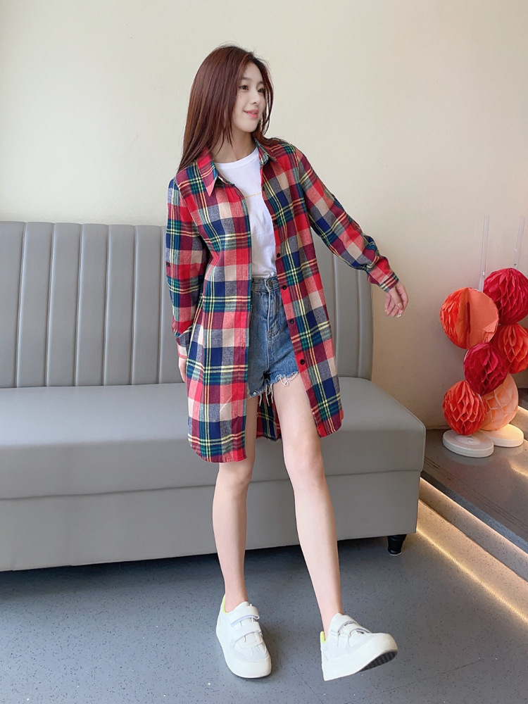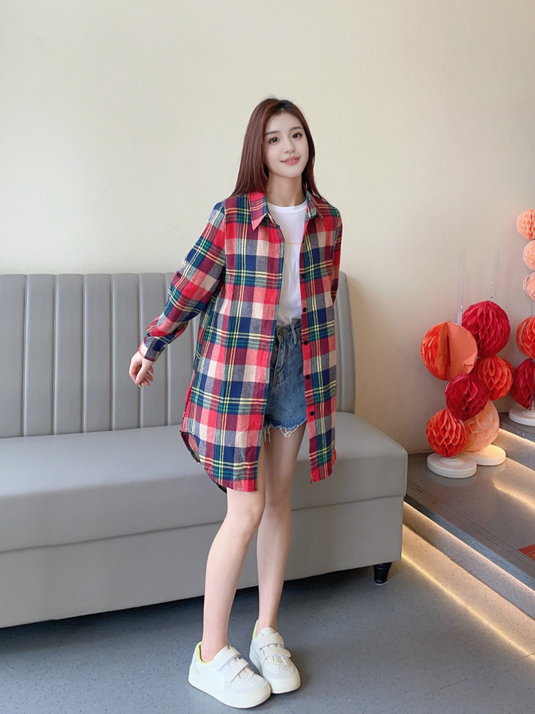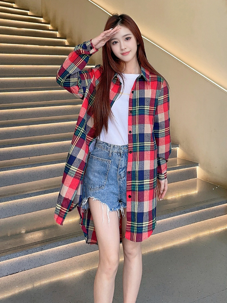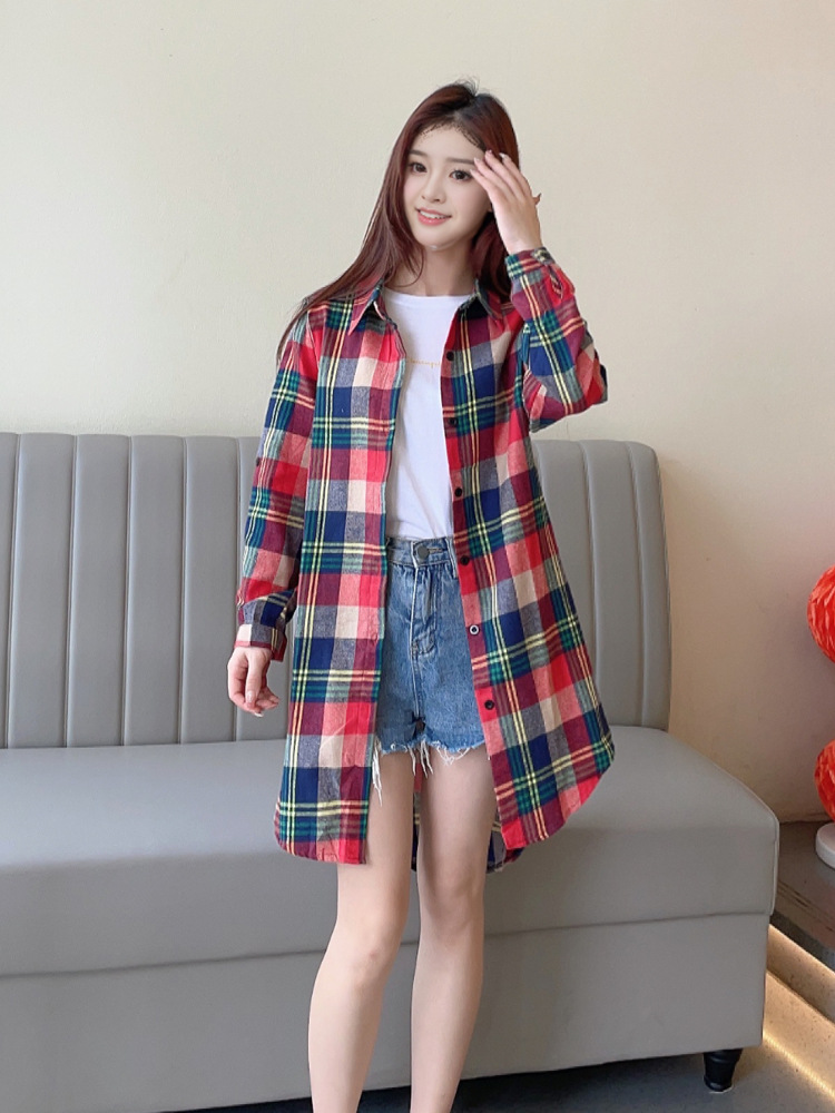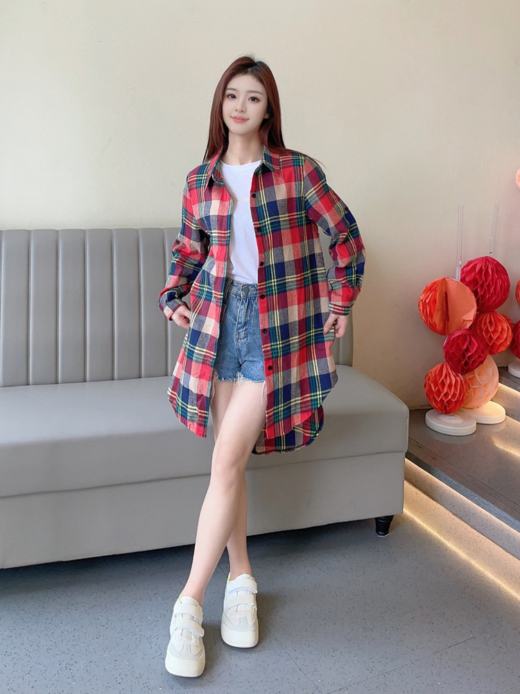 빨간 격자 무늬 셔츠 여성의 중간 길이의 봄과 가을 얇은 외투와 리넨 셔츠 긴 소매 선스크린 셔츠 서양식 최고 디자인 감각
