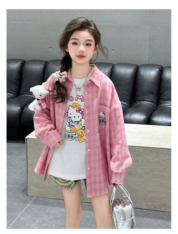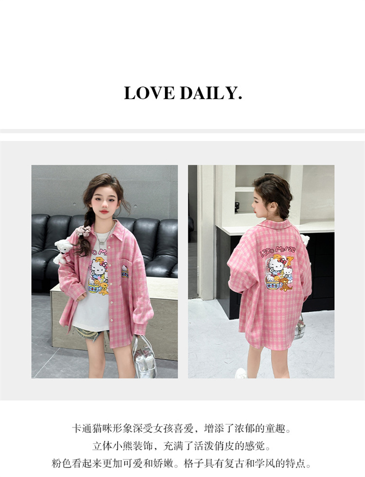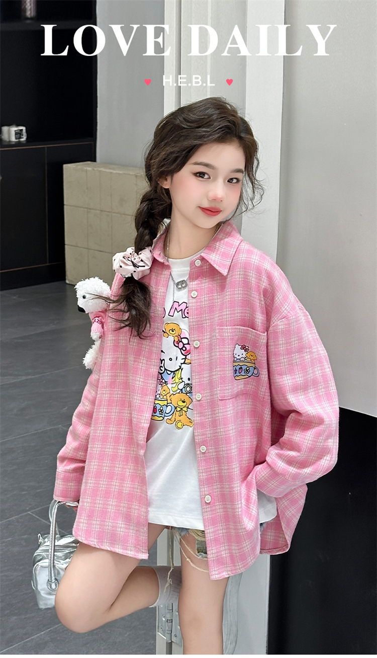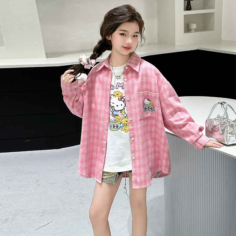 2025 여자 셔츠 새로운 봄, 가을 의류 어린이 중대형 어린이 스타일 격자 무늬 셔츠 가을 중간 길이상의