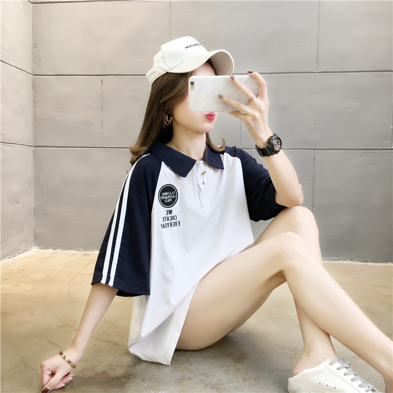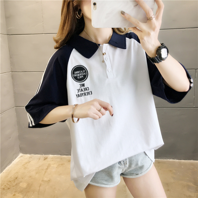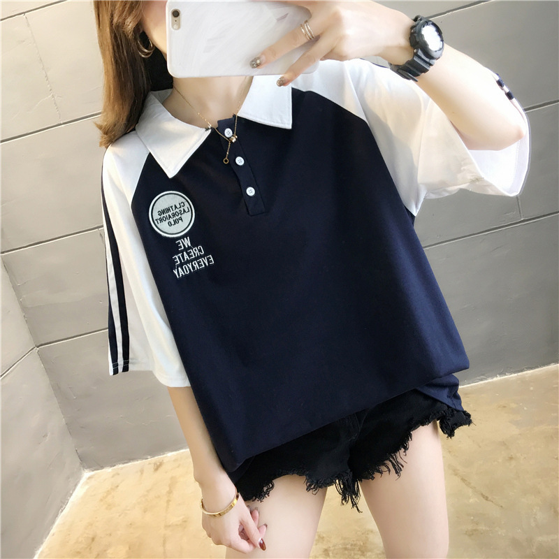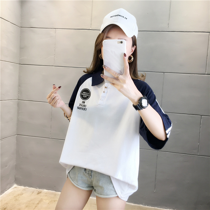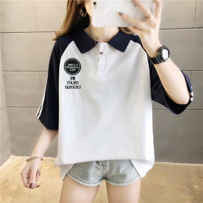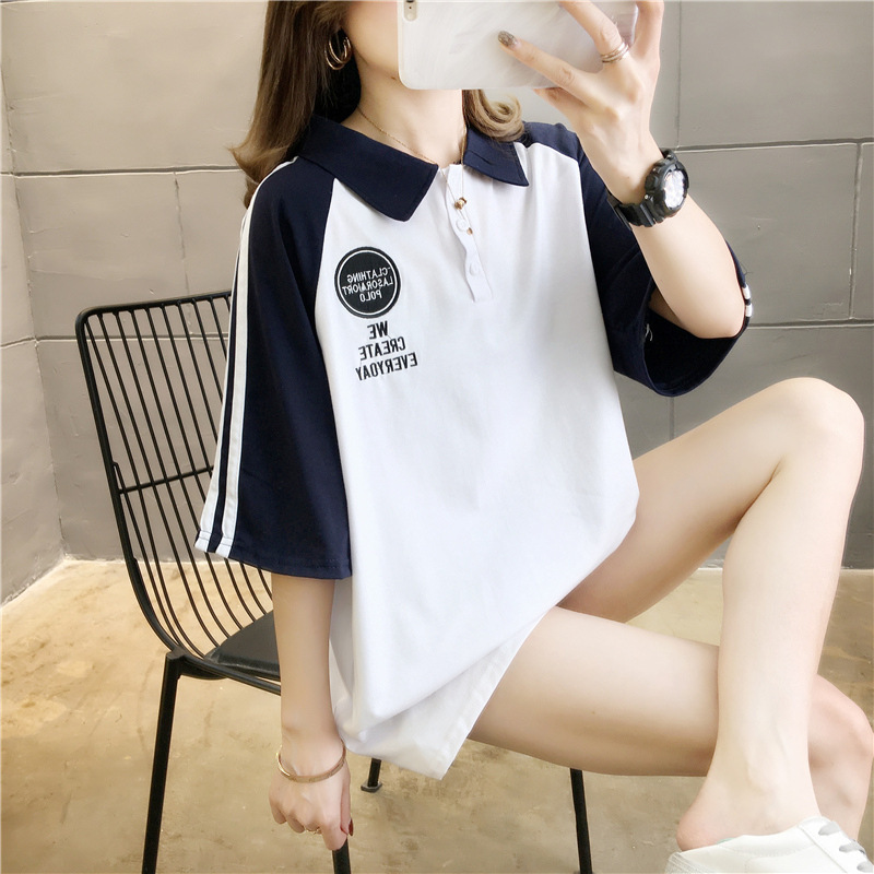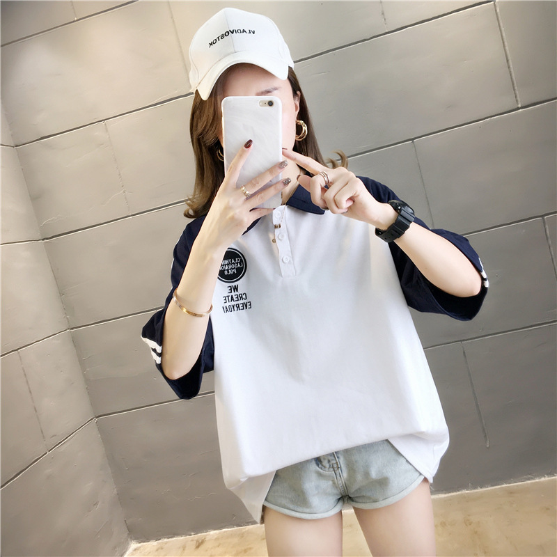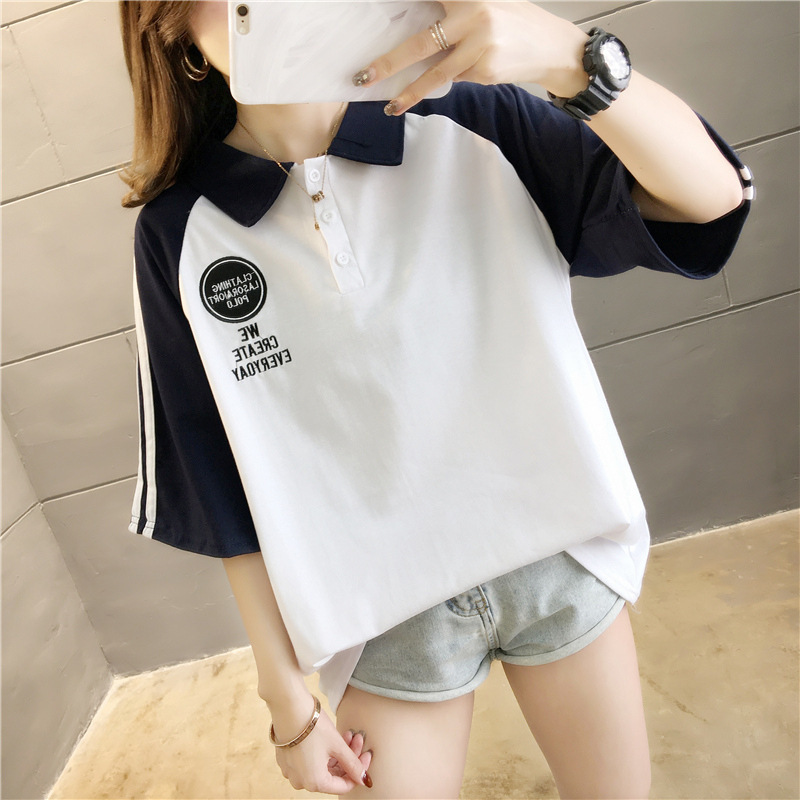 면 반팔 티셔츠 소녀 여름 2025 새로운 중학교 고등학생 느슨한 POLO 셔츠 옷깃 옷스토어 가기