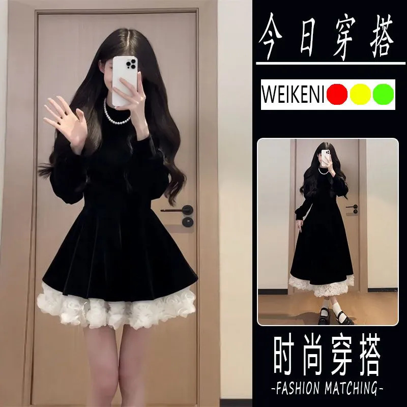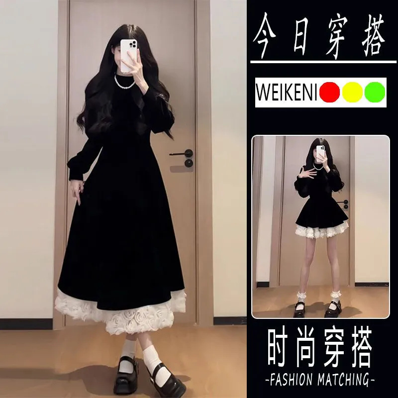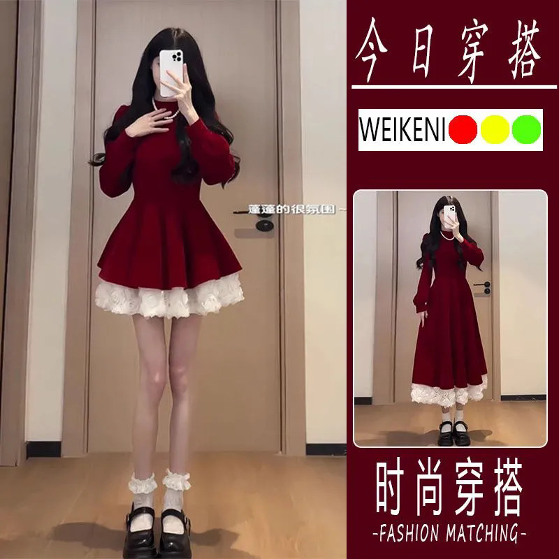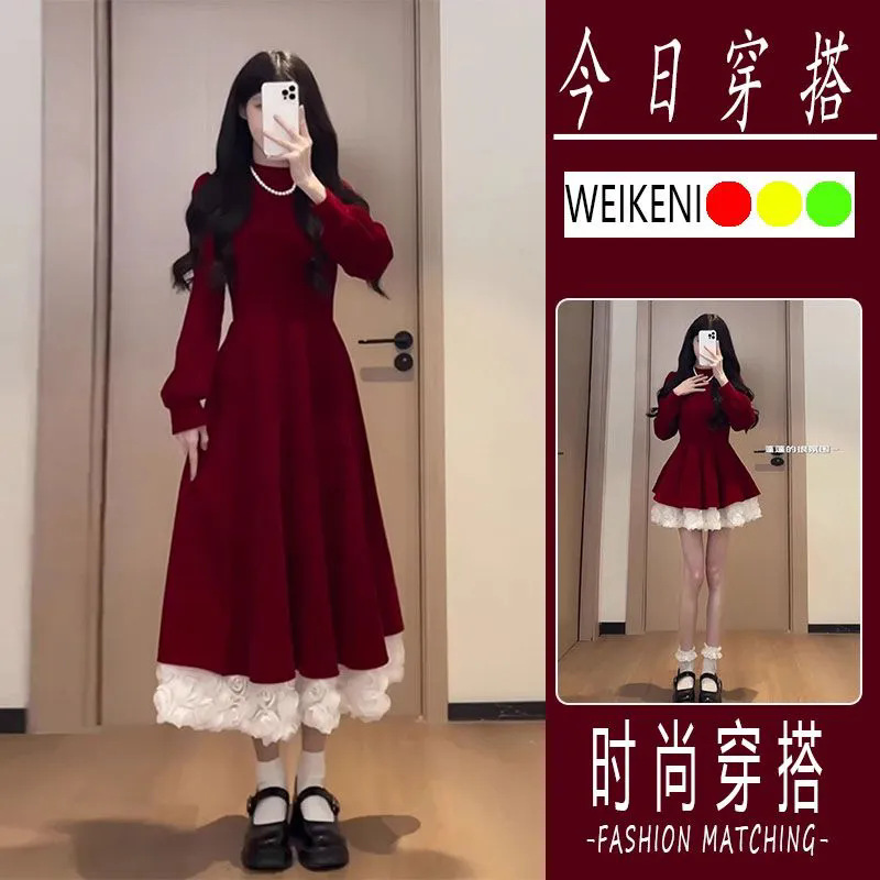 패션 헵번 스타일 원피스 여성의 2024 년 가을과 겨울 새해 크리스마스 착용 허리 긴 스티칭 A 라인 스커트스토어 가기