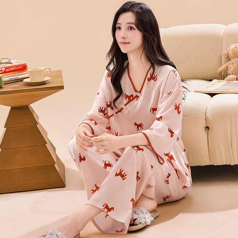 새로운 중국 잠옷 여성의 봄 여름과 가을 새로운면 실크 버튼 자른 소매 바지 달콤한 Guofeng 홈 의류 세트스토어 가기