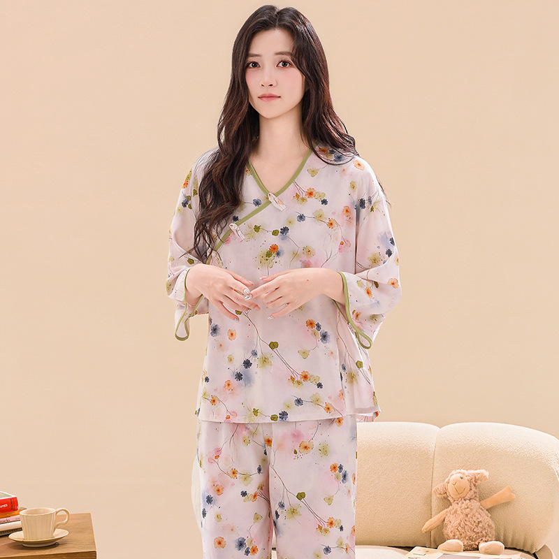 새로운 중국 잠옷 여성의 봄 여름과 가을 새로운면 실크 버튼 자른 소매 바지 달콤한 Guofeng 홈 의류 세트