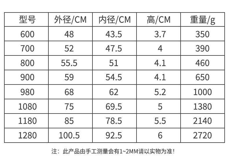 • 1280 내경 92.5cm, 높이 6cm, 무게 2720g