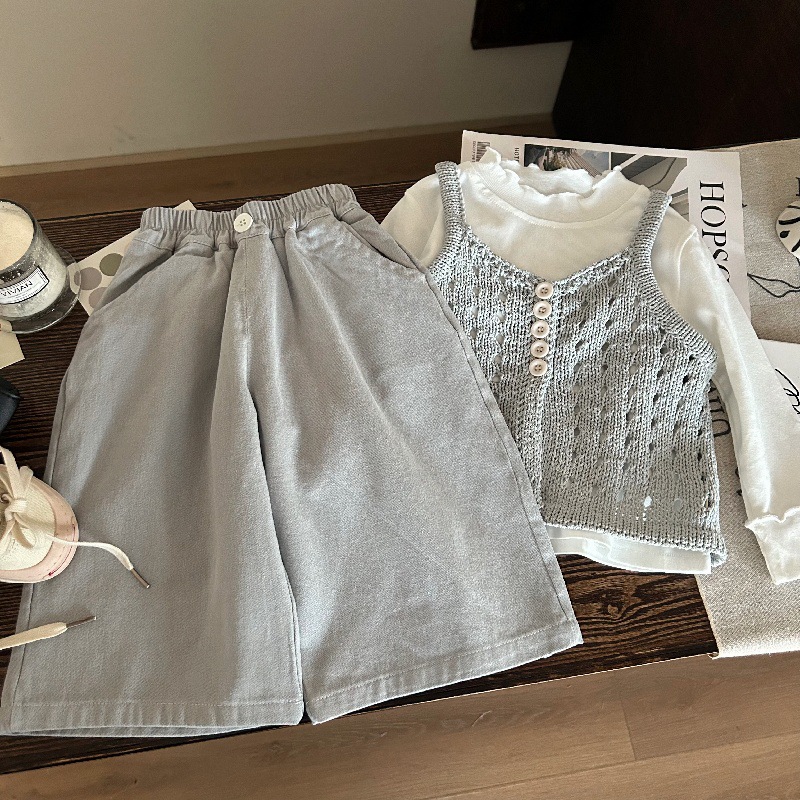 한국 아동복 2025 새 봄 소녀 올 매치 바닥 셔츠 어린이 캐주얼 서스펜더 셔츠 와이드 레그 팬츠 3 피스 세트스토어 가기