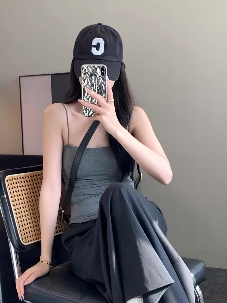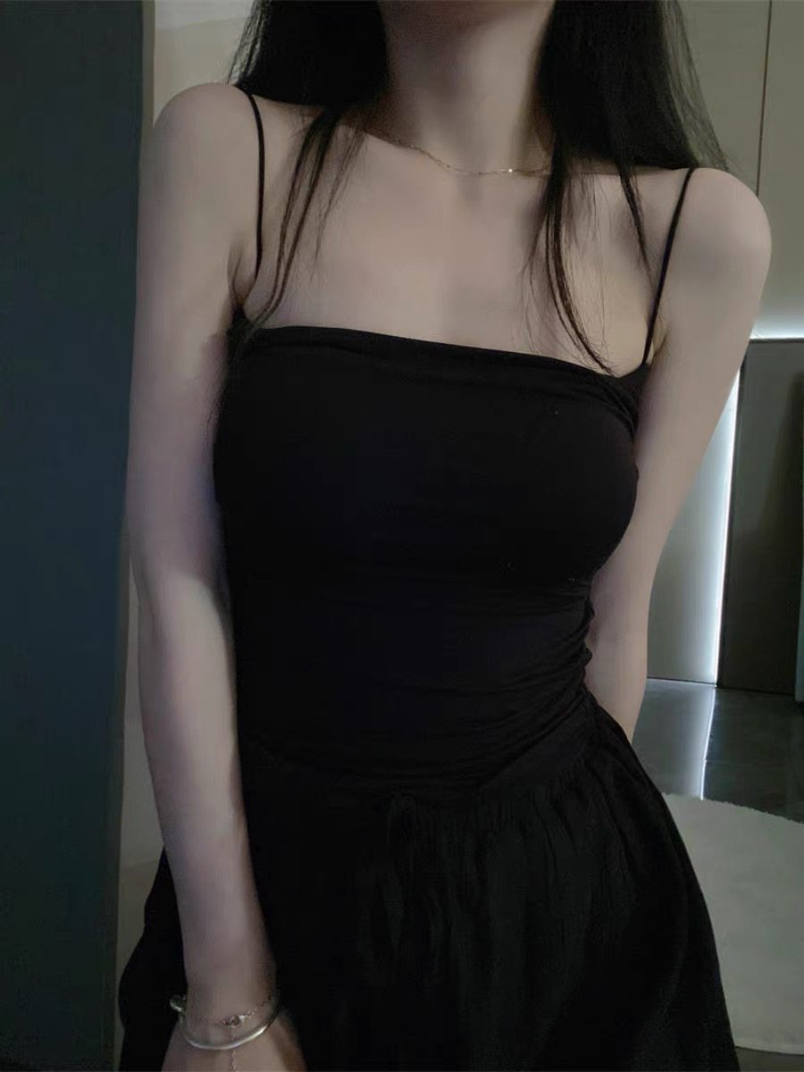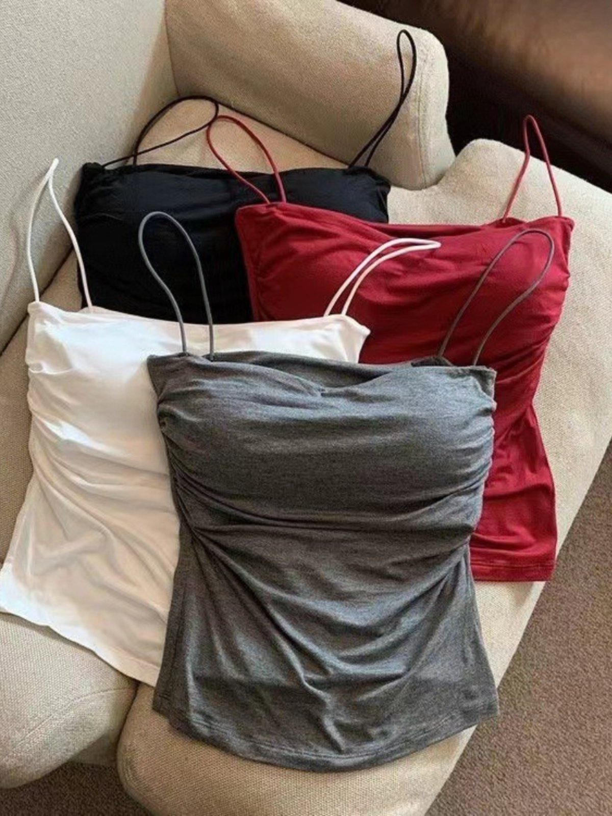여름 심플 올 매치 솔리드 컬러 플리츠 올 매치 클래식 아우터웨어 슬링 조끼, 가슴 패드와 아름다운 뒤 섹시한 여성 탑
