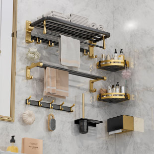 免打孔浴室置物毛巾架 卫生间黑金太空铝浴巾架卫浴五金挂件套装
