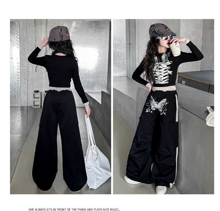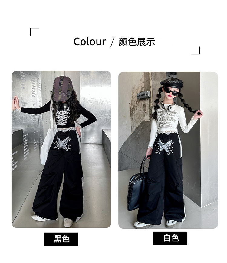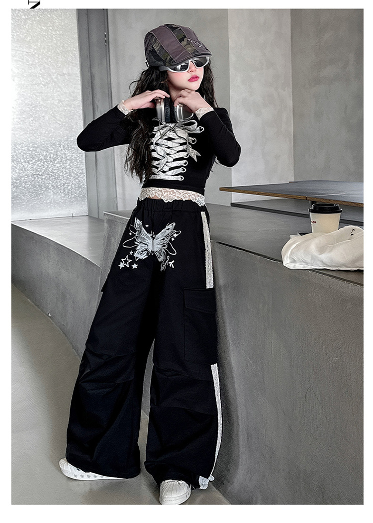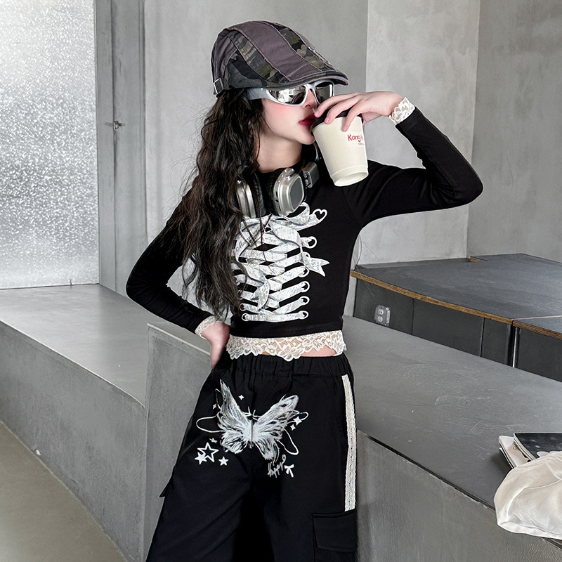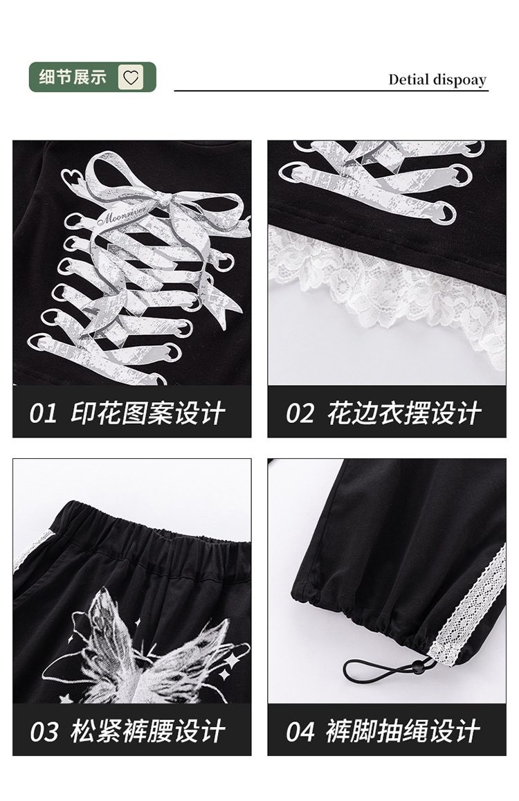 소녀 세트 레이스 프린트 탑 나비 크록 바지 투피스 세트 2025 새로운 어린이 봄과 가을 패션