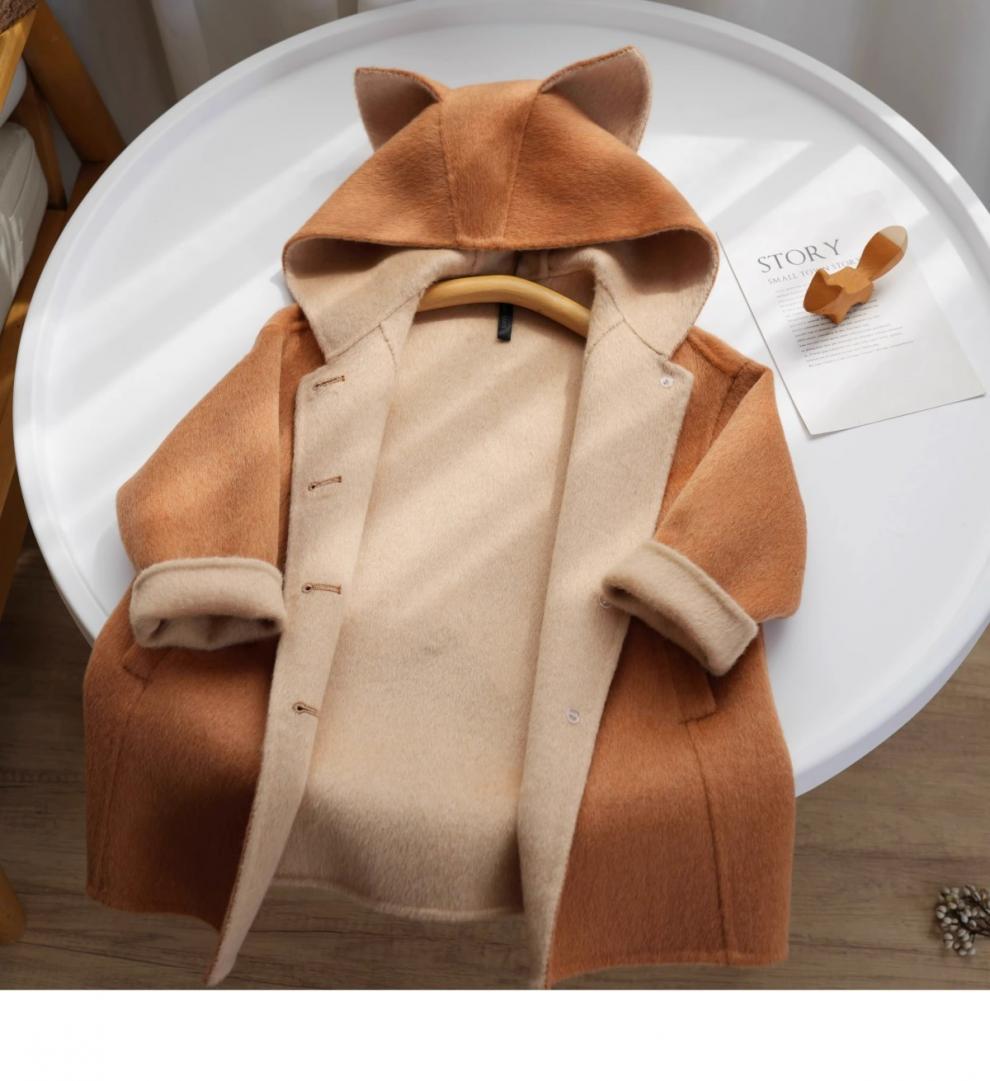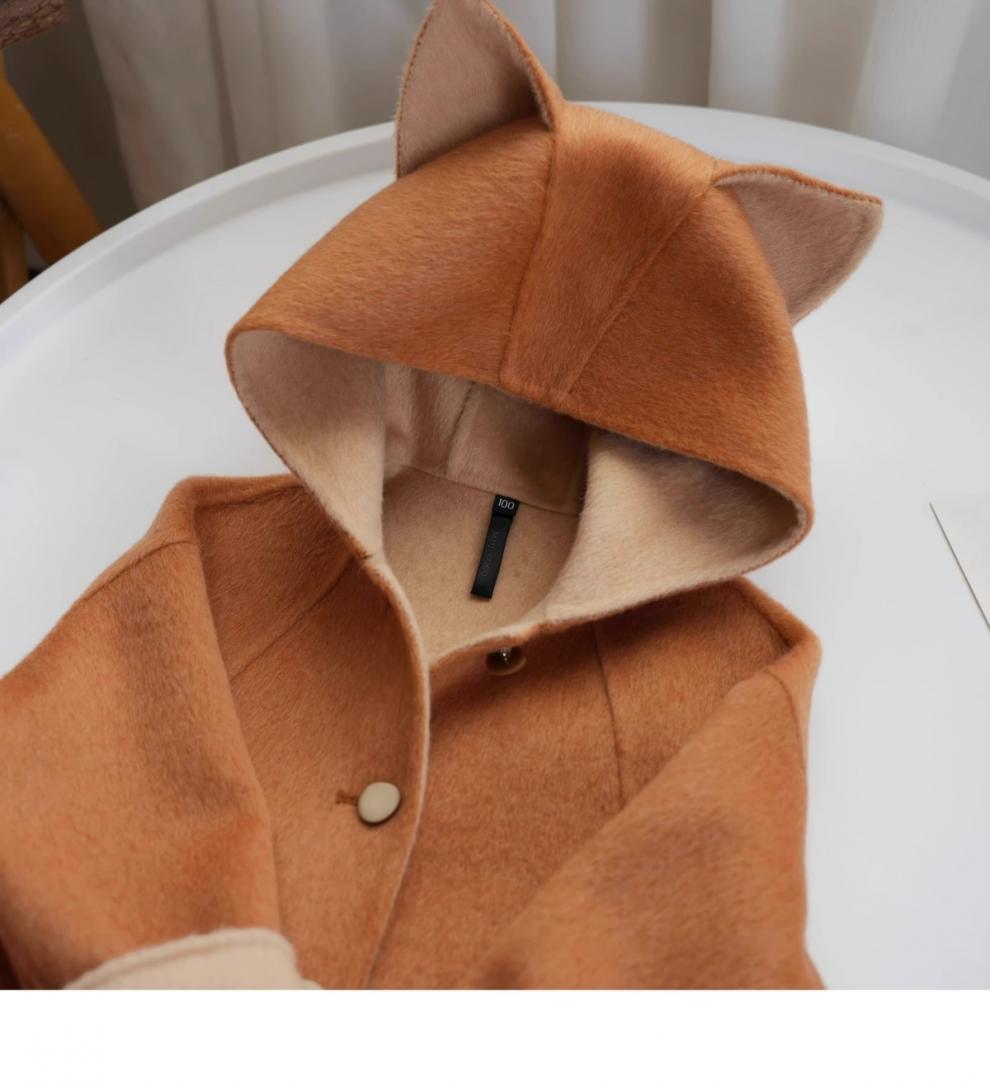 한국 아동복 2024 가을과 겨울 새로운 오렌지 만화 여우 후드 트위드 코트 소년 소녀 패딩 트위드 코트